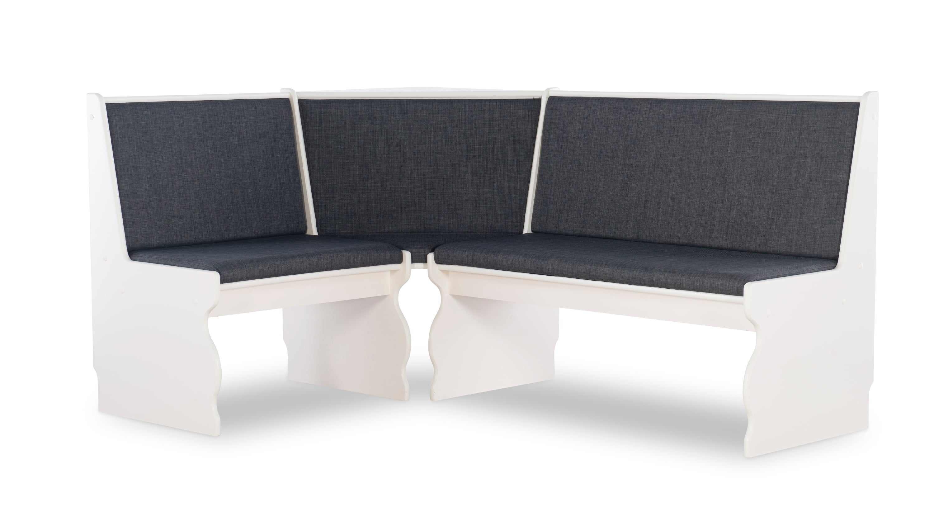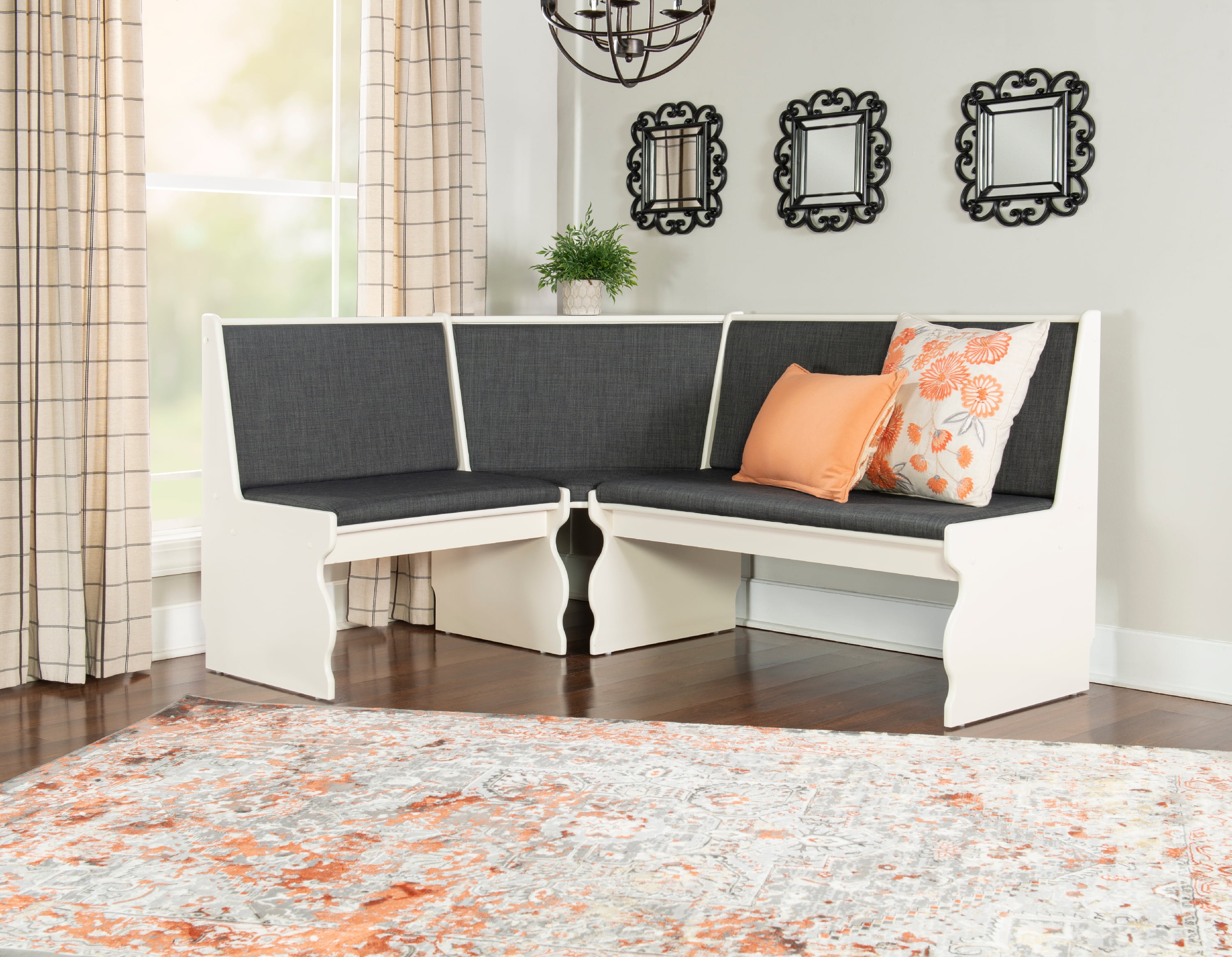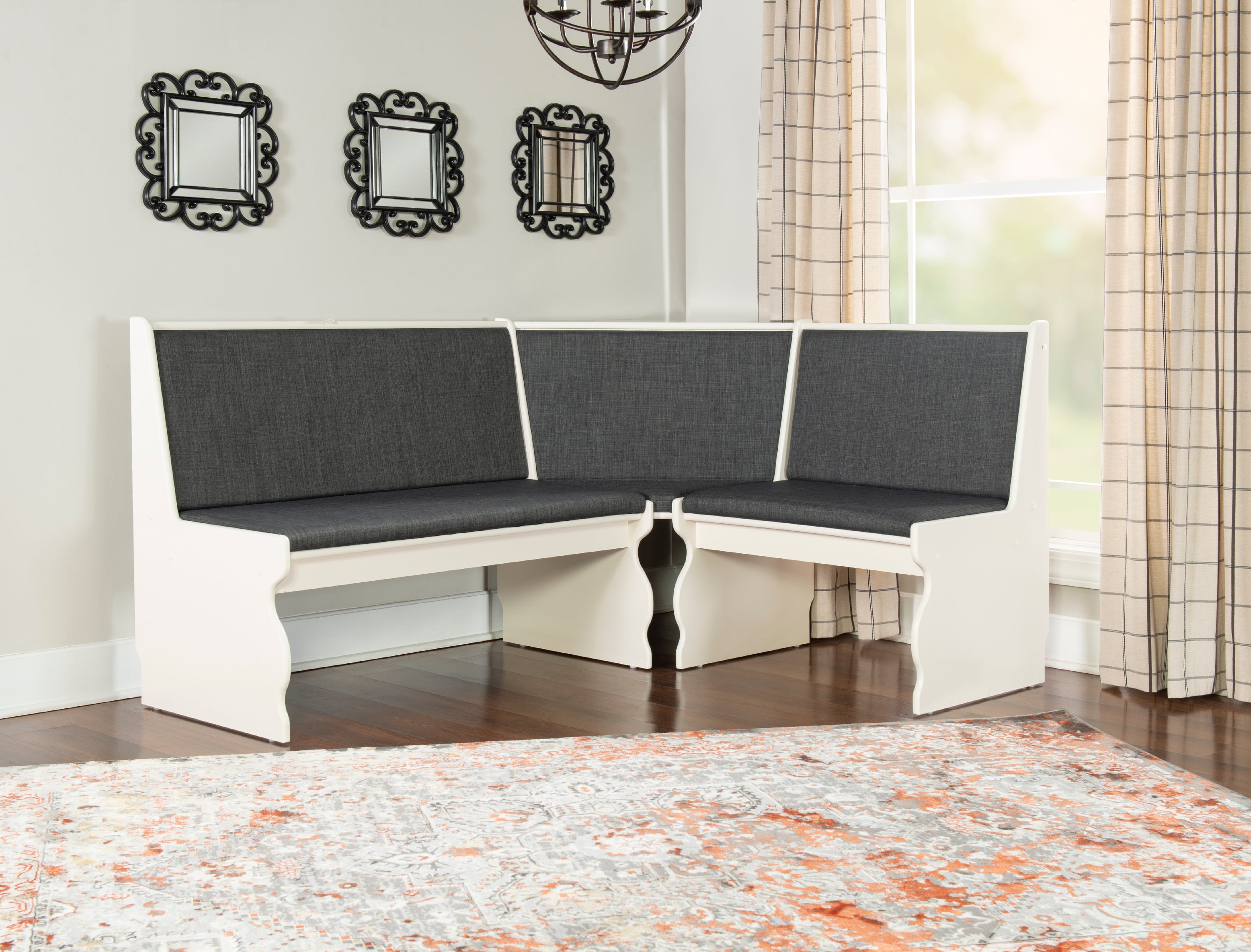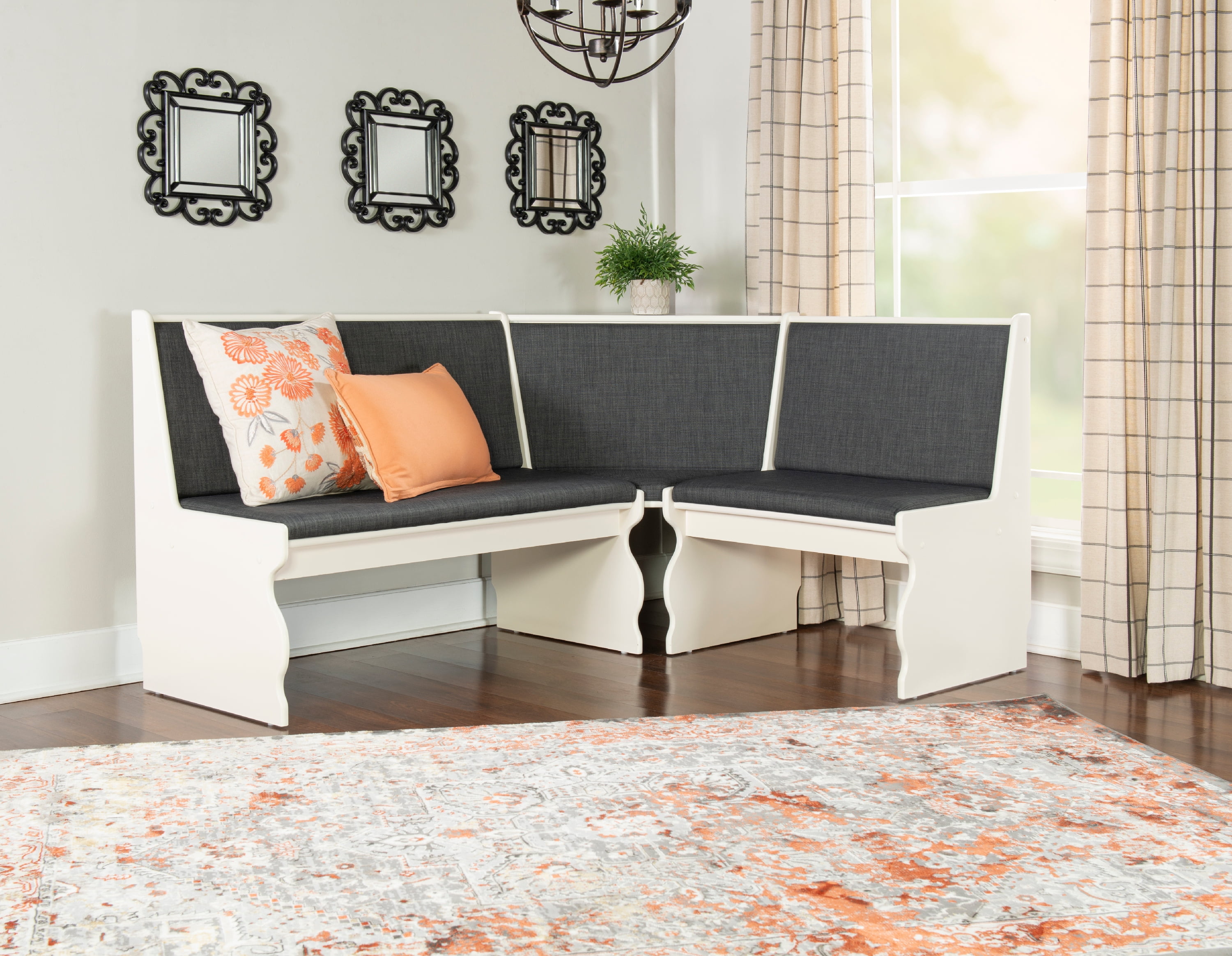 Linon Weston 3-Piece Farmhouse Indoor Corner Dining Nook with 5-Piece Cushion Set, White/Charcoal