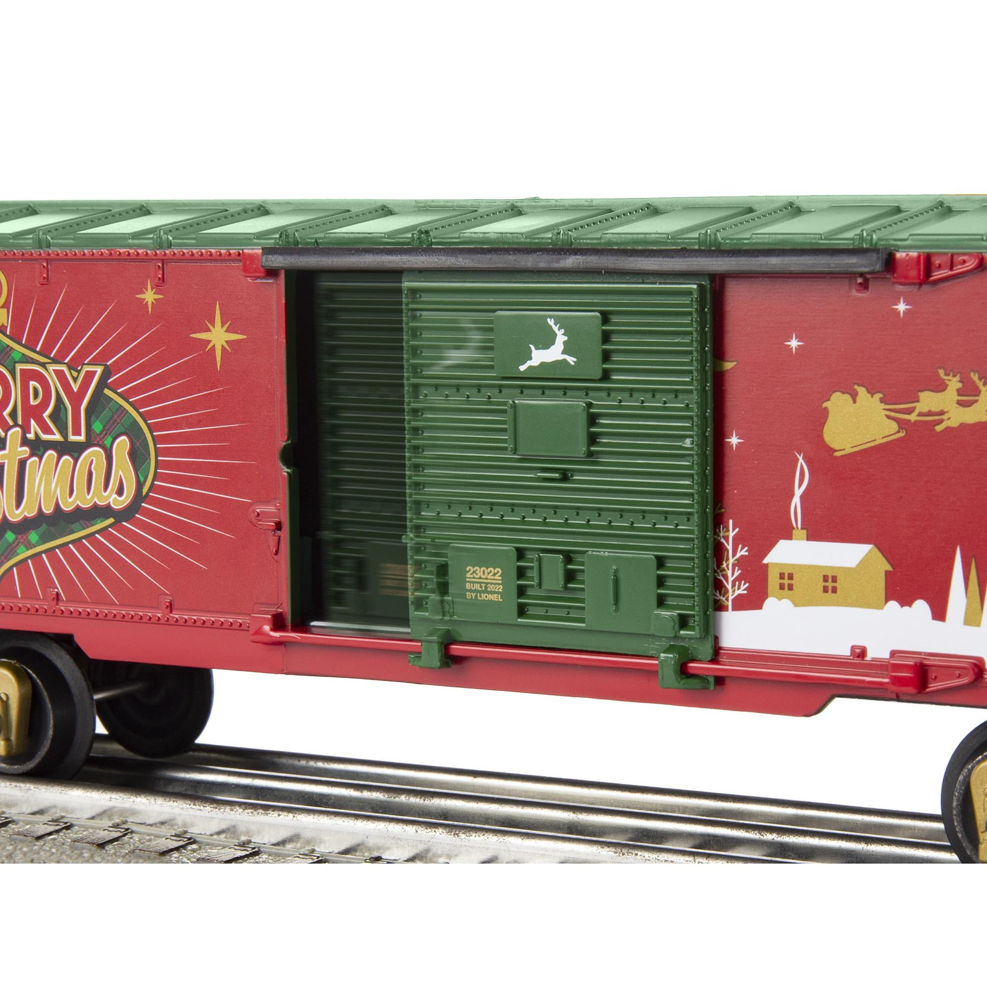 Operating headlight Powerful maintenance-free motor On/Off switch for smoke, chuff and sound Operating couplers Opening doors on boxcar Santa figure on maintenance car Illuminated caboose Electric locomotive controlled by included LionChief remote, LionChief Universal Remote (sold separately) or Bluetooth LionChief app Lionel Voice Control (LVC) – Run your locomotive by speaking commands into your phone via LionChief App Voice Streaming & Recording (VSR) – Record or live stream your own custom announcements via LionChief App RailSounds RC Sound System with steam chuffing and background sounds, whistle, bell, and user-activated announcements Forward and reverse speed control knob Three buttons to activate horn, bell, and special announcements Requires three AAA alkaline batteries (not included) Rail Line: Christmas Express Gauge: O Gauge Power: Electric Engine Type: Steam Min Curve: O31