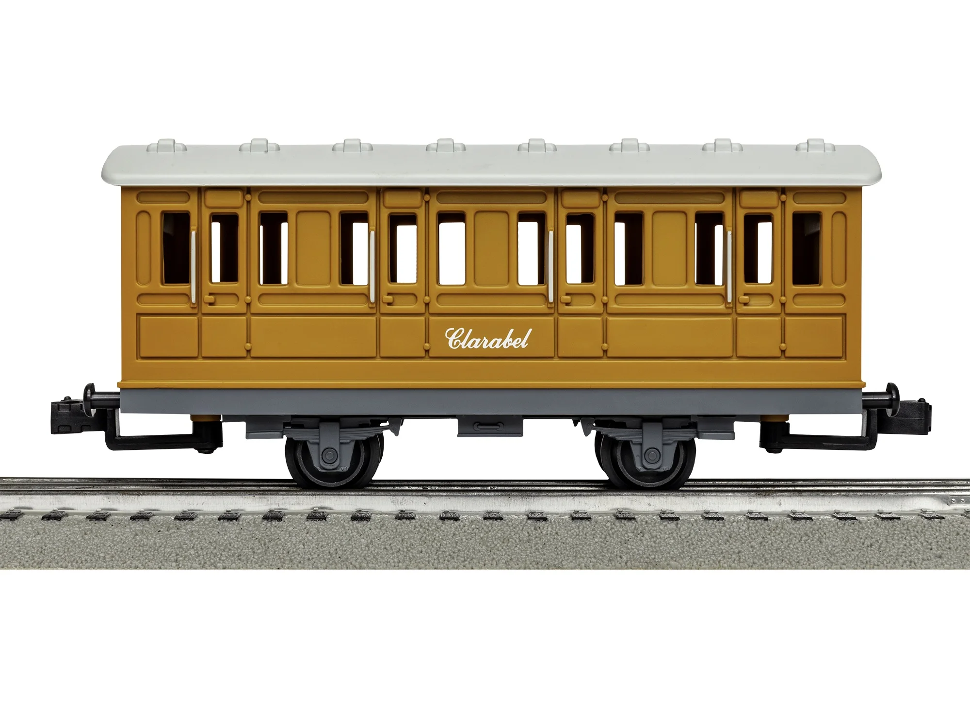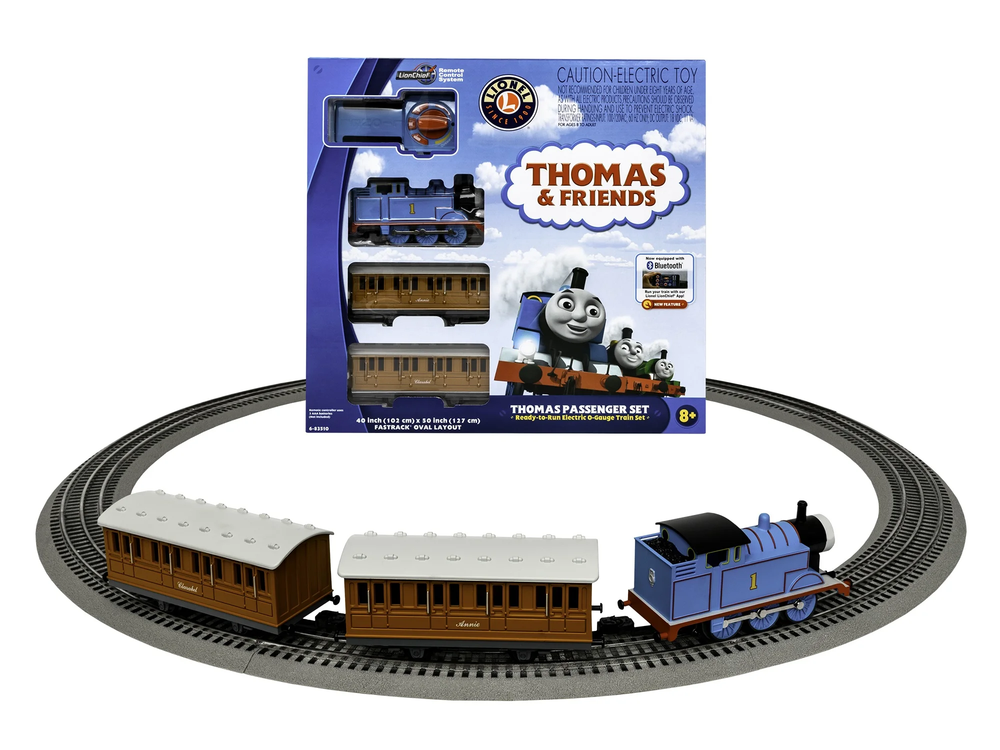SET INCLUDES: Thomas the Tank Engine Annie Car Clarabel Car (8) Curved O36 FasTrack sections (1) 10” Straight FasTrack section (1) FasTrack Terminal section Wall-pack Power Supply LionChief Remote for Locomotive (3) Interchangeable Thomas Faces Owner Manual LOCOMOTIVE FEATURES: Electric locomotive controlled by remote RailSounds RC Sound System with steam chuffing and background sounds, whistle, bell and user-activated announcements Lionel Voice Control (LVC) runs your locomotive by speaking commands into your phone via LionChief App On/Off sound switch Maintenance-free motor Smokestack of the Thomas & Friends Traction tire Operating coupler on rear of locomotive ROLLING STOCK FEATURES: Operating couplers LIONCHIEF REMOTE FEATURES: Forward and reverse speed control knob Three buttons to activate whistle, bell and special announcements Requires three AAA alkaline batteries (not included) PRODUCT SPECIFICATIONS: Gauge: O Gauge Scale Type: Traditional Power: Electric Engine Type: Steam Min Curve: O-27 Product Length: 21.00″ Dimensions: Layout: 40″ X 50″ PRODUCT NOTIFICATIONS: Train Set requires (3) AAA Alkaline Batteries for operation (not included) Phillips screwdriver required to access battery compartment on remote control (not included) Lubricate the wheels, axles, and linkage regularly to avoid squeaks and wear Wipe with a soft cloth occasionally after use to keep track and wheels free from dirt and grease Remove all batteries when the train will not be used for an extended period of time Recommended for ages 8 and up Assembly is required