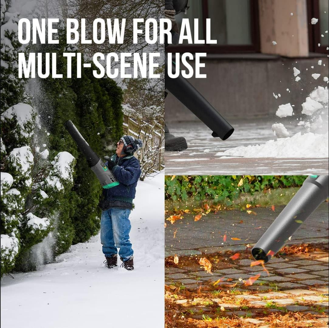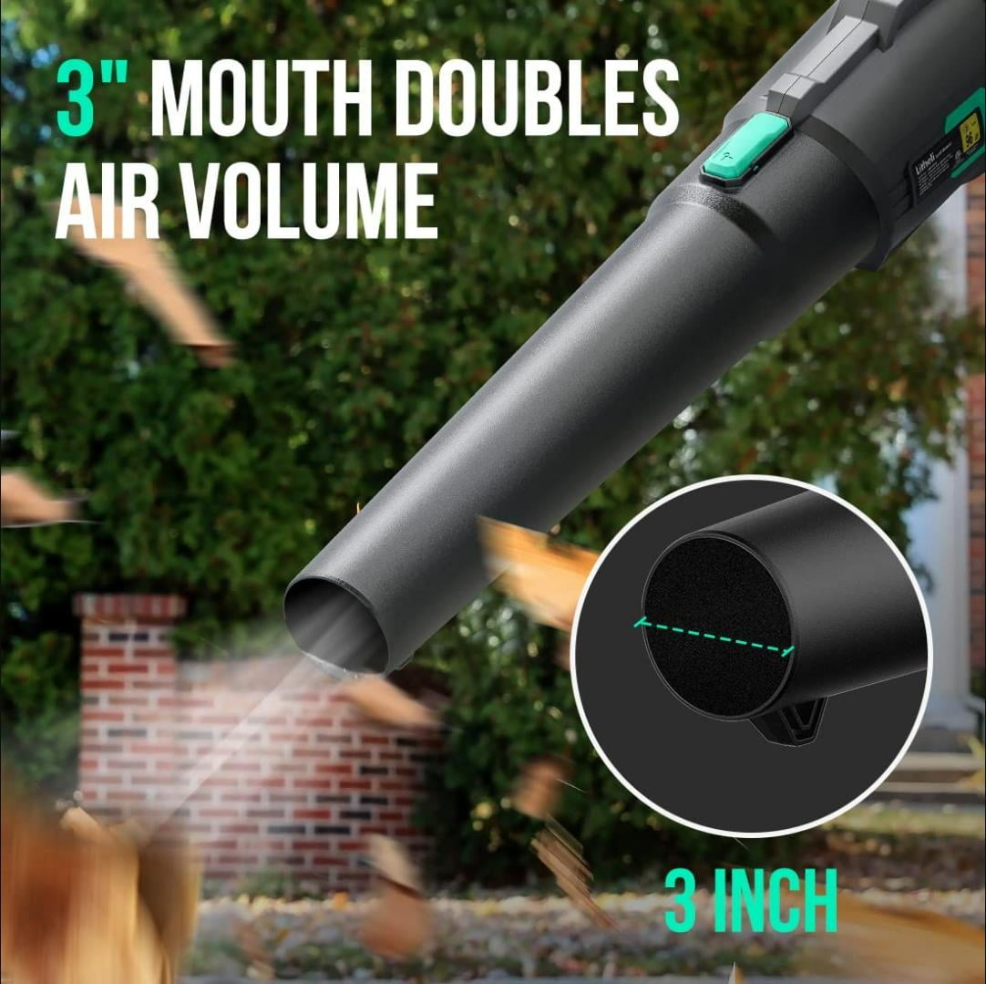 【Powerful Axial Turbine】The blowing speed is up to 85 MPH (125 ft/s) with max. air volume at 350 CFM, thanks to the upgraded axial turbine that generates the airflow with higher strength. 【Variable speed control】Instant activation and 0-350 CFM Variable speed control by rolling the dial on top of the rubber-covered handle. 【Ergonomics】Weighing merely 4.1 lbs, this blower greatly reduces burden on your arm. The turbine and battery compartment are ergonomically designed to reach ideal balance, so the tube can naturally point at a suitable downward angle when held in hand. 【Easy Assembly】This blower features a snap-on tube, super easy to install/disconnect for use and storage. Its tapered mouth concentrates the airflow better. 【Battery Share】This blower works without choking fumes, and can get to any job site without dragging cords behind. Its 40V battery works with all Litheli 40V power tools. For longer powering, you can purchase additional batteries. Click Here