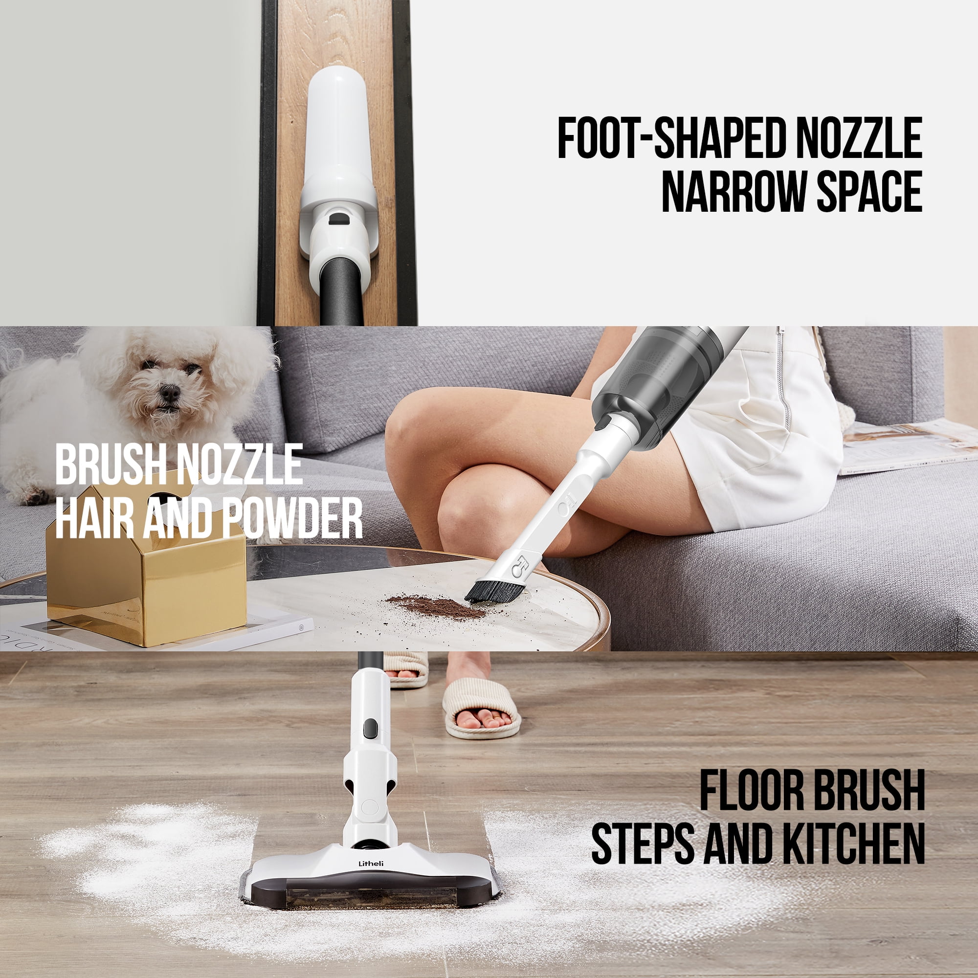 【Swappable Battery】Include 2 batteries,Smart U4 battery can be easily removed and recharged separately, liberating the stick vacuum mop from traditional port-charging. A single U4 battery supports working time up to 20 minutes (low-speed mode). Once pulled out, it can also work as a power bank to charge your phone. This battery is compatible with all products from Litheli U4 RIGEL, cordless hot glue gun, automatic trash can, etc. 【3 Brush Heads】The vacuum cleaner is equipped with 3 different brush heads for multi-scene cleaning needs, providing all-round cleaning for your home or car. With alternative foot-shaped nozzle and brush nozzle, it can easily access hard-to-reach areas, corners and crevices for deep cleaning. 【Lightweight & Convenient】Weighing only 3.55 lbs (with battery), the vacuum cleaner is a perfect helper for your cleaning routine. You can pick it up anytime, anywhere to quickly remove dirt, debris, dust, pet hair, and tough messes on the floor. For basic cleaning, the dust box only needs to be emptied once a week, making daily cleanup a breeze. 【Ultra-low Noise】Litheli battery-operated vacuum mop is super quiet in working with no harsh humming or whistling. Running at a volume as low as 65dB, this vacuum cleaner never disturbs you and your family during early morning or late night, quite soothing and friendly to ears. 【Perfect Gift】You’ll get 5-year tool warranty + 3-year battery warranty 1 x Vacuum Cleaner 2 x U4 battery 1 x Mop Base 1 x Mop Pad 1 x Brush Nozzle 1 x Foot-shaped Nozzle 1 x Extension Tube 1 x Wall Bracket 1 x Operator’s Manual.