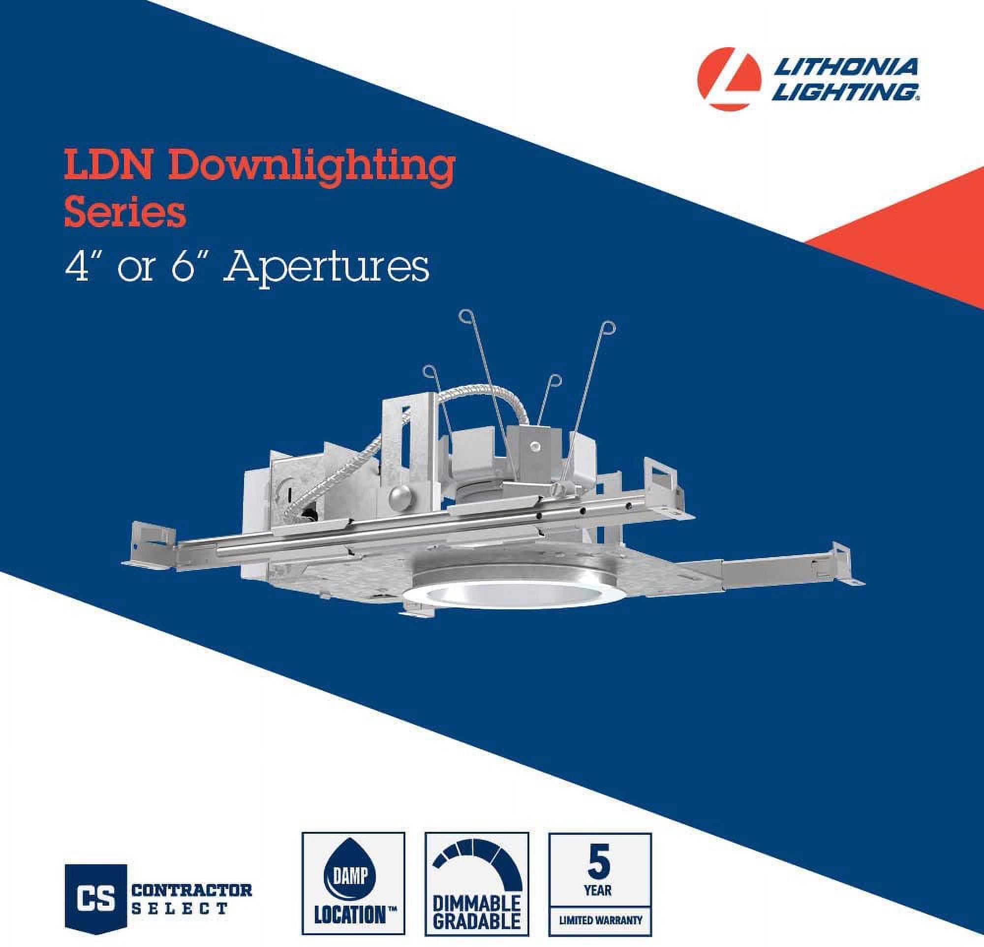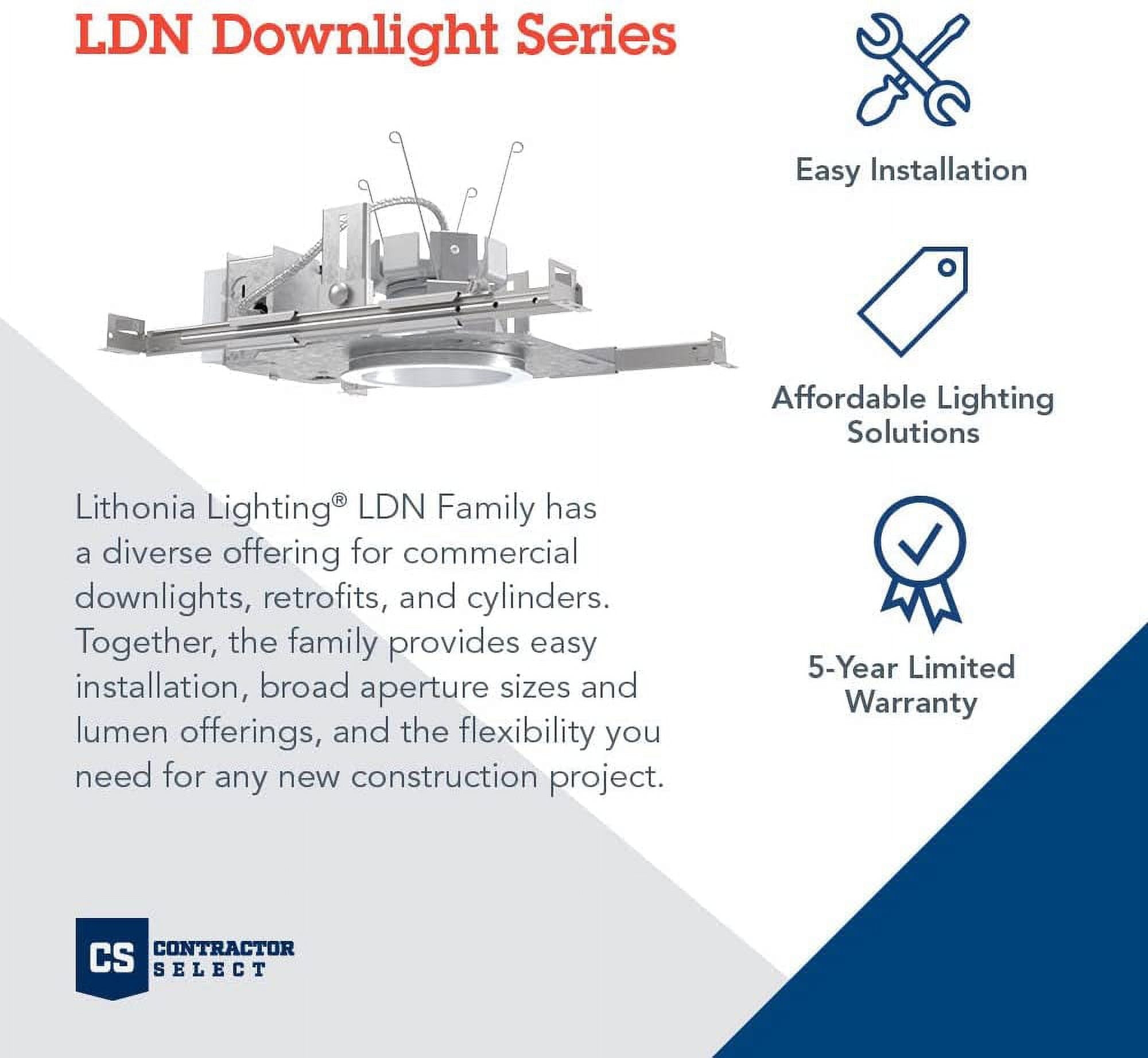 Perfect for corridors, lobbies, conference rooms, private offices, and any new construction. The LDN6 design allows for a glare-free ceiling at an affordable price Features With 55 degree cutoff, LDN6 allows for a quiet, glare-free ceiling without compromising on efficacy With over 85 lumens per watts, more than 60 percent less energy consumed with this dimmable LED downlight Available with nLight AIR capability for wireless control and connectivity Available in MVOLT (120-277V), 0-10V 10 percent dimming available, and includes vertically adjustable mounting brackets with commercial bar hangers provide 3-3/4 in. total adjustment Housing is not rated for insulated ceilings Constructed of steel Integrated LED lighting Capable of being dimmed with a compatible ELV dimmer switch UL rated for wet locations Energy Star certified Covered under a 5 Year Limited manufacturer warranty Dimensions Trim Size: 6″ Height: 10-7/8″ Width: 12-7/8″ Depth: 6-7/16″ Product Weight: 5 lbs Cutout Size: 6″ Electrical Specifications Lumens: 2000 Color Temperature: 3500K Color Rendering Index: 80 CRI Wattage: 22 watts Voltage: 120 and 277 volts Average Hours: 60000