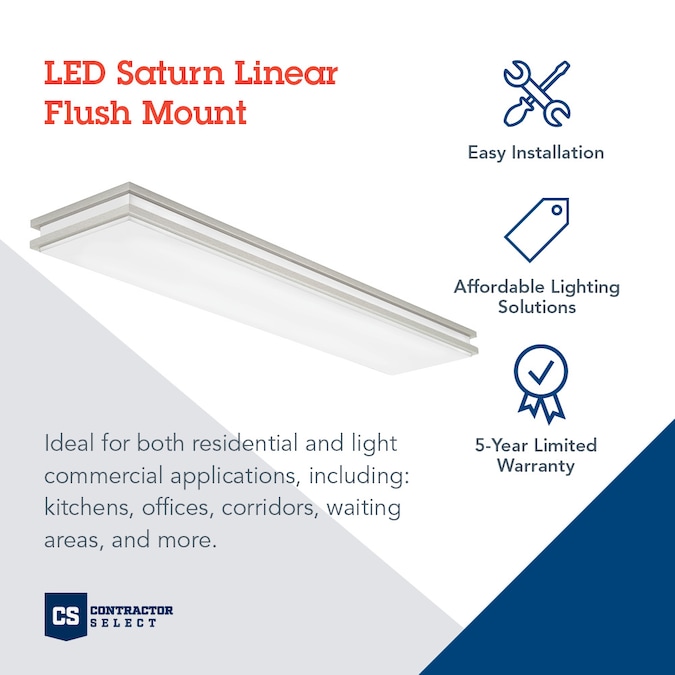 The LED Saturn Linear Flush Mount offers general ambient lighting from a decorative flush mount fixture. The LED engine delivers a long life of energy savings and reduced maintenance. With finishes in brushed nickel and bronze, this fixture is versatile and will look great in a variety of spaces.