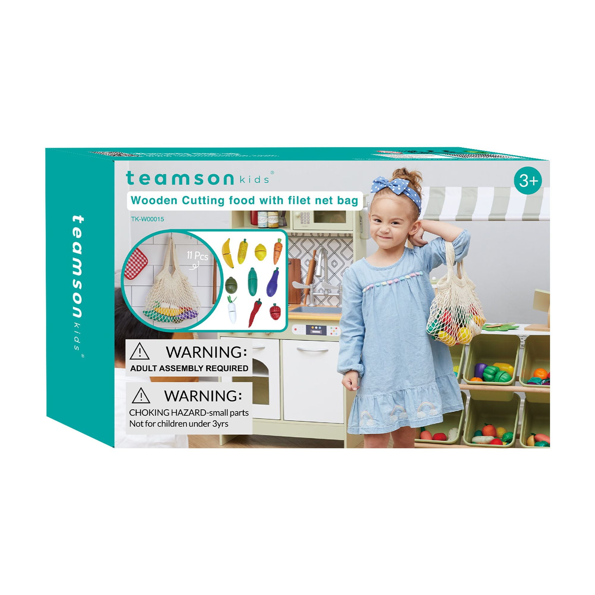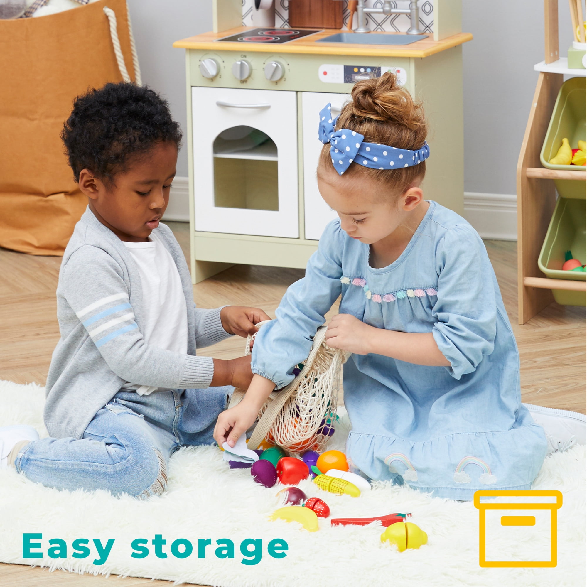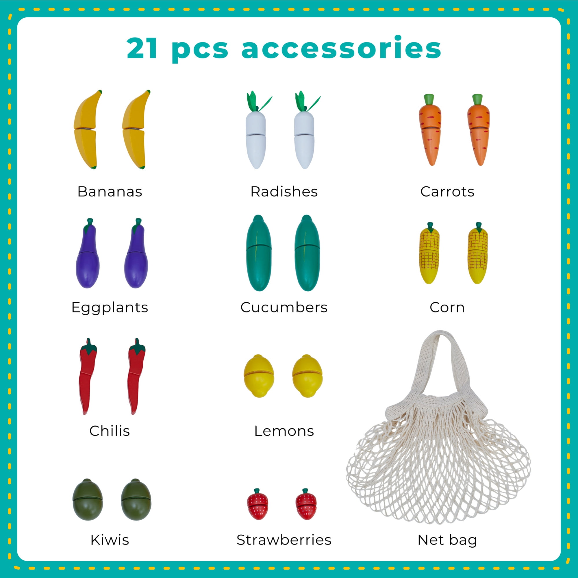 10 wooden play foods included: a banana, cucumber, kiwi, strawberry, lemon, radish, eggplant, corn, chili pepper, and carrot Pretend food easily separates into two pieces Comes with white filet net market bag Helps teach kids the concepts of parts and whole Suggested for children 3 years and older
