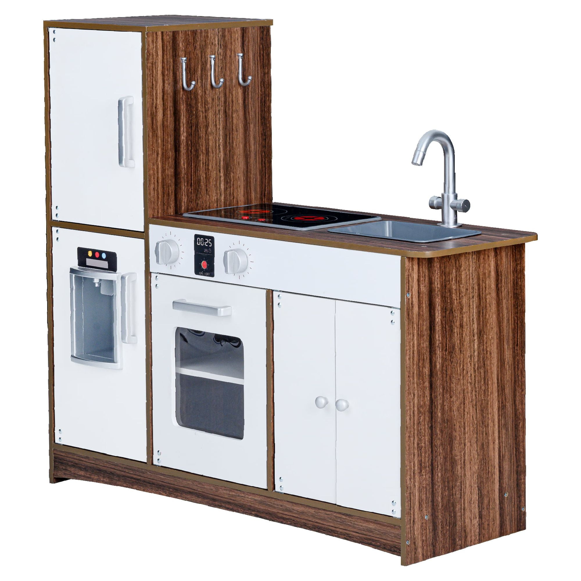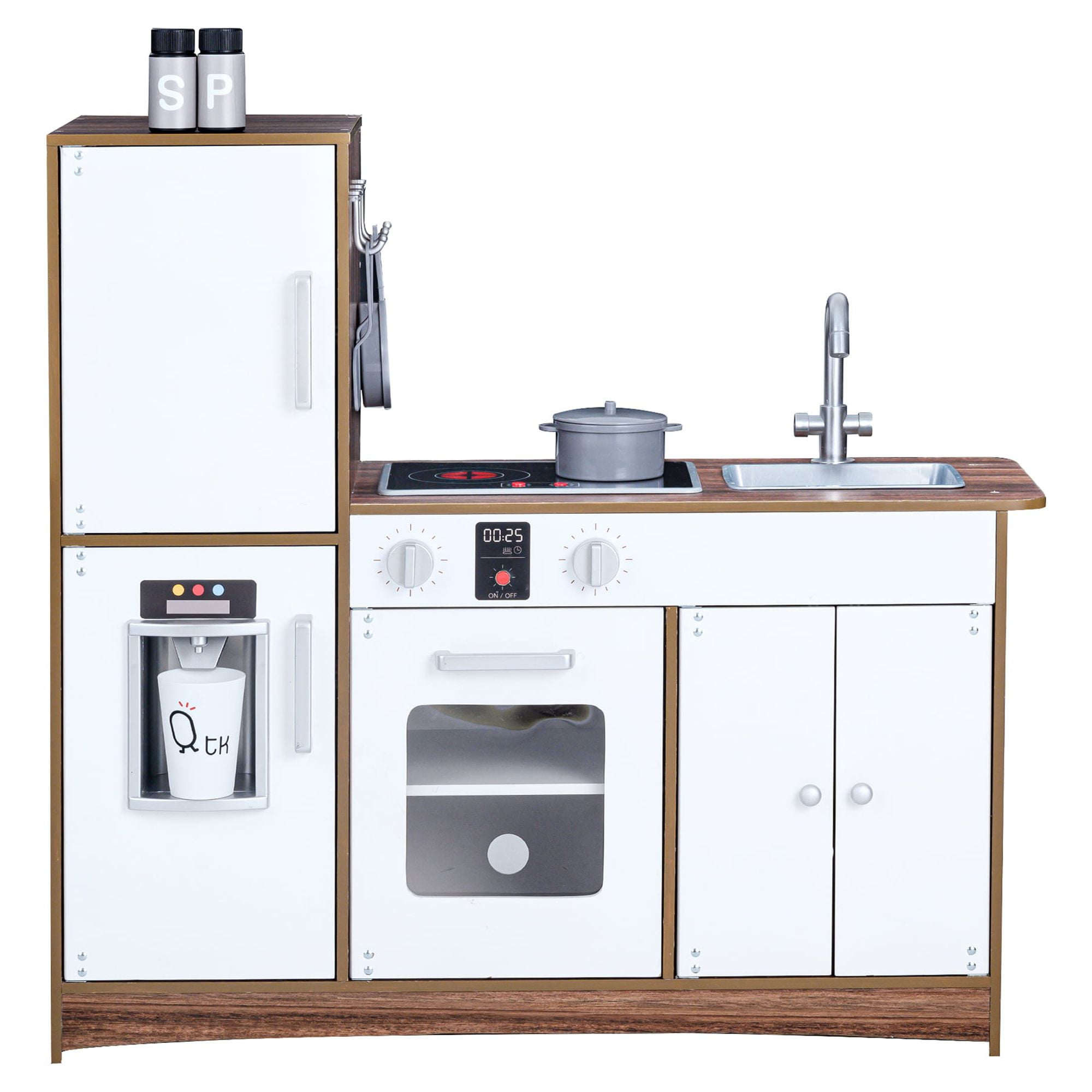 Give your little ones a kitchen of their own with the Teamson Kids Little Chef Palm Springs Classic Kids Play Kitchen with 6 Accessories. This retro-style play kitchen is designed with a natural wood finish and white accents, making it great for both boys and girls, and it completes any home, classroom, preschool, or daycare playroom. The functional and interactive design features openable oven doors, a refrigerator, 2 turning oven knobs, 2 induction burners that make realistic cooking noises and glow red, an ice maker, a sink, and an under-sink cabinet to enhance your little one’s play time. With 10 included accessories – a pan, pot, 2 spatulas, 2 spice bottles, 3 plastic ice cube, and a cup included– this toddler kitchen encourages role play and lights up your little chef’s imagination and creativity. The durable and eco-friendly construction is kid-safe and easy to wipe clean with a damp cloth for every day messes. The easy-to-follow instructions allow for quick adult assembly so play time can start right away. This kid-sized toy kitchen has a compact size and is recommended for children ages 3 years and up. Induction cooker requires 2 1.5V AA/LR6 batteries (not included).
