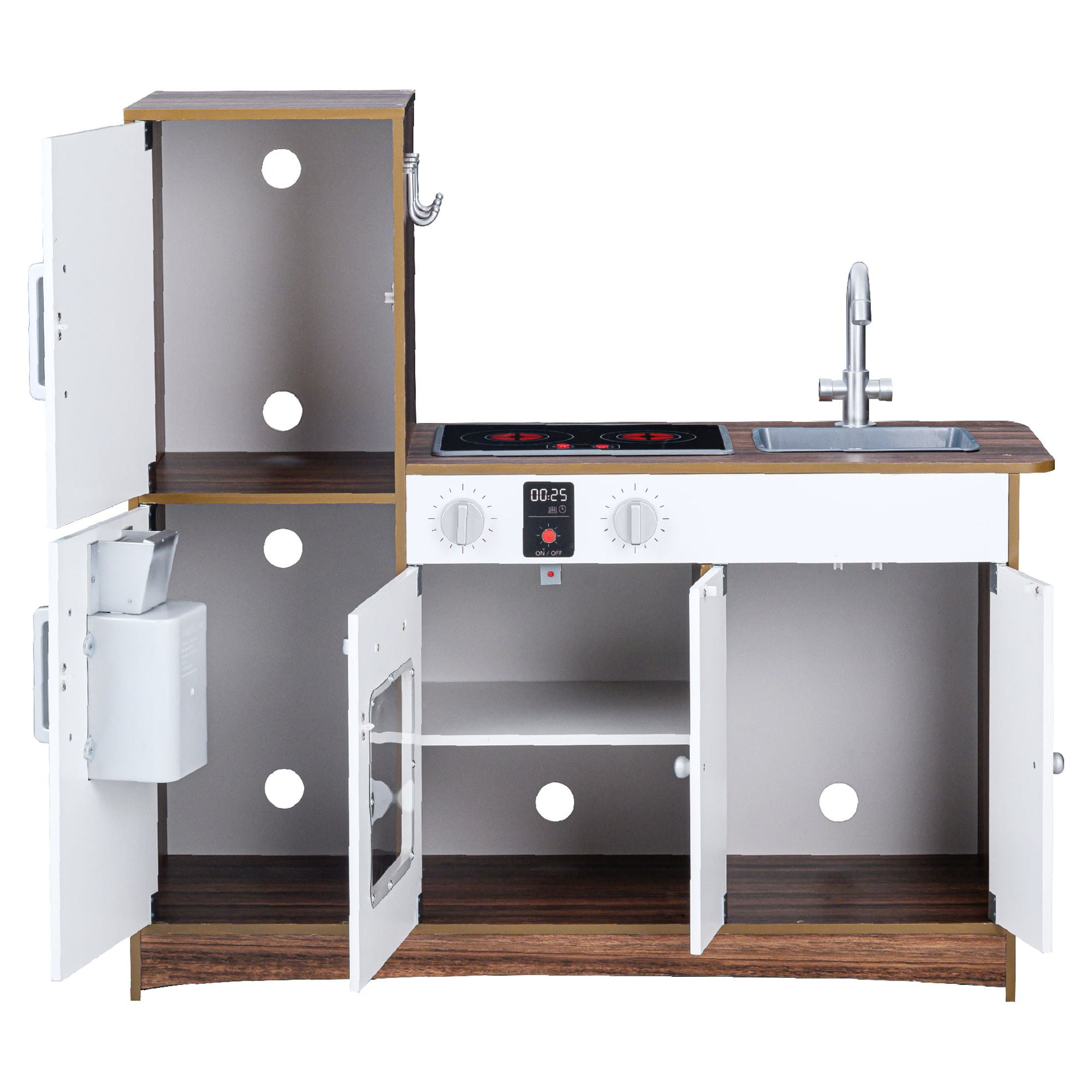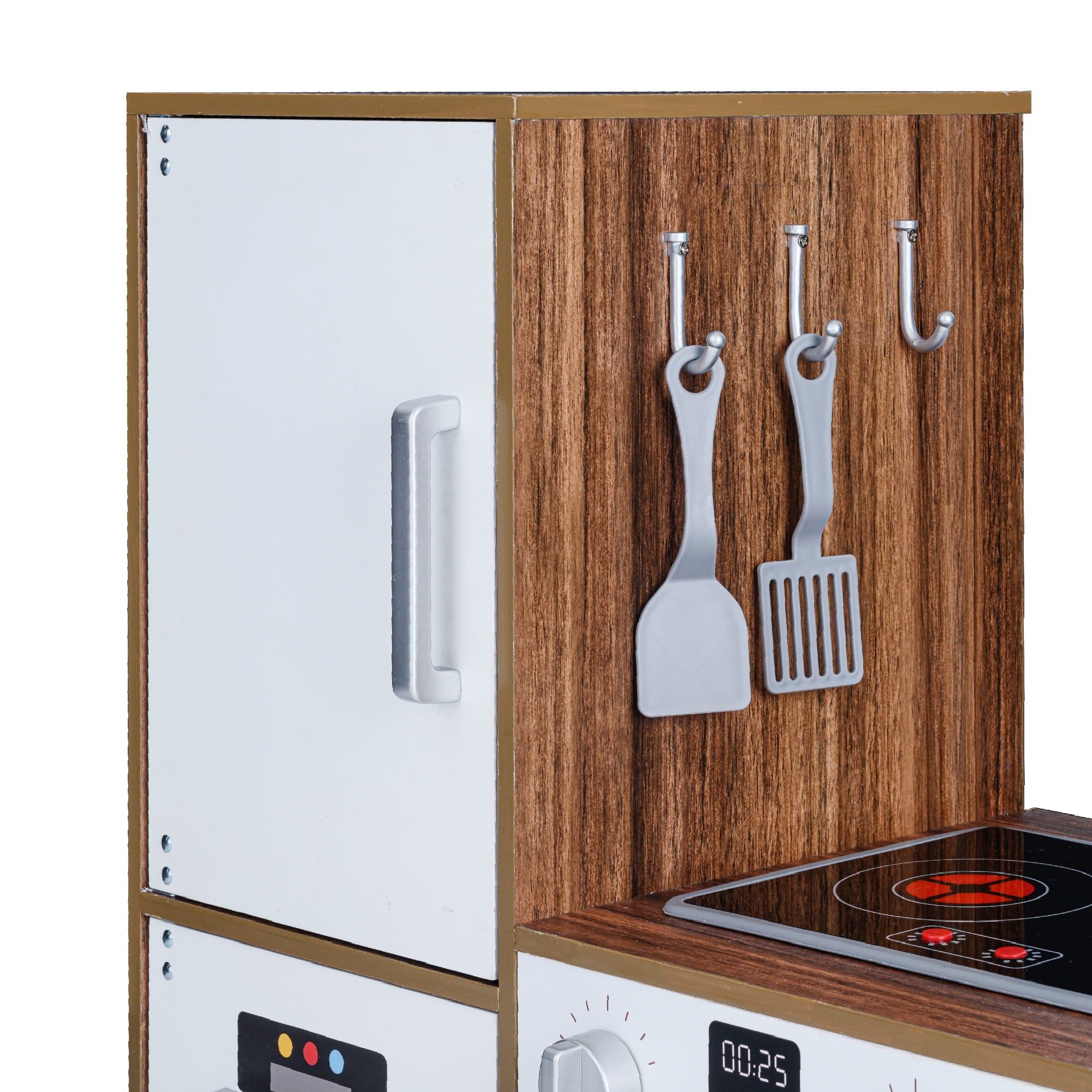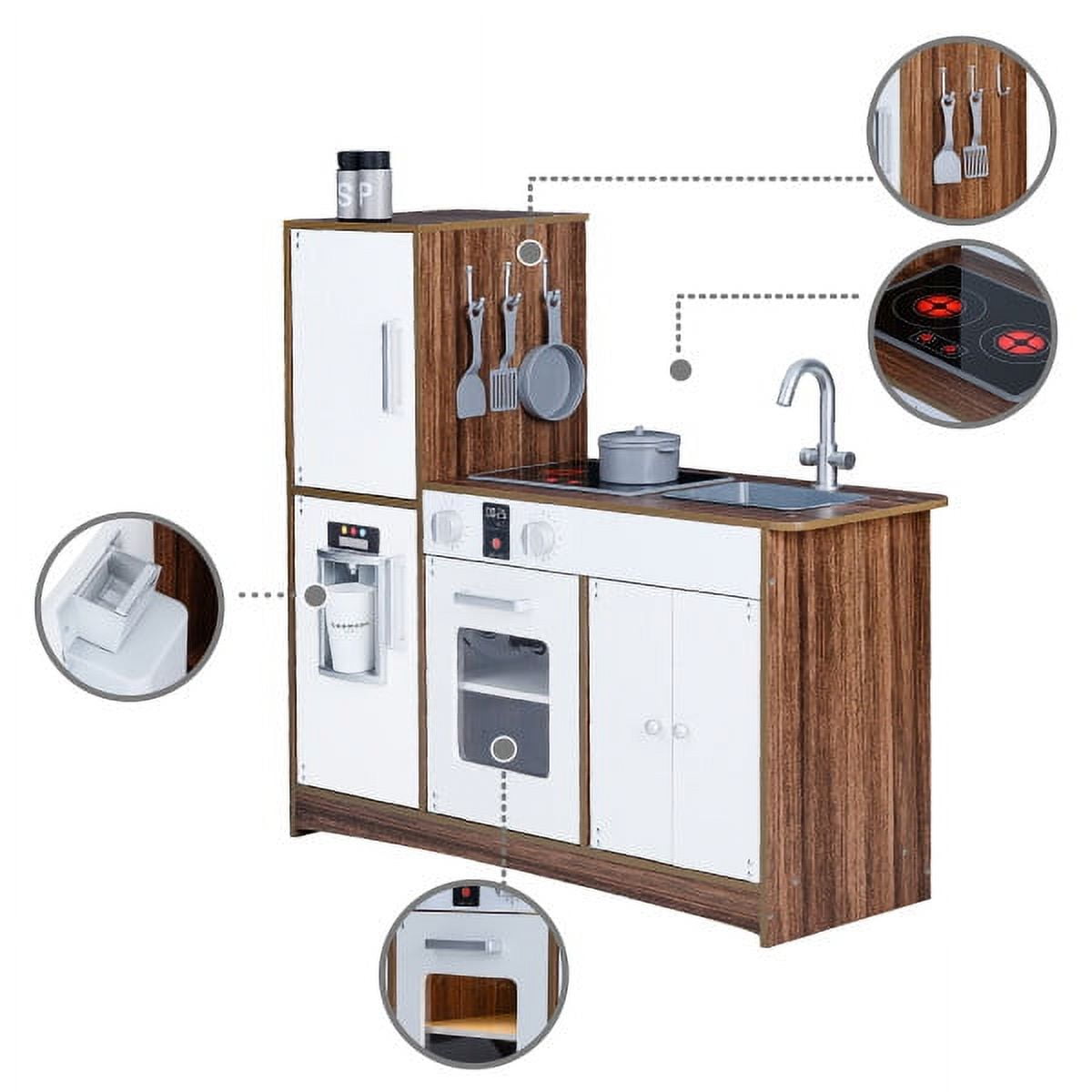 HIGH QUALITY, STABLE, SAFE: Made of sustainable MDF(Medium-density fibreboard), complying with CPSIA(Consumer Product Safety Improvement Act) for your kids to play and read in safe environment. 10 plastic accessories: Pan, pot, 2 spatulas, 2 spice bottles, 3 plastic ice cube, and a cup included Electric Induction cooker with light and sound effect Light-up stove with boiling, sizzling sound effects (requires two AAA batteries, not included) Dimensions: 23.5″ L x 11.5″ W x 32.76″ H