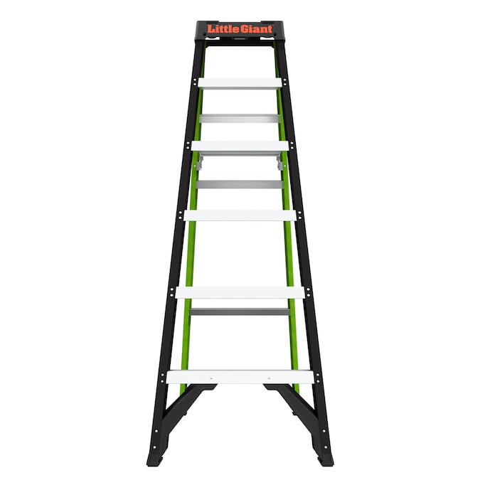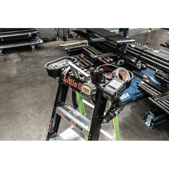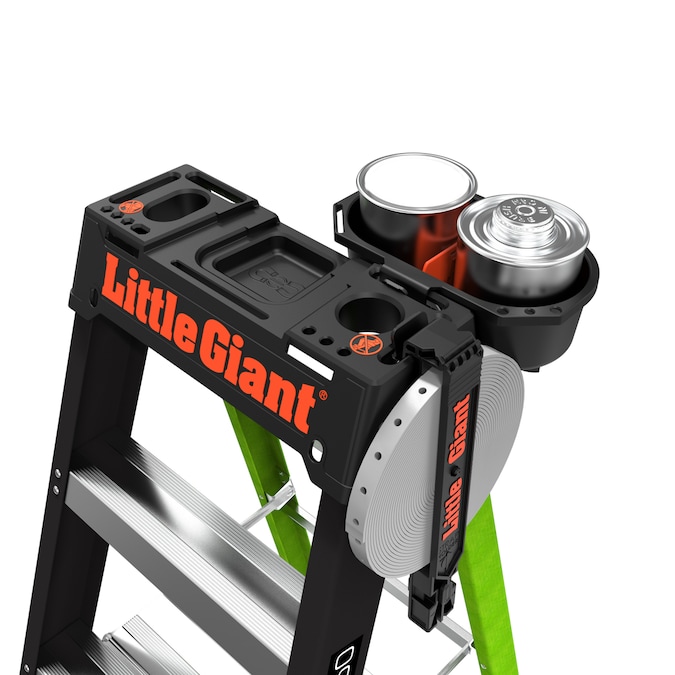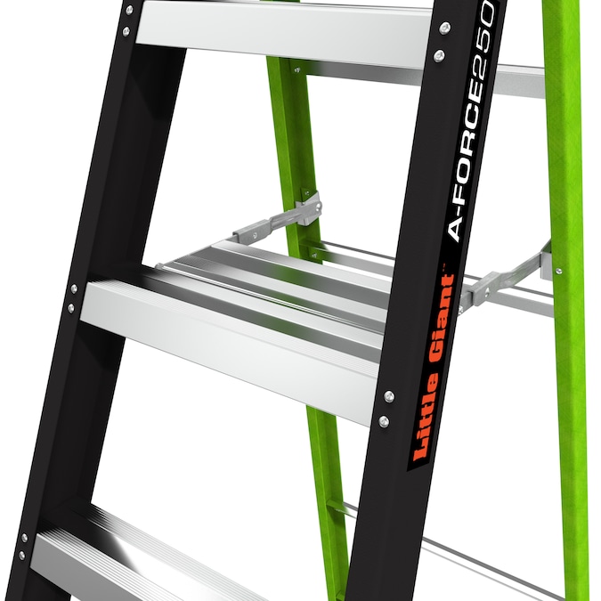 The A-Force250™ from Little Giant® sets up quickly, transports easily, and performs like a pro. With a patent-pending spreader step, versatile workstation top cap, and sturdy full-boxed steps, this stepladder keeps you comfortable and safe at height. The A-Force250 meets or exceeds all OSHA and ANSI standards, and is rated Type I to hold 250 lbs. Easy setup with built-in comfort. The patent-pending spreader step reduces foot fatigue and gives you an additional five inches of standing space. It also acts as a hand hold for opening and closing the ladder with a single, simple motion. Four ports on the sides and rear of the top cap accept compatible Little Giant accessories, such as the Loot Box™ or Strap Holder. Add a few drill bit holders, clip slots for drills and tape measures, friction locks for gallon and quart cans, and a magnetic fastener tray, and you’ve got a full top cap workstation. The A-Force250’s anti-slip feet are made for various worksite terrains and use a brace design for extra stability. Made from a lightweight, two-tone fiberglass, this stepladder lets you work fearlessly around electricity.