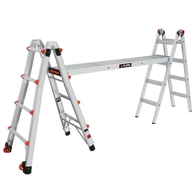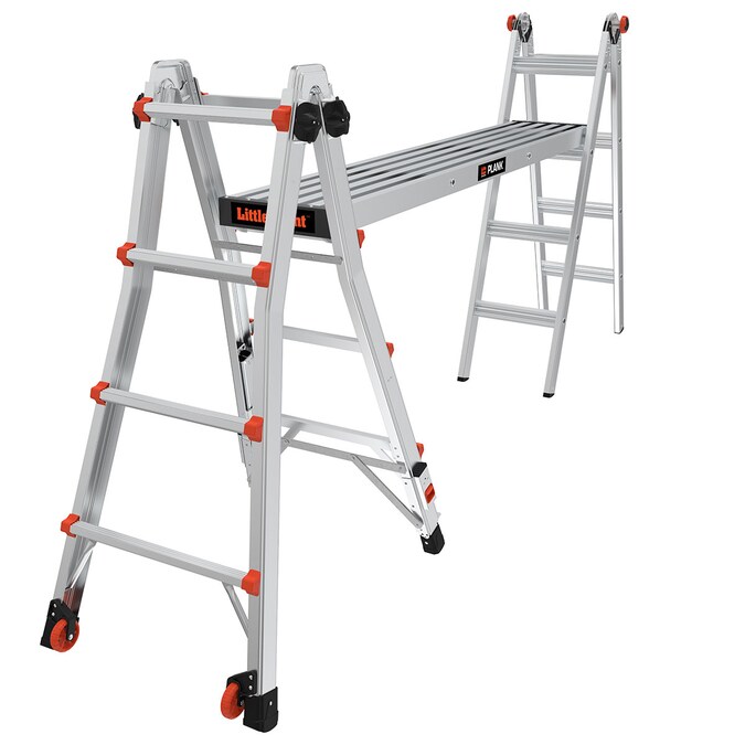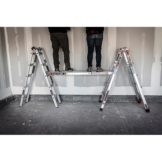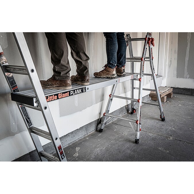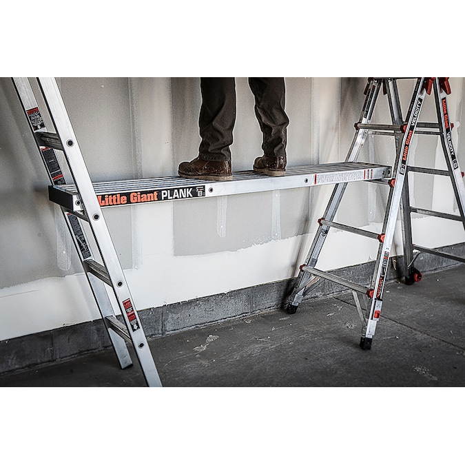 The Little Giant® Plank™ accessory turns your multi-position ladder into a two-person trestle-and-plank scaffolding system when you attach Trestle Brackets™ to your ladder. The plank’s hooks secure to the ladder rungs of the inner and outer section of your ladder to give you a comfortable, solid platform to stand on while you paint, hang drywall or install light fixtures. With the plank, you can replace expensive and labor-intensive scaffolding systems in a fraction of the time.v The plank is available in 6’, 8’ and 10’ lengths, and is certified as a two-person ladder with a load capacity of 500 lbs. made from a lightweight aluminum material, the plank is light enough to transport and durable enough to support you while you work.