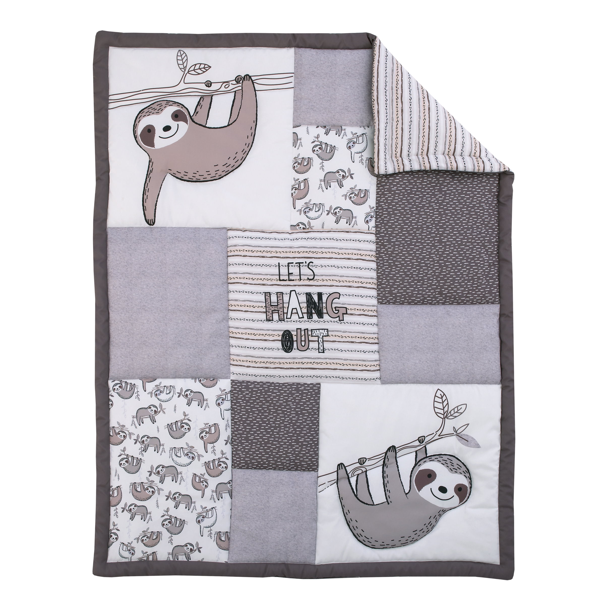The Sloth Let’s Hang Out 3pc Crib Bedding Set includes a comforter, crib sheet and matching dust ruffle The comforter features smiling slow moving sloths hanging out in the tree tops. The crib sheet is an allover print of sloths and the dust ruffle is solid grey The Let’s Hang Out group is beautifully designed in shades of cool greys, white and charcoal grey with touches of taupe This patchwork pattern features sloths, mixed with allover prints accented in pinstripes with the saying “Let’s Hang Out” front and center The fabrics are made of super soft fabrics and fits a standard size crib mattress 28″ x 52″. The Sloth Let’s Hang Out 3pc Crib Set is a gender neutral design perfect for any nursery