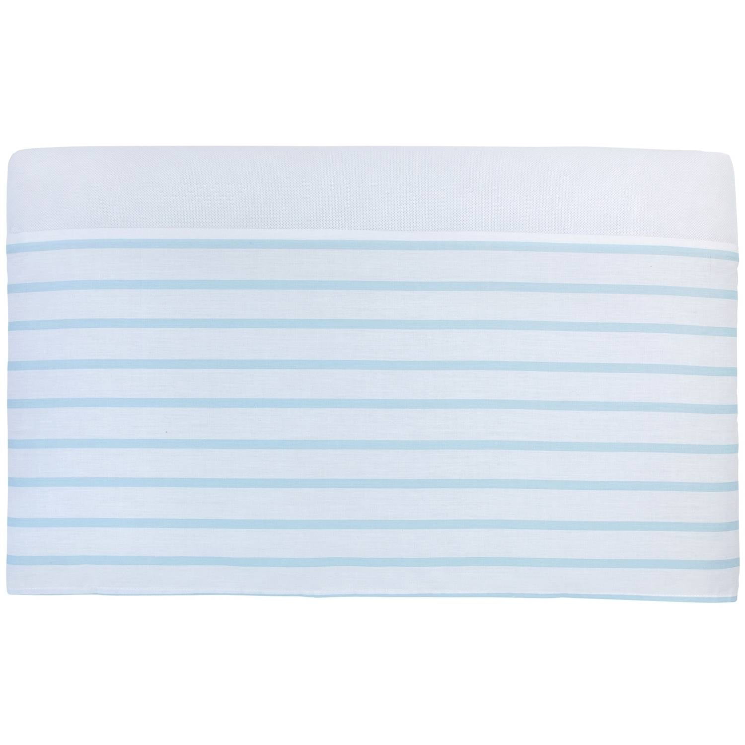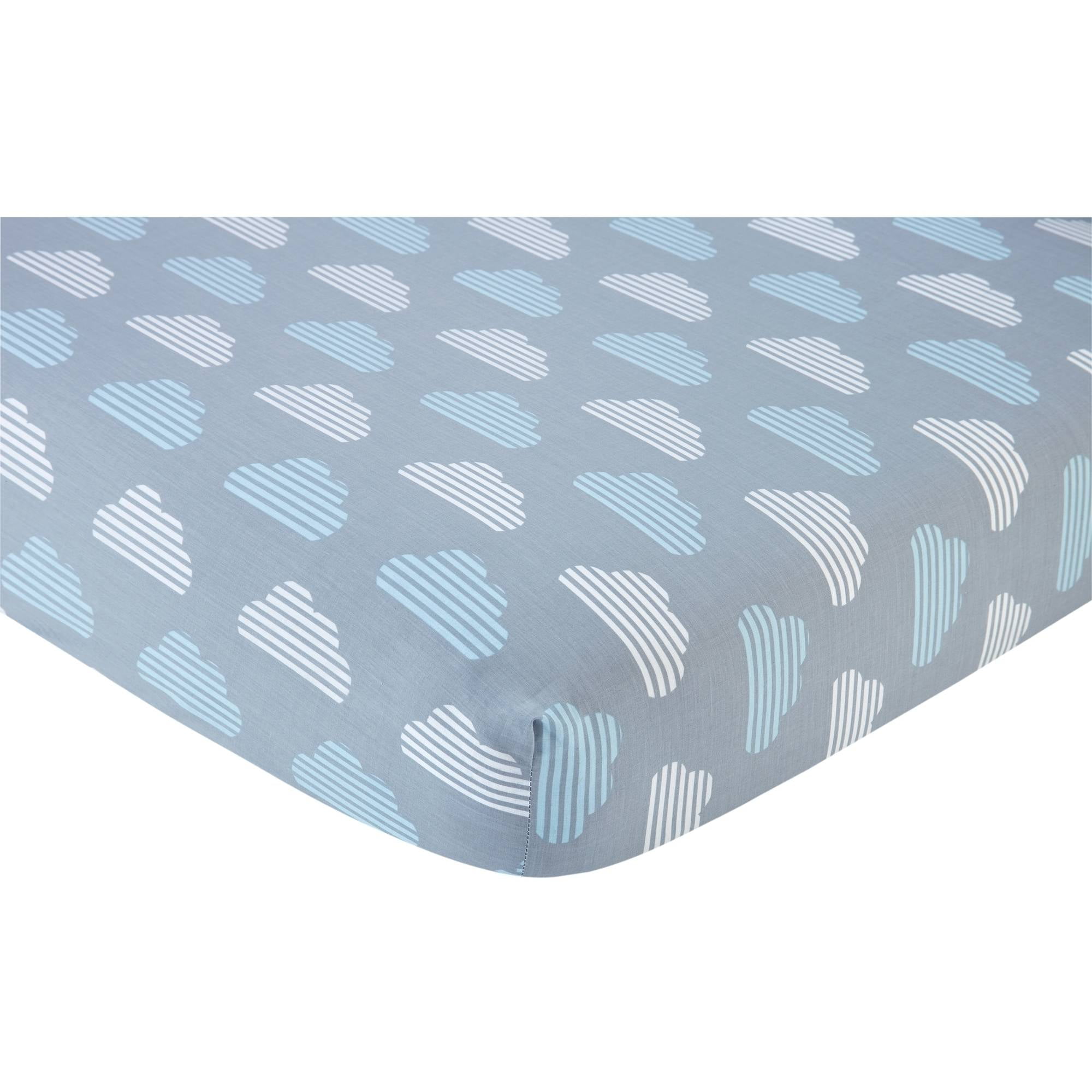 Let the love sprinkle down with the Little Love by NoJo Happy Clouds 5pc crib bedding set! The convenient set includes an appliqued comforter, 2 crib sheets, dust ruffle and wire wall decor. he comforter features a pieced background of blue and white stripes, grey and blue raindrops and blue and white clouds, all accented with an appliqued blue plush cloud. The two fitted crib sheets are two different patterns – one is a light blue and grey raindrop pattern, the other is a striped cloud print on a grey ground. Finish the room with the matching shaped wire wall decor, in the shape of two clouds. All bedding fabric components are 55 percent cotton/45 percent polyester, for a soft feel and easy care. The pefect choice for your little boy’s nursery!