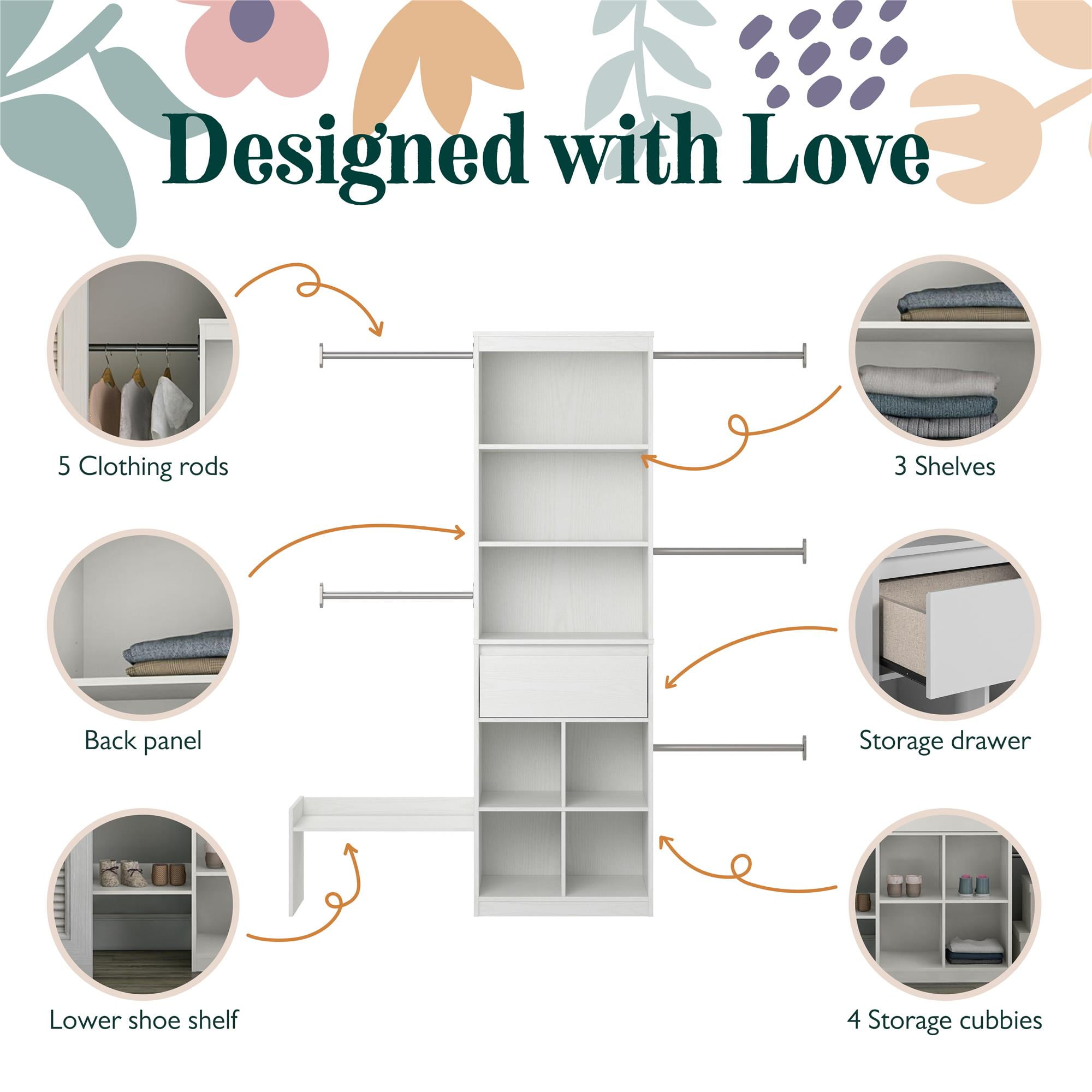 The dream is finally coming true! You’re finally ready to move into your very first place – the perfect space for your children to live, love, laugh and grow with plenty of kids’ closet storage for all their clothing and accessories. Plenty of space that is, until your little ones are big enough to choose their own outfits and promptly turn their closets into disaster areas when they can’t easily reach their clothes. Enter the Max & Finn Grow with Me Adjustable Kids’ Closet Organizer System! This kids’ closet organizer was created with adjustable clothes poles to grow with your child as they get taller, plus a lower shoe rack that can be attached on either the right or left side to fit into most kids’ closets. The 3 shelves (1 adjustable for your child’s height) offer plenty of open storage. The drawer features metal drawer slides with built in stops for safety, while the 4 lower cubbies are perfect for shoes, toys or fabric storage bins (not included). This kids’ closet organizer meets or exceeds the CPSIA Juvenile testing requirements and includes a wall anchor kit to ensure your child’s safety. Max & Finn not only creates this and many more on trend baby to teen furniture pieces, we also partner with various environmental protection programs to protect pollinator and other wildlife habitats for future generations.