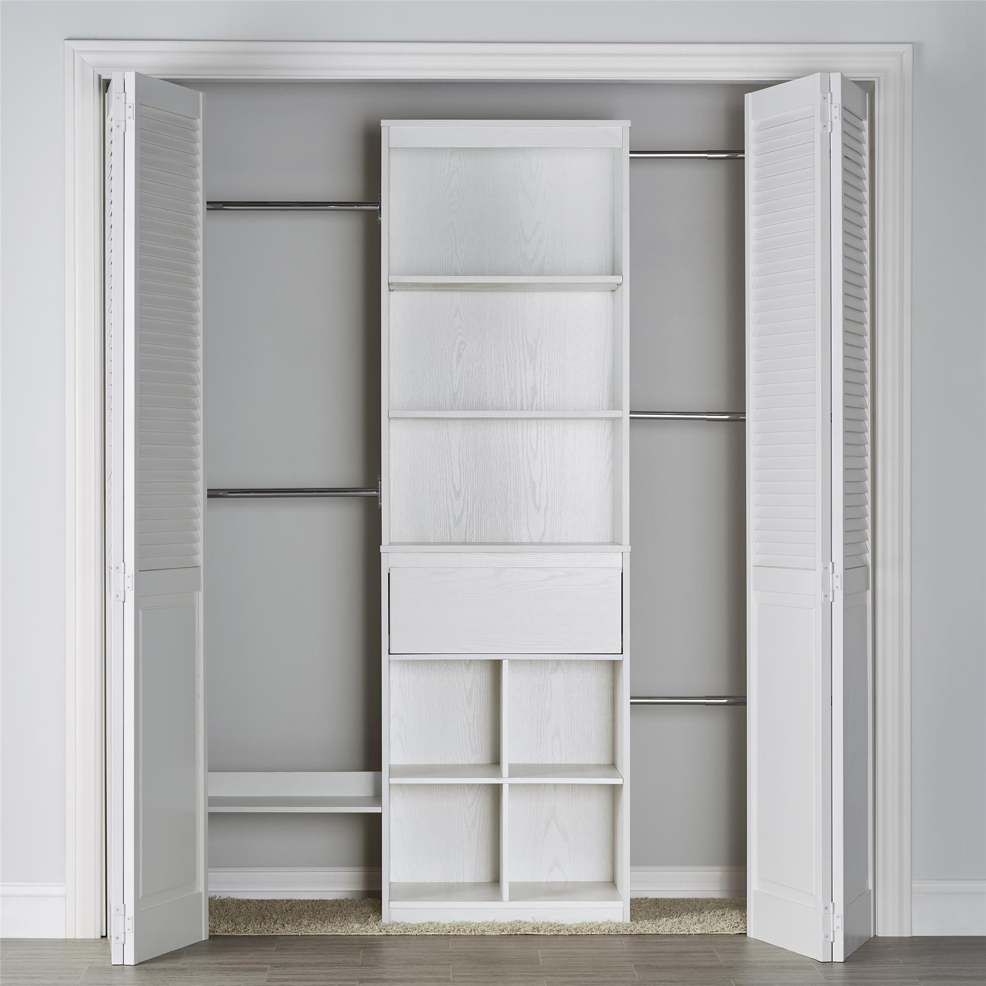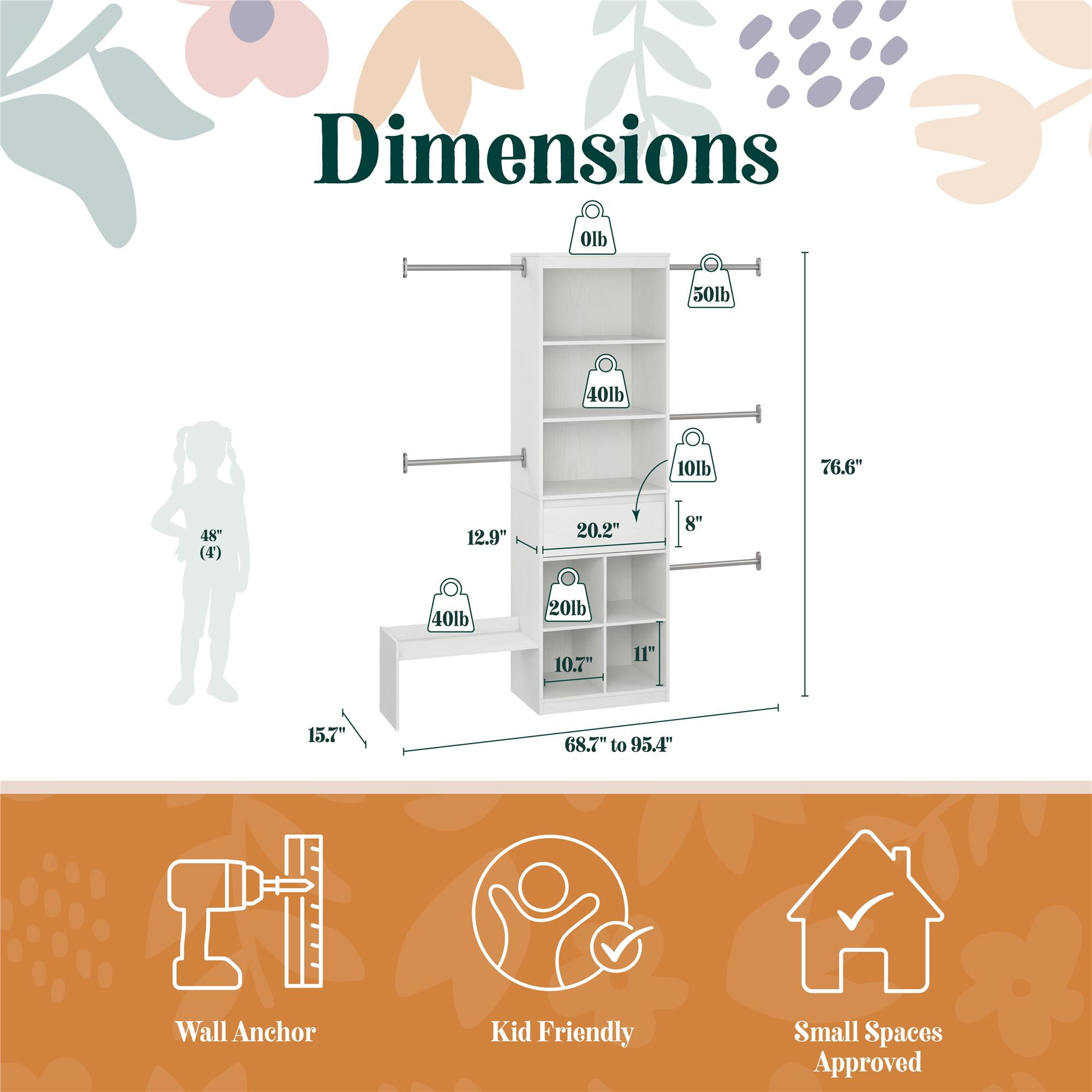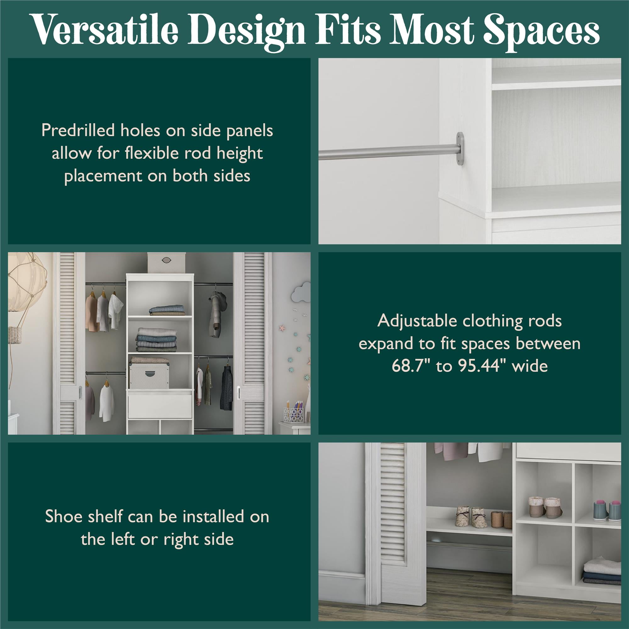 Made of laminated particle board with a non-toxic, white woodgrain finish The kids’ closet organizer features adjustable clothes poles and lower shoe rack that can be attached on either side of the organizer to be sure this piece will fit perfectly in your child’s closet The kids’ closet features 3 open shelves (1 adjustable) and 4 open cubbies and 1 drawer with metal drawer slides and built in safety stops Clothing rods will support up to 50 lbs. Upper shelves and shoe rack will each hold 40 lbs. Cubbies hold 20 lbs. each. Drawer will hold up to 10 lbs.