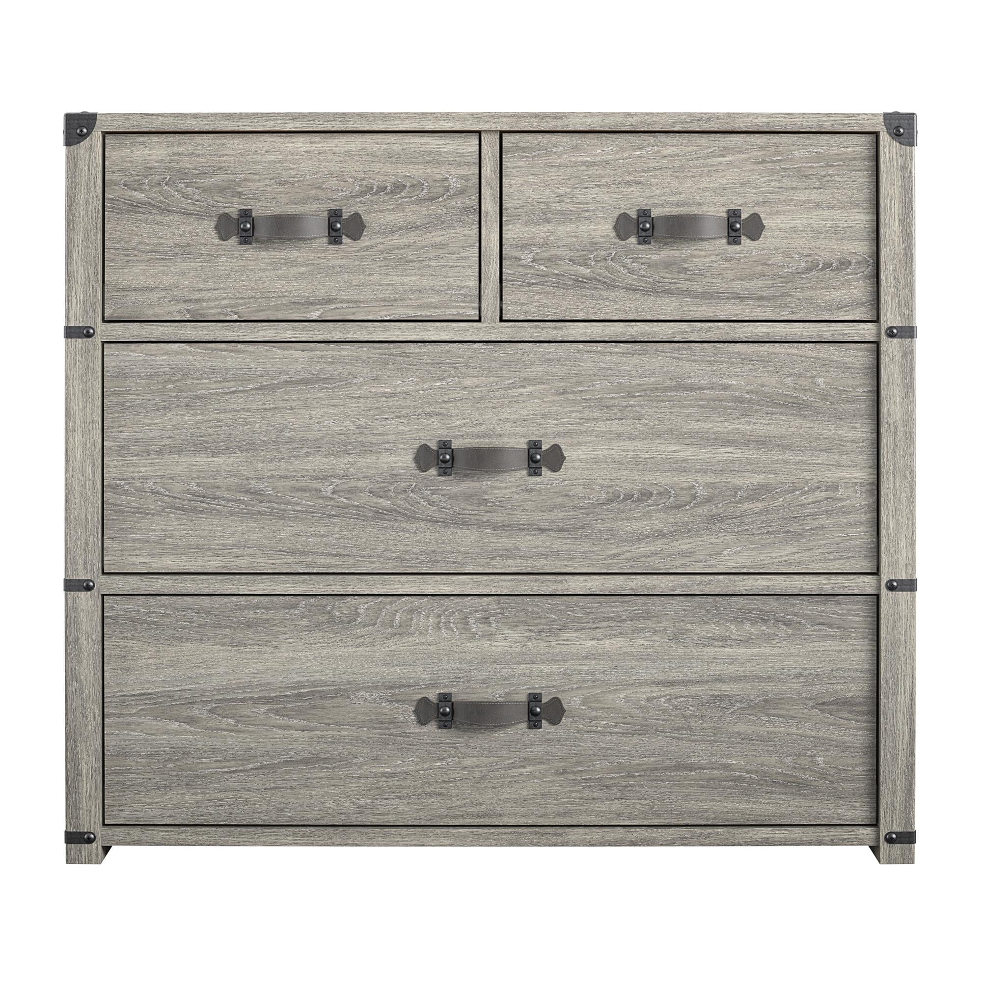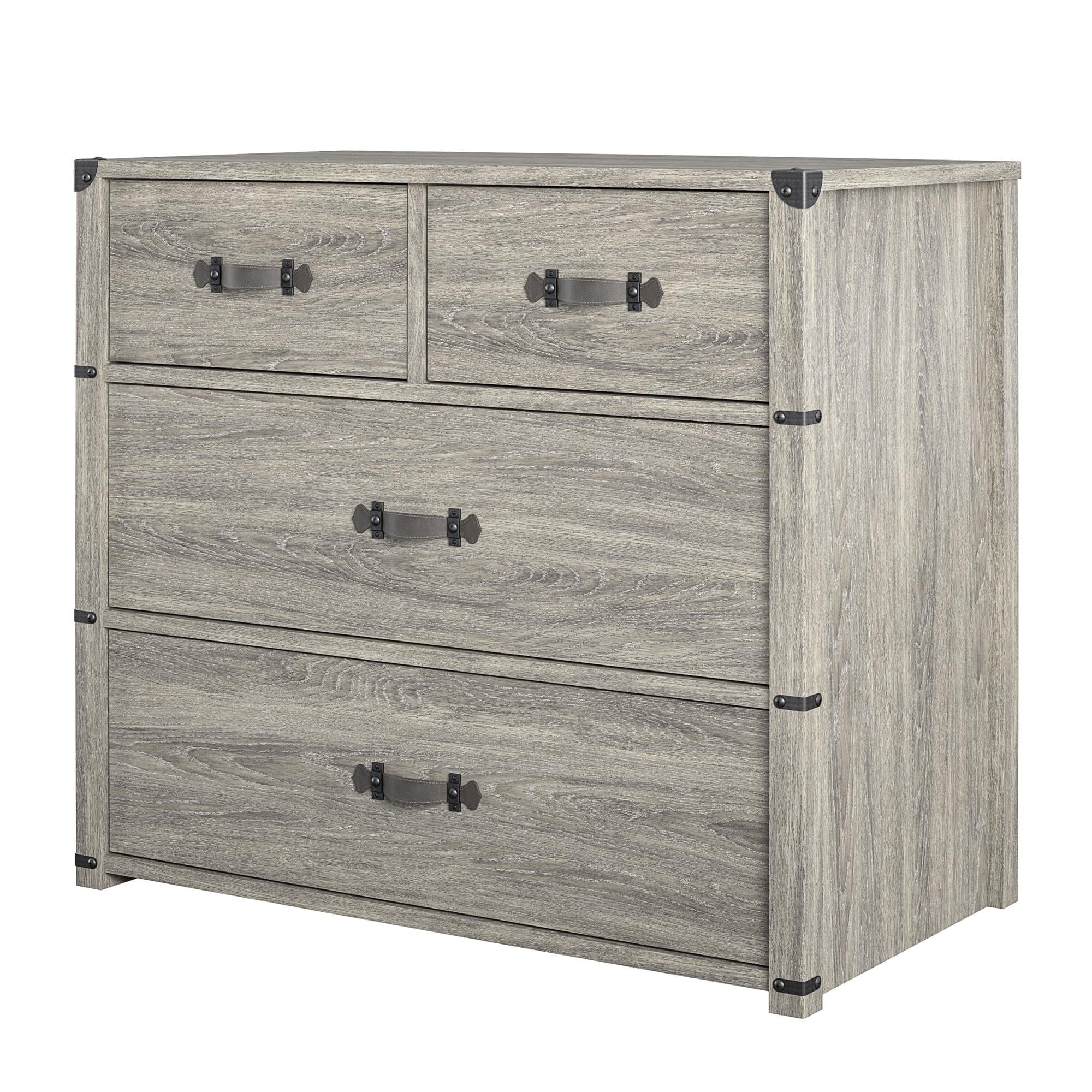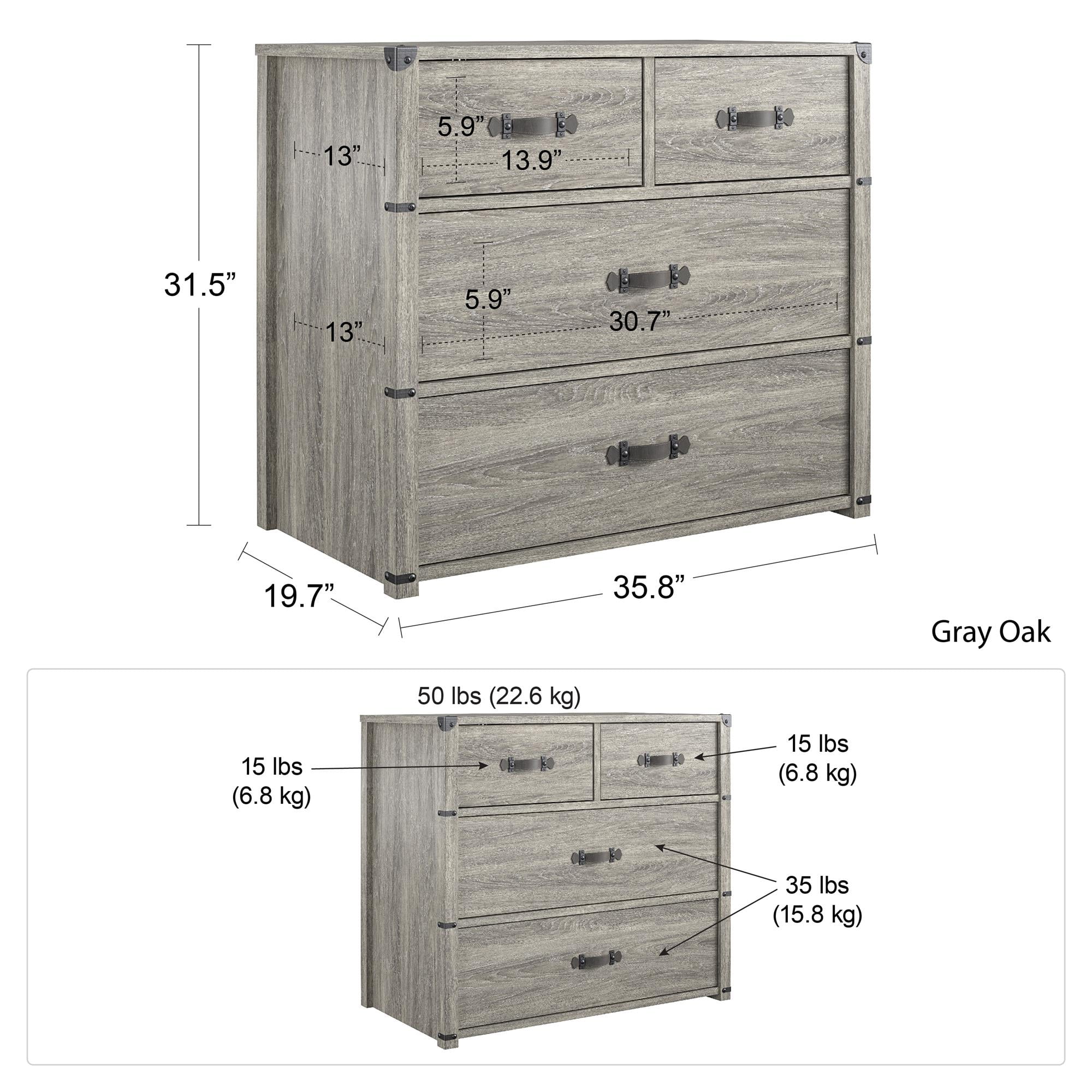 Made of laminated MDF and particleboard with a grey oak woodgrain finish 4 drawers feature durable metal slides with built in stops for safety Top surface can support 50 lbs. and each of the smaller drawers can hold up to 15 lbs. and the 2 larger drawers can hold 35 lbs. 1 year limited warranty Assembled dimensions: 31.5″ H x 35.75″ W x 19.69″ D