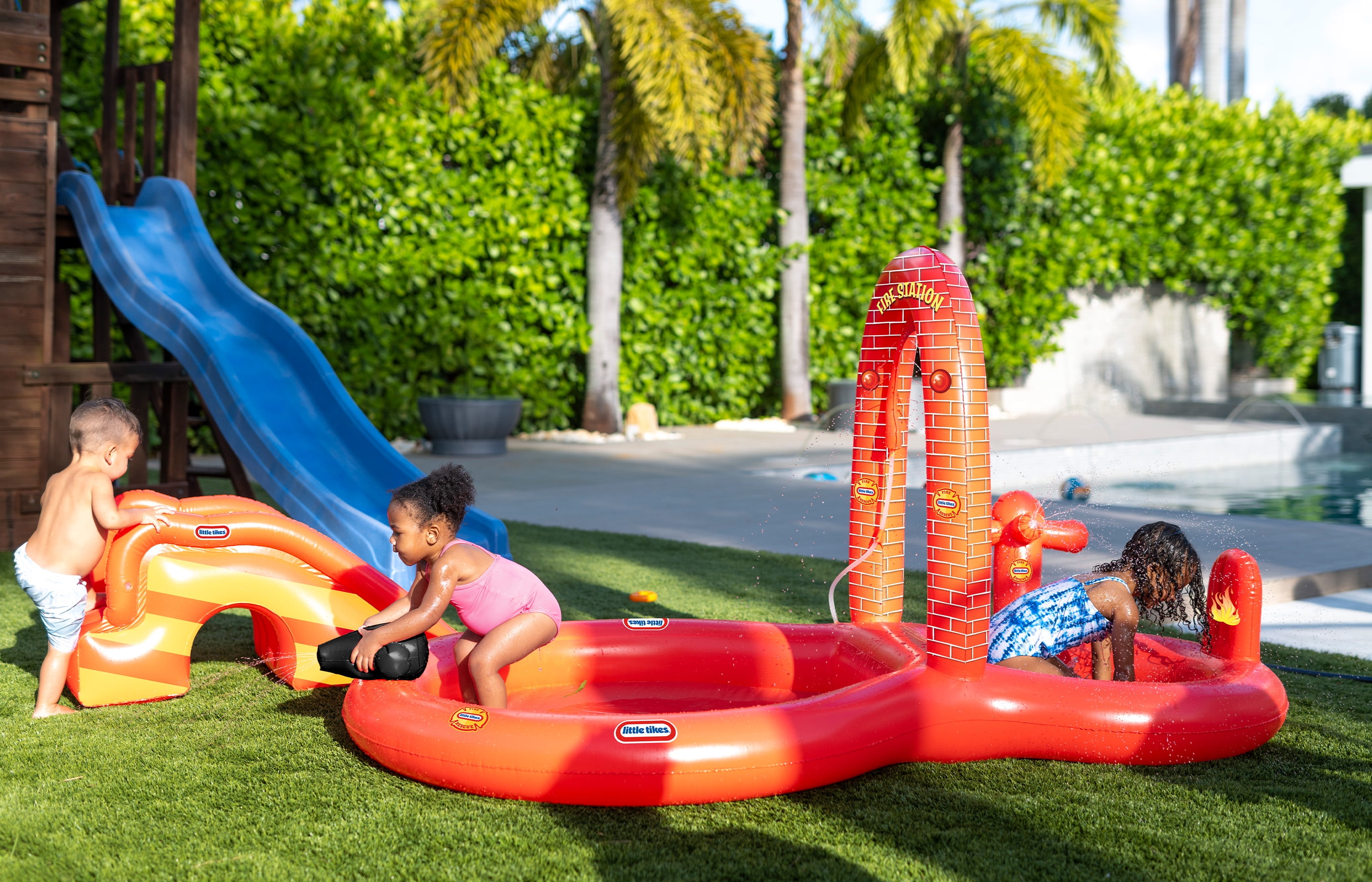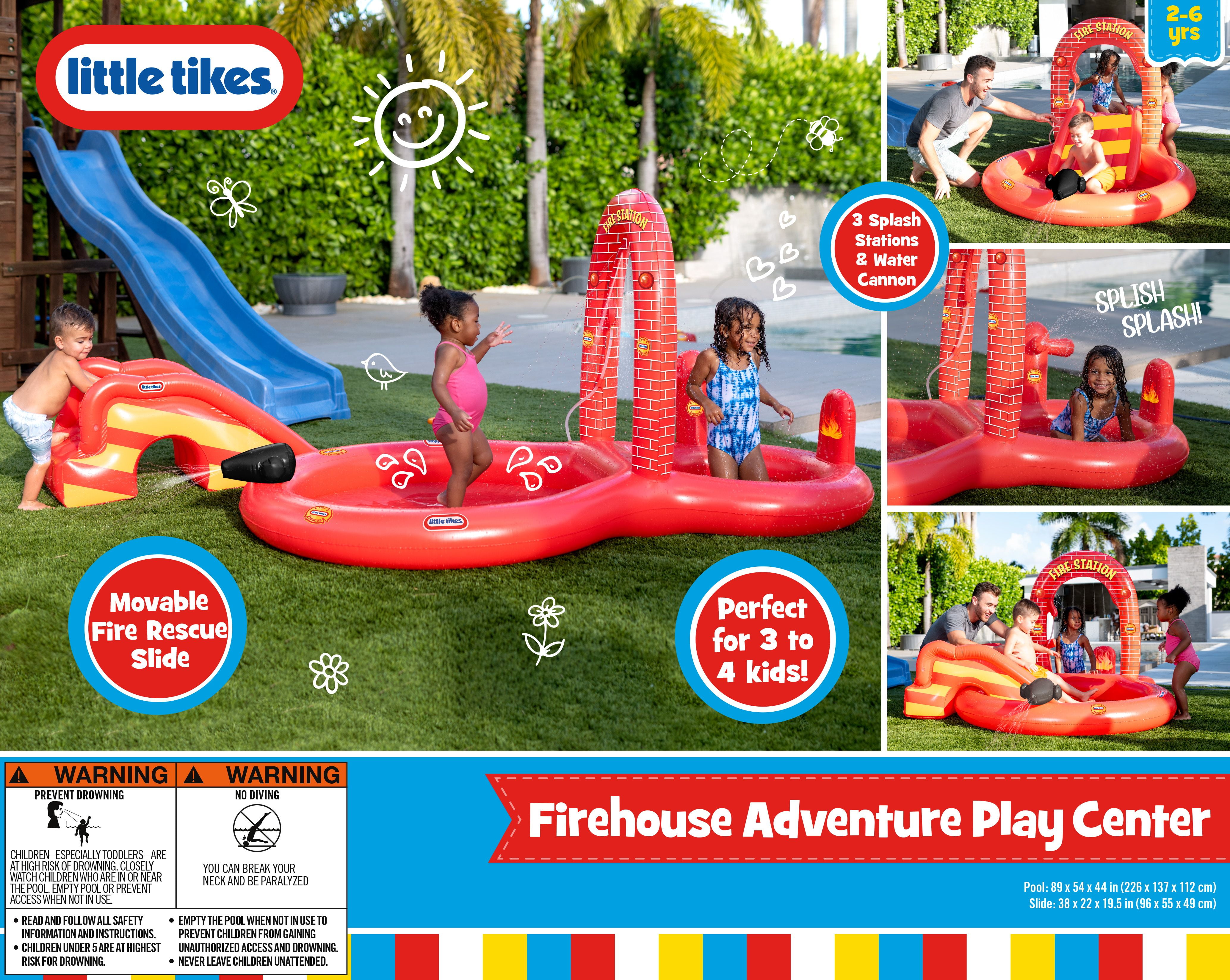“Ignite your child’s imagination with the Little Tikes Fire House Adventure Play Center! This remarkable inflatable pool and play center brings the thrilling world of firefighting right to your backyard, offering endless opportunities for role-playing and heroic adventures. Step into the extraordinary as your little ones explore the seven-foot-long play area designed to resemble a fun and exciting firehouse. Complete with a slide, fire hydrant sprinkler, and a working water cannon, this play center immerses children in an interactive world of water. Just inflate and connect a standard garden hose to transform the play center into a thrilling water park. With two safe, shallow pools and multiple water features, your little heroes can splash and play to their heart’s content, engaging in imaginative rescue missions and keeping the summer heat at bay. Crafted with durability in mind, the Fire House Adventure Play Center stands up to the most vigorous play. Its heavy-duty construction ensures that it withstands rough and tumble adventures, while the included repair patch provides a quick and easy solution for any unexpected punctures, ensuring uninterrupted playtime fun. Watch as your little ones embrace their inner heroes, sliding down the fire rescue slide, aiming the water cannon with precision, and bravely engaging in imaginative missions to save the day. The Fire House Adventure Play Center encourages active play, creativity, and endless hours of summertime fun. Bring the spirit of firefighting to your backyard with the Little Tikes Fire House Adventure Play Center. Let your children’s heroic dreams come to life as they embark on unforgettable water-filled adventures, creating memories that will last a lifetime.” Recommended for boys and girls ages 2 to 6 years old.
