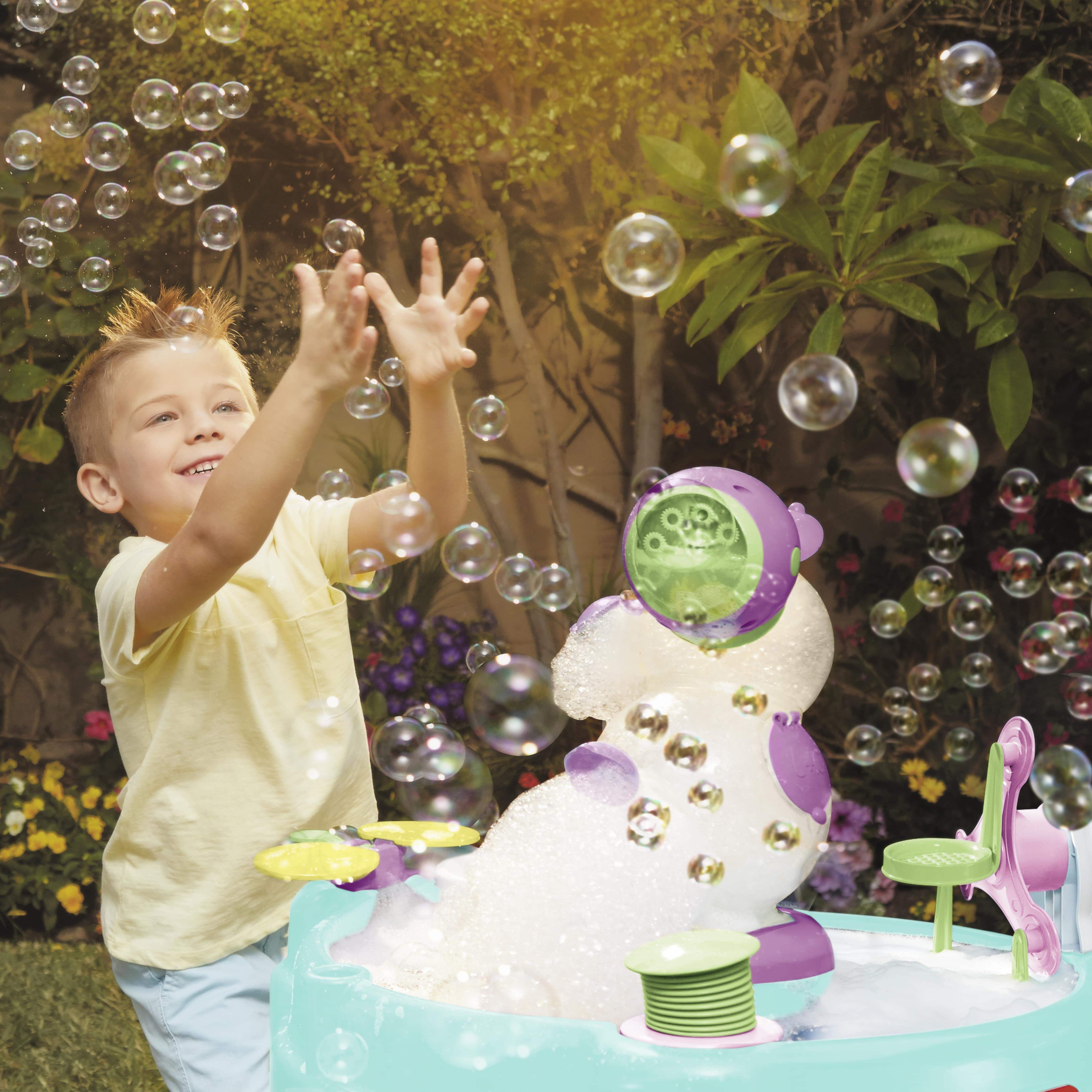 IT MAKES BUBBLES. Bubble machine at top MOTORIZED FOAM MACHINE. Foam machine with motor ANY SOAP WILL DO. Add in the bubble solution or any soap from home and watch it bubble and foam COOL FLOWING TOWER. Center tower fills up with foam and overflows out of the openings HAND PUMP FOR EVEN MORE BUBBLES. Hand pump to generate bubble in the water table SPINNING FERRIS WHEEL. Ferris wheel spins and picks up foam as it turns FUN FOAM CLAPPER. Foam clapper for a bonus surprise WILD WATER PLAY ACCESSORIES. Water play accessories included Requires 2 “D” and 4 “AAA” alkaline batteries (not included) Assembly Required
