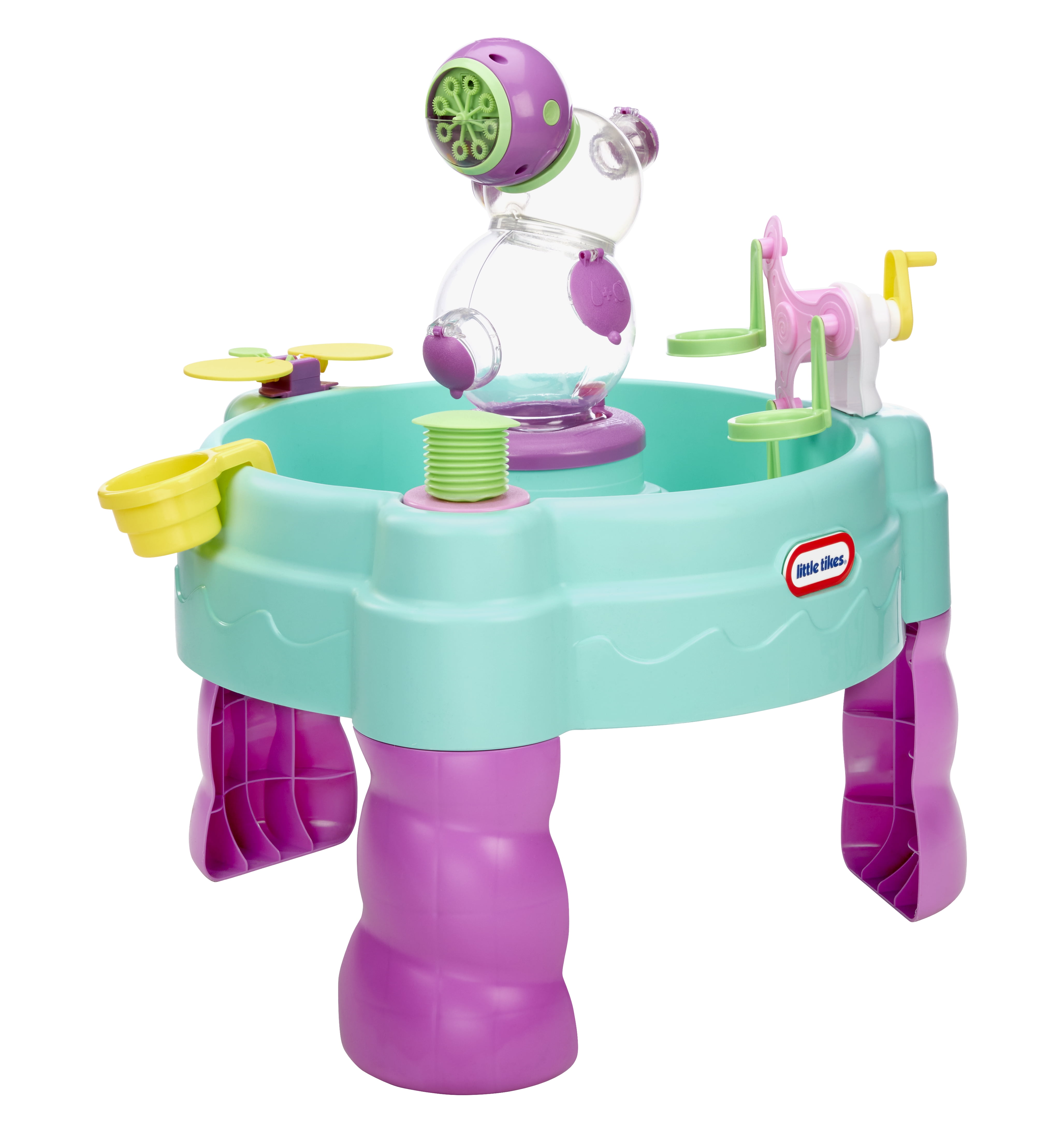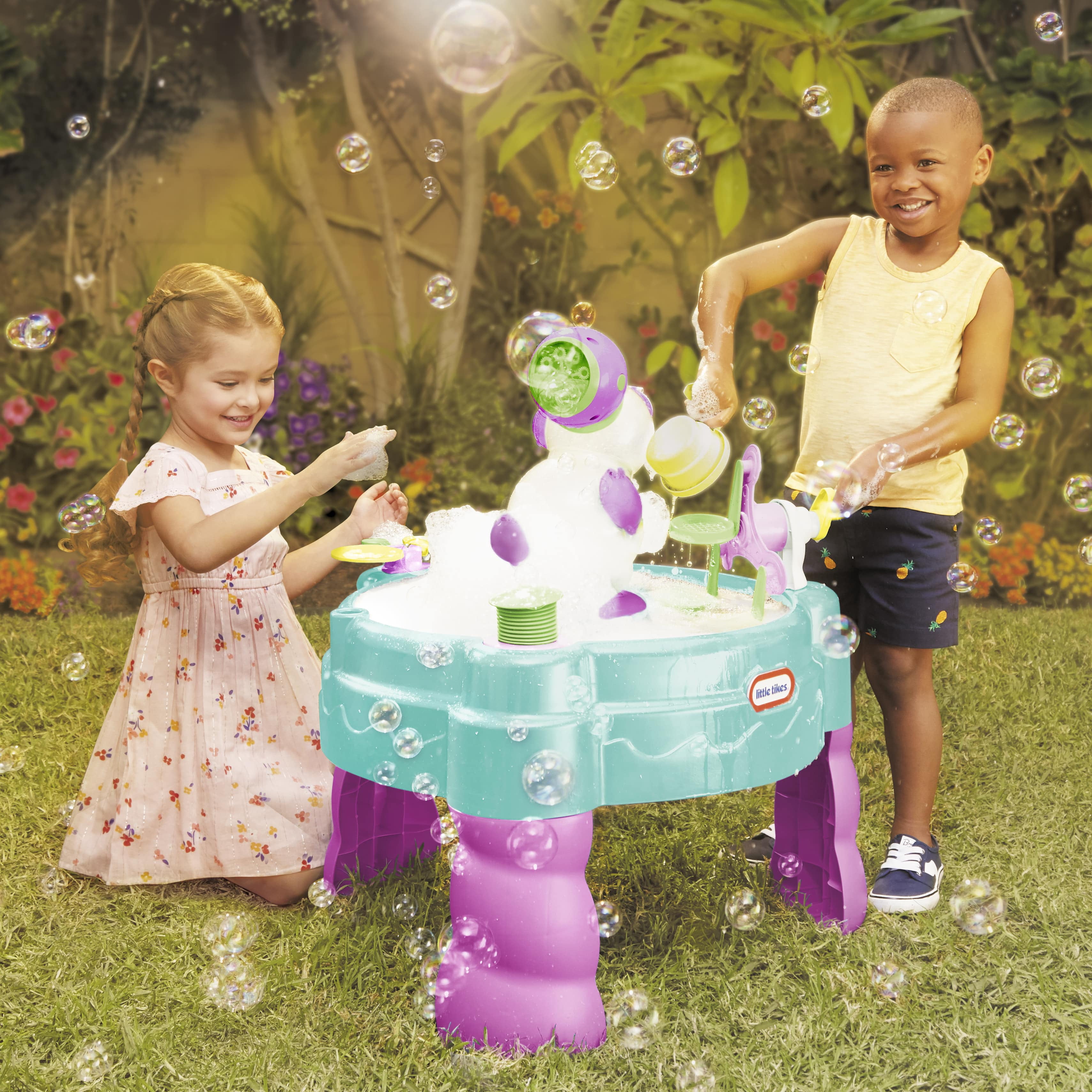 The Little Tikes® FOAMO™ 3-in-1 Mermaid Water Table has both a bubble machine and a foam machine with a motor in a magical mermaid theme. The center tower fills up with foam, which overflows out of the openings. There’s also cool water play accessories and a Ferris wheel that spins and picks up foam, and a fun foam clapper for even more surprises. And any soap from home or bubble solution will work with the magical machine and hand pump, so the water table will always be filled with bubbles. Assembly and batteries are required, but the Little Tikes® FOAMO™ 3-in-1 Mermaid Water Table keeps kids 2+ going and going.