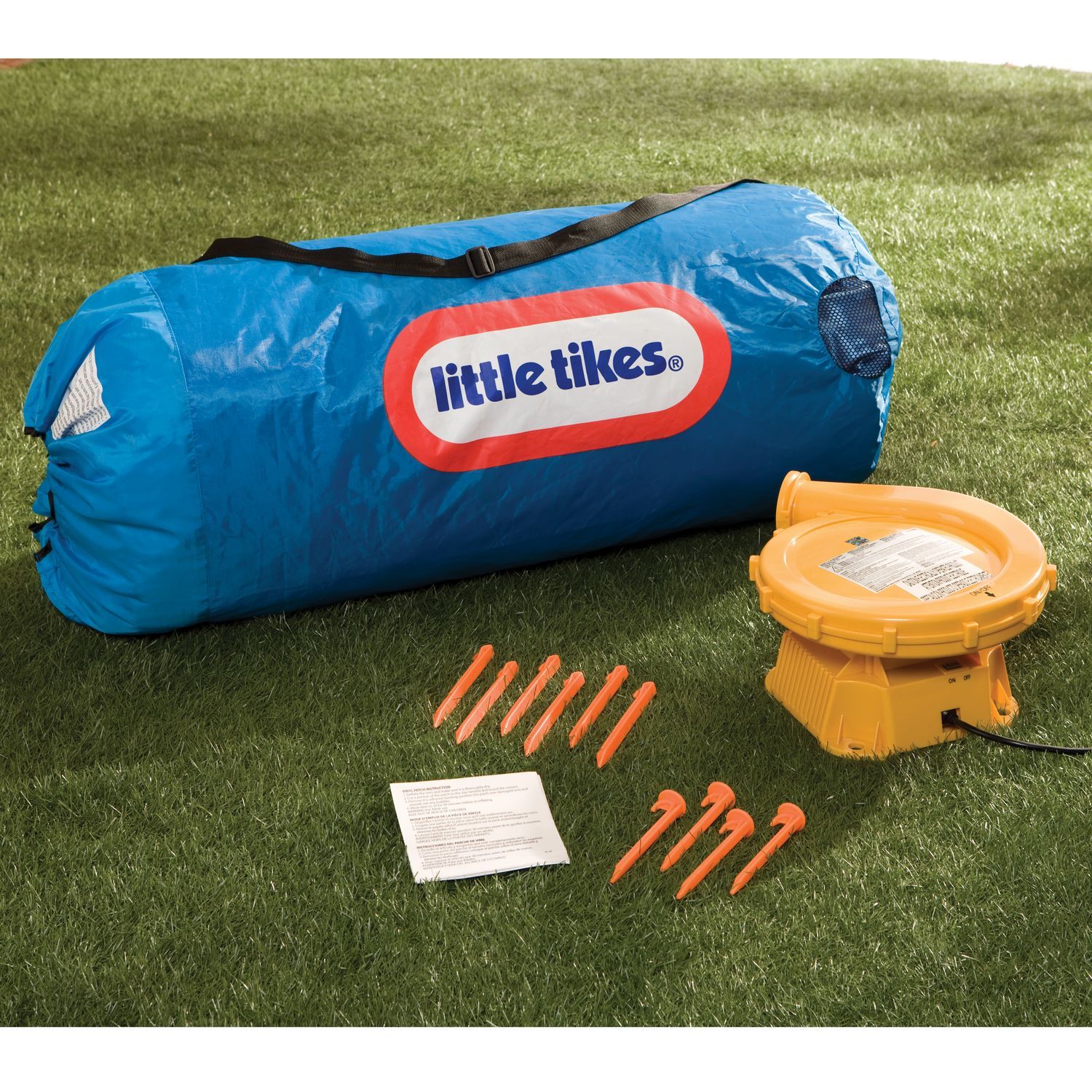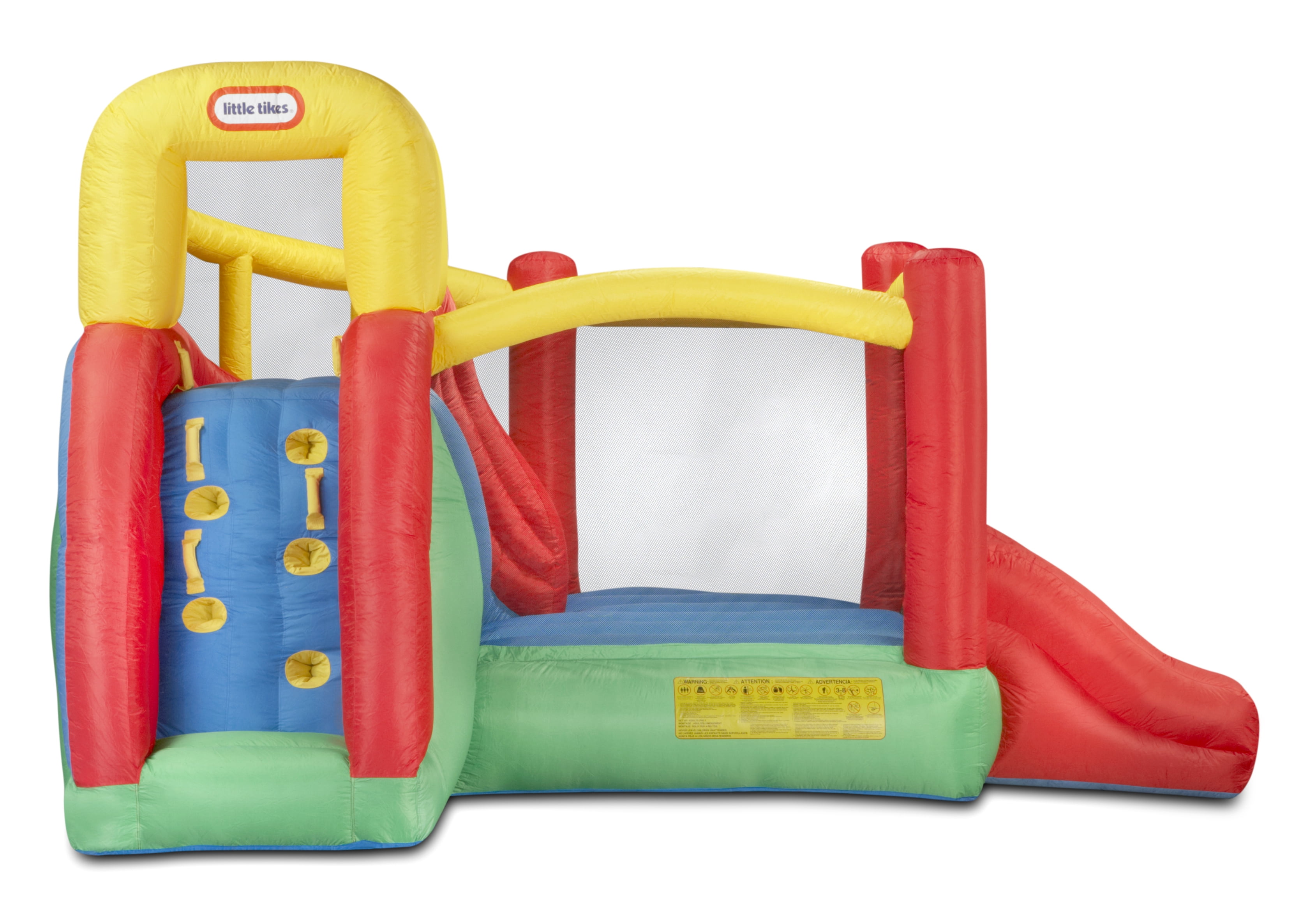 Little Tikes Fun Slide ‘n’ Bounce Bouncer: Fun Bounce Little Tikes Bouncer is built of puncture-resistant material with durable mesh netting Climbing wall 2 fun-filled slides; 1 taller, curving slide and another straight slide 2 entrances; 1 crawl-up entrance and another main level entrance Climb-through tunnel adds an extra element of excitement Center jumping area allows for plenty of bouncing fun Stakes anchor the bouncer firmly in place Blower required for inflation Heavy-duty blower with GFCI plug included Comes with stakes, repair kit and storage bag Maximum weight capacity: 250 lbs Accommodates up to 3 children Dimensions: 10’10″L x 12’5″W x 7’8″H Little Tikes Jump ‘n’ Slide Inflatable Bouncer comes with a 90-day limited warranty