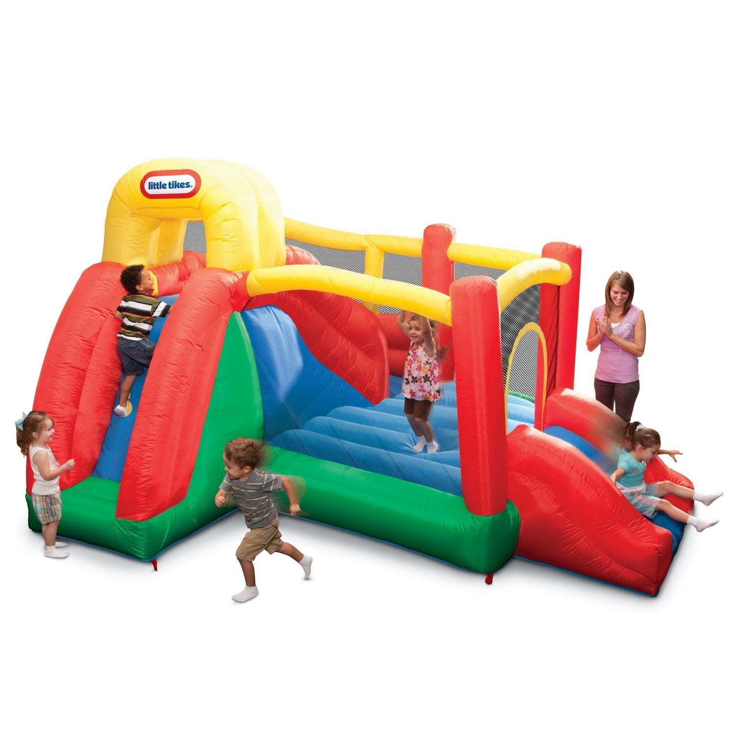 Provide your little ones with hours of bouncing fun with this Little Tikes Jump n’ Slide Bouncer. This bouncer features two slides, a climbing wall and a jumping area so that there is something to do for everyone. The bouncer is constructed from puncture-resistant material with mesh netting, making it durable for many hours of play. The two fun-filled slides are accessible from two different entrances, allowing kids to slide down repeatedly. The spacious center offers plenty of bouncing room while the tunnels add excitement and mystery. With stakes, a repair kit and storage bag included, you will have everything you need to get the fun started. This Little Tikes Jump n’ Slide Inflatable Bouncer is ideal for birthday parties and other kid-friendly gatherings.