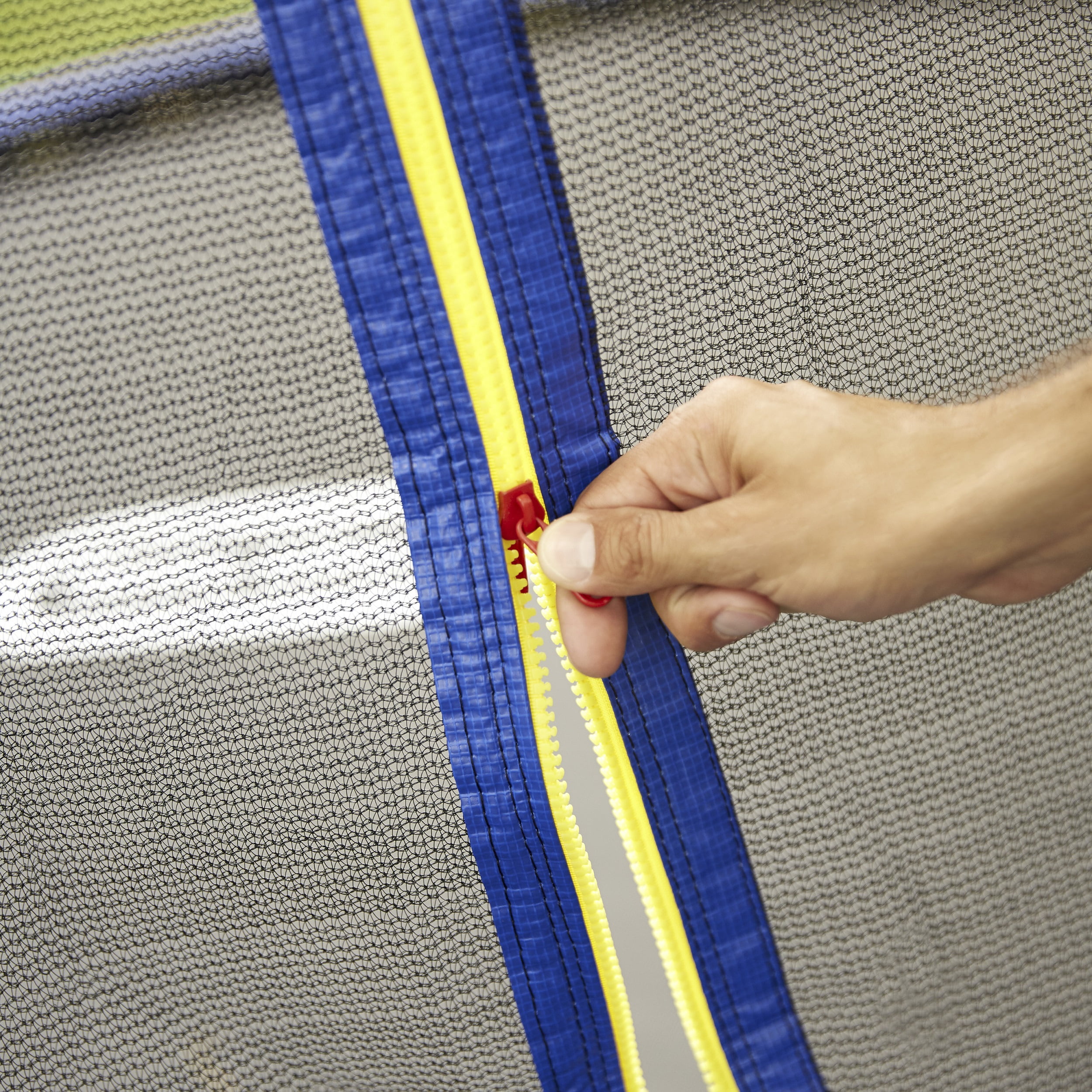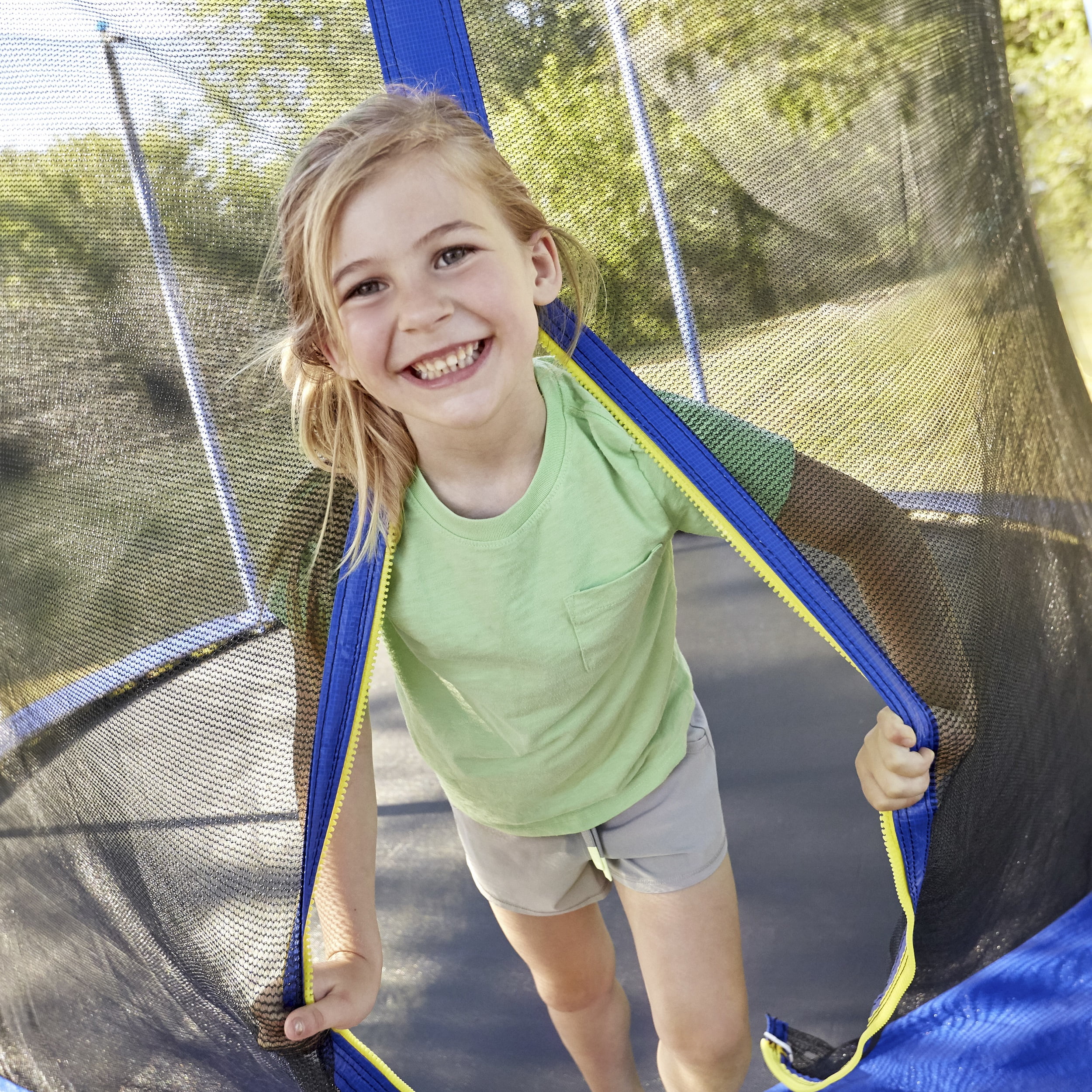 LARGE BOUNCING AREA. The large,10-foot bouncing area is extra springy STUDY & STABLE. Extra buckles and a heavy duty zipper add some extra stability to the safety netting while kids bounce BUILT-IN SAFETY FEATURES. The entire trampoline is surrounded by safety netting, and the posts are covered in high density foam with plastic tops Assembly required Dimensions: 63.7”x 17.75” x 9.5” Ages: 6+ Years