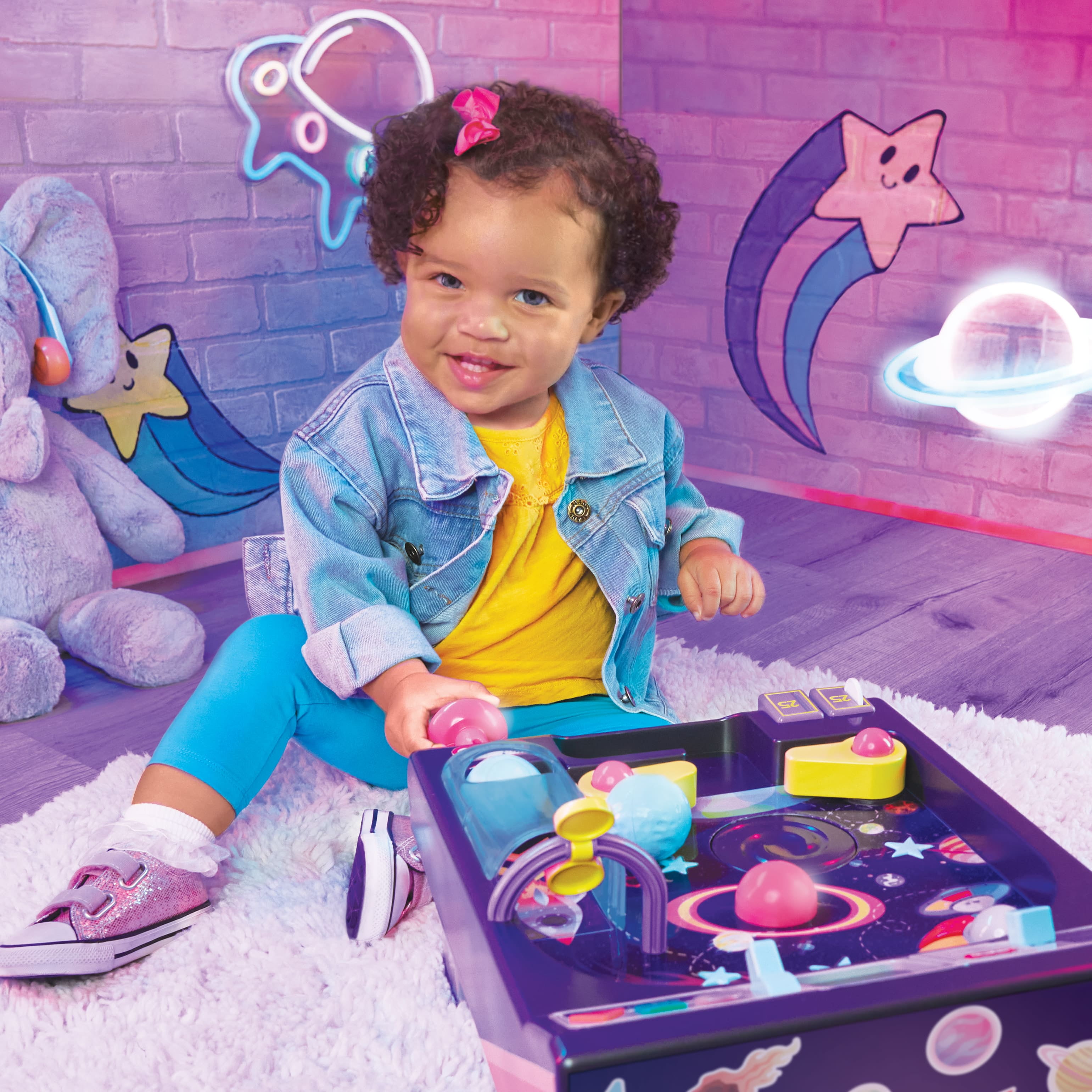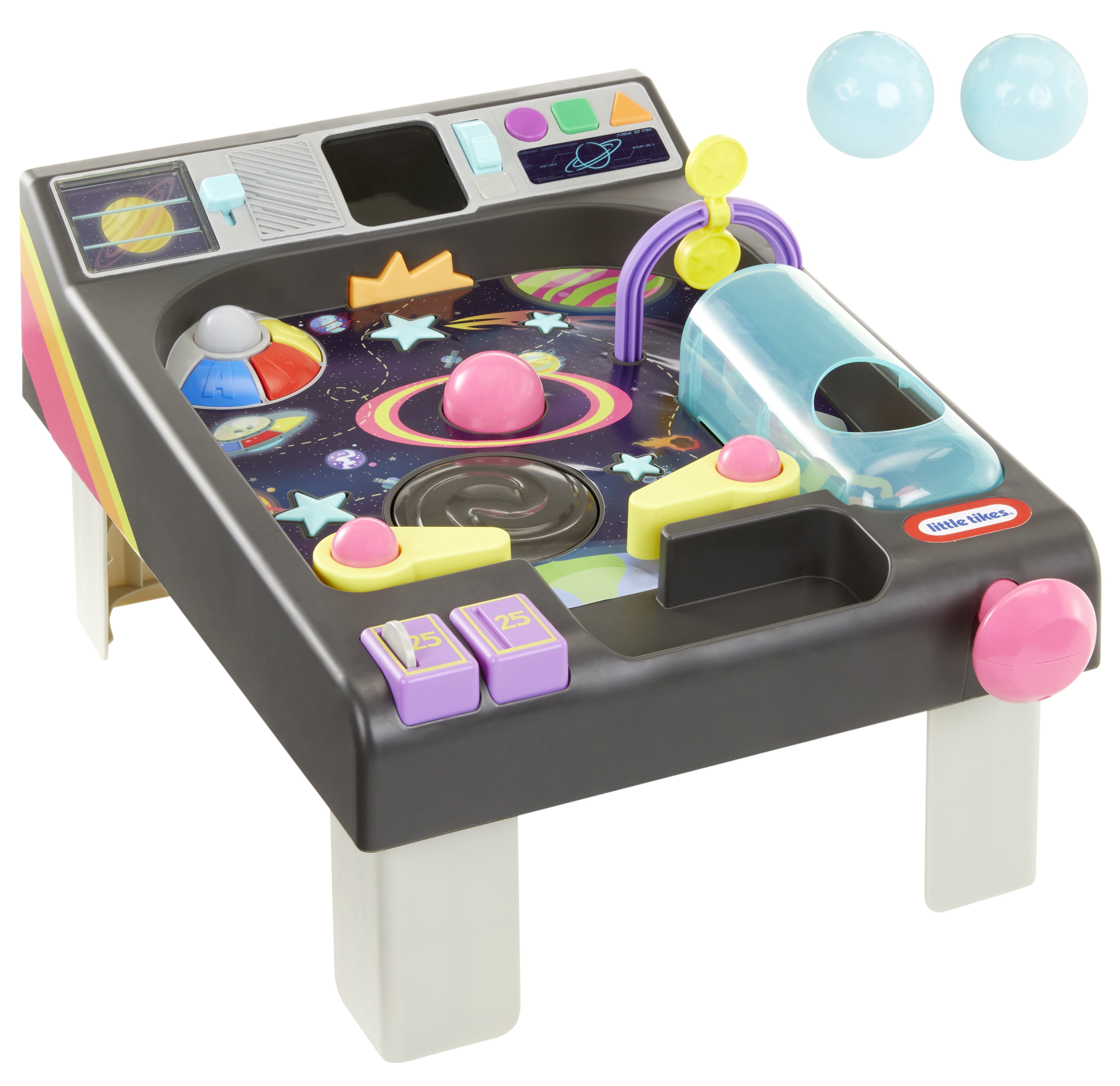 Take space discovery to the next level with the Old School™ My First Pinball Activity Table™ from Little Tikes®. Launch the asteroid play balls into the out-of-this-world play area and activate number and color callouts, along with retro arcade sound effects. Learn the alphabet with the light up UFO, and countdown to blastoff when the asteroids enter the center planet’s atmosphere. Rocket up to the top panel to discover opposites, learn about shapes, and reveal nifty planetary facts. It’s cooler than all the stardust in the galaxy. Recommended for boys and girls ages 12+ months.