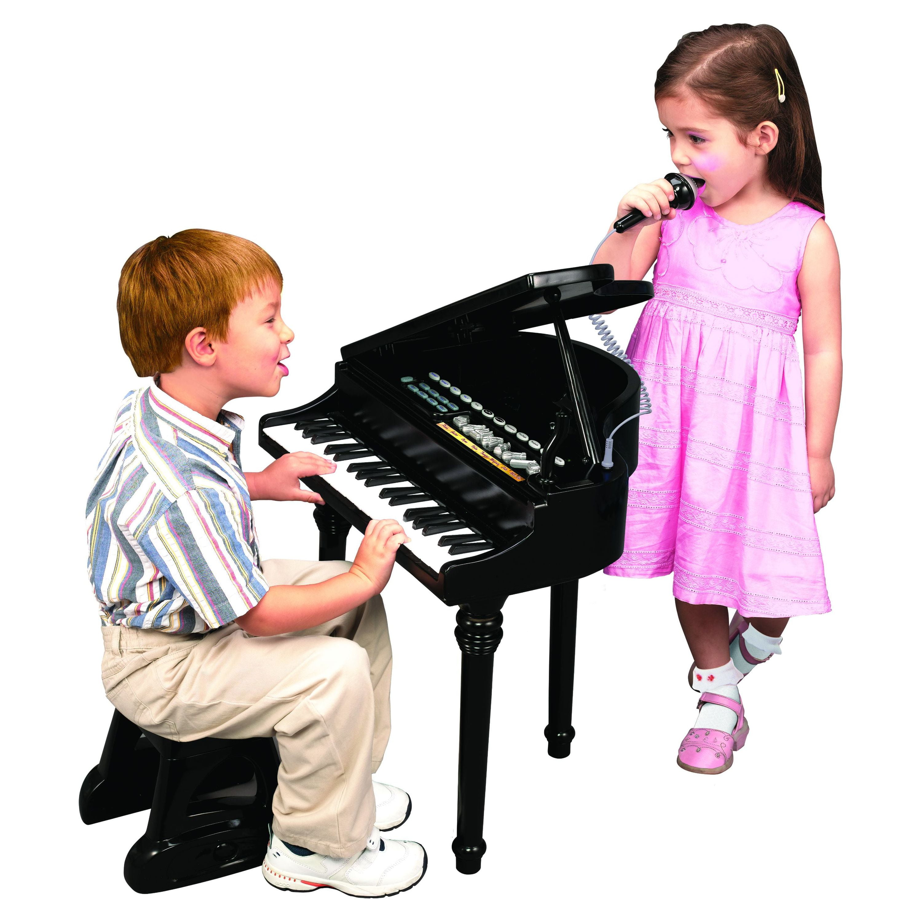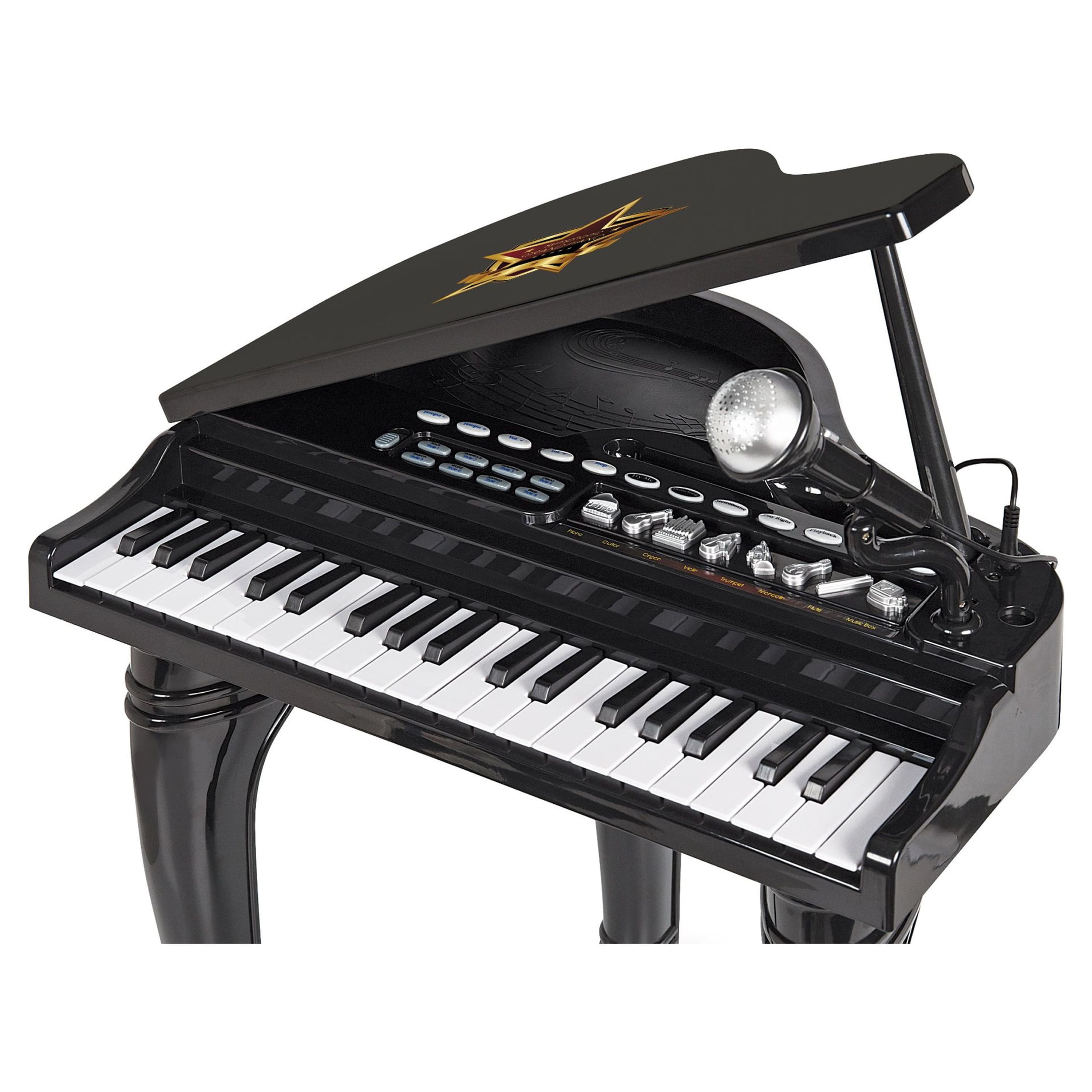 Live the dream of being a real-life concert pianist when you buy the Little Virtuoso Symphonic Grand Piano. This classic kids’ grand piano features 37 white and black keys that strike to produce great music. A sleek and versatile electronic instrument, the piano allows your child to create melodious music from as many as eight instrument sounds, background music and rhythm. Including the sounds of a piano, flute, guitar, organ, trumpet, violin, mandolin and music box, the symphonic grand piano also has 15 pre-recorded demo songs. The beautiful black-finished symphonic grand piano includes a detachable microphone so that your little one can play and sing along. A record and playback feature enables your child to compose, play and record songs, while a built-in metronome feature enables setting the desired number of beats per minute to create different tunes. Let your child author his or her first masterpiece with this Littler Virtuoso kids’ grand piano. Recommended for ages 3 years and up. WARNING: CHOKING HAZARD — Small parts. Not for children under 3 yrs.