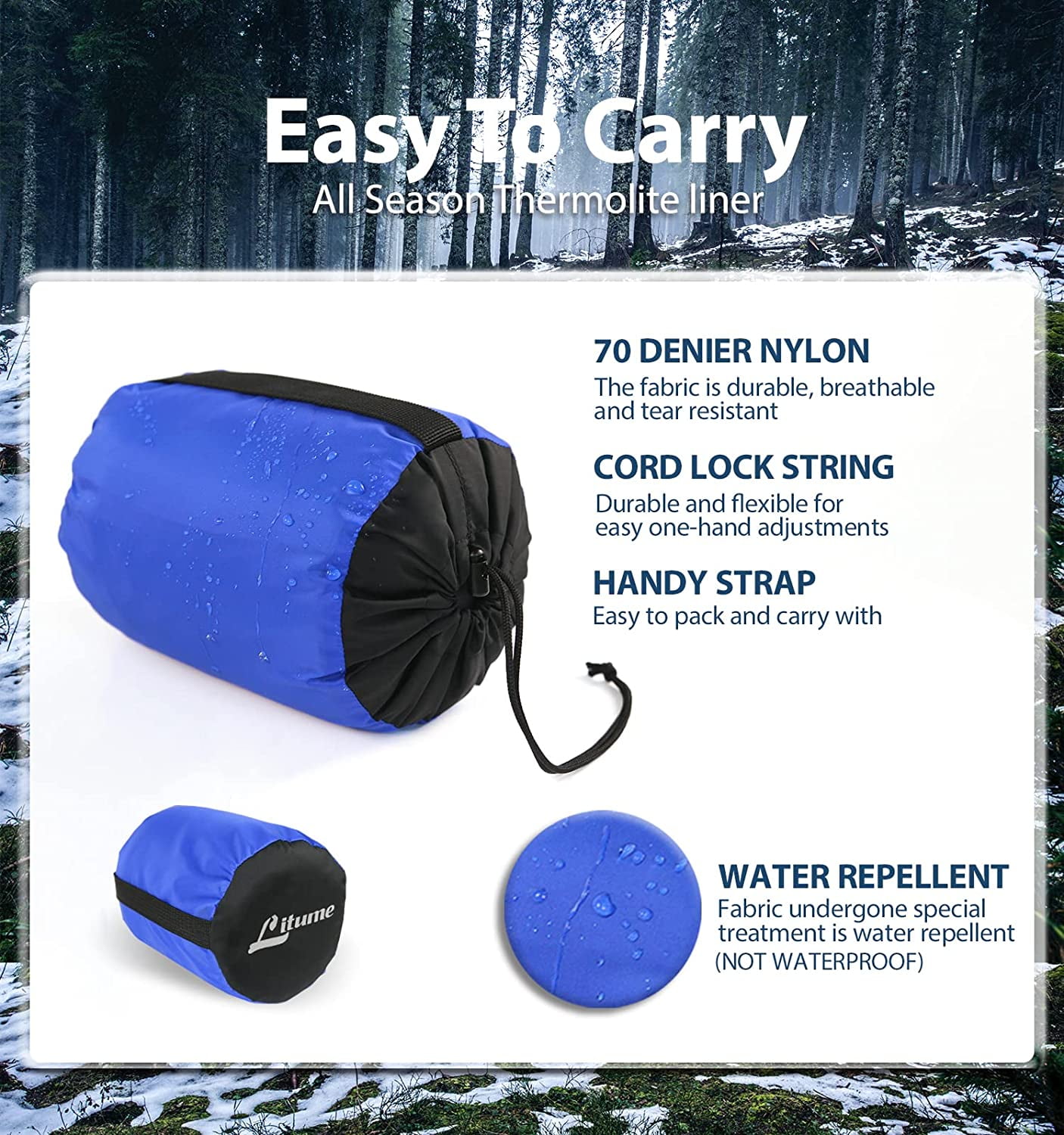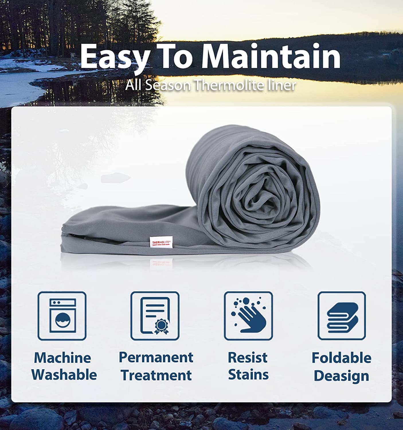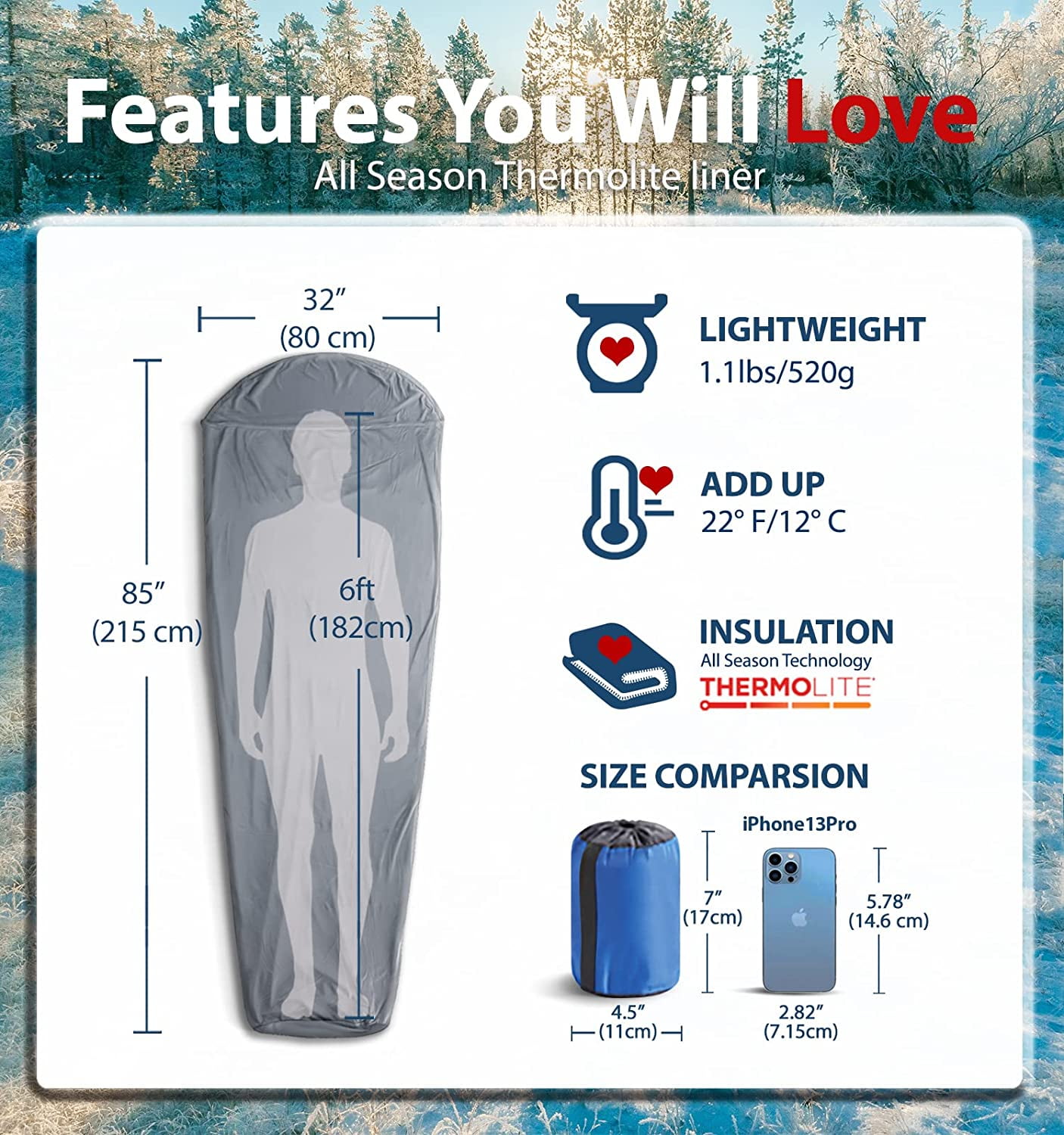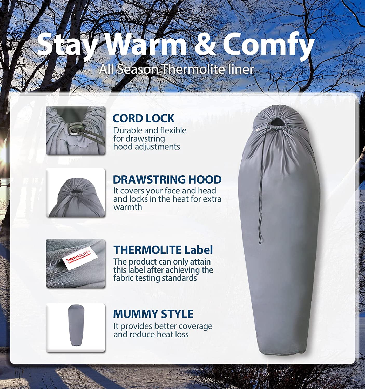 Litume Mummy Sleeping Bag Liner, Gray 100% Polyester construction for warmth and comfort Designed to add up to 22°F/12°C warmth to your sleeping bag Soft, smooth, and elastic fabric locks in warmth for a cozy sleep Ideal for both indoor and outdoor use, keeping dirt and bugs away Compact and lightweight design rolls up easily for travel