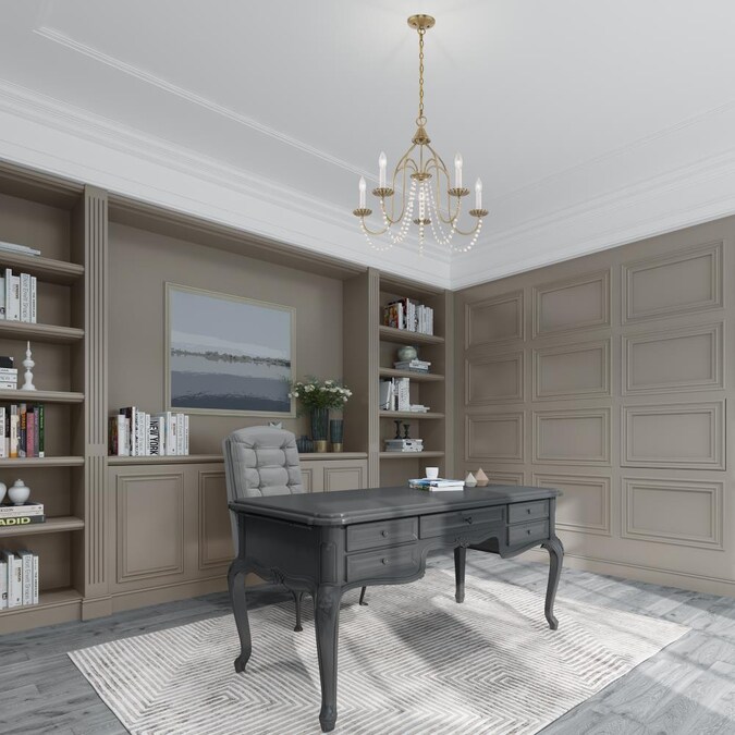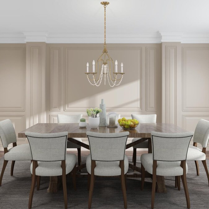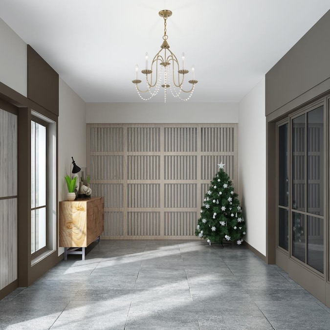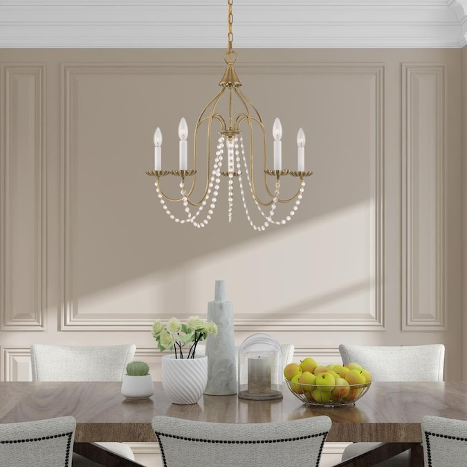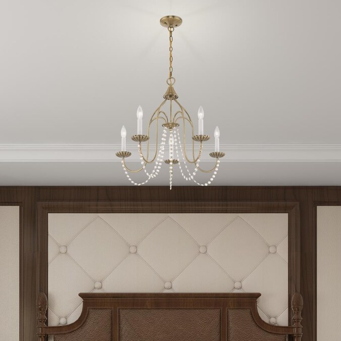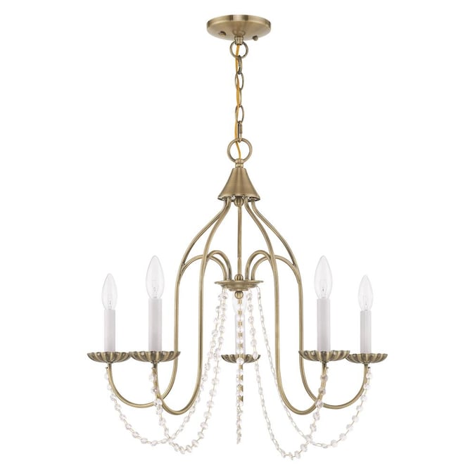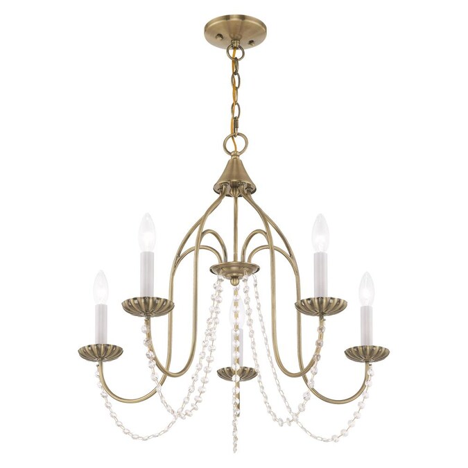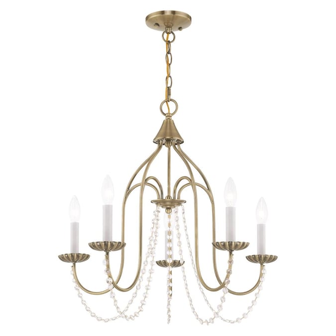 The simplicity of this five arm chandelier in antique brass is gently draped with clear crystal trim making this an ideal fixture for many different decor settings.