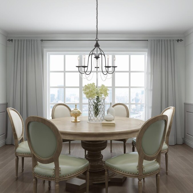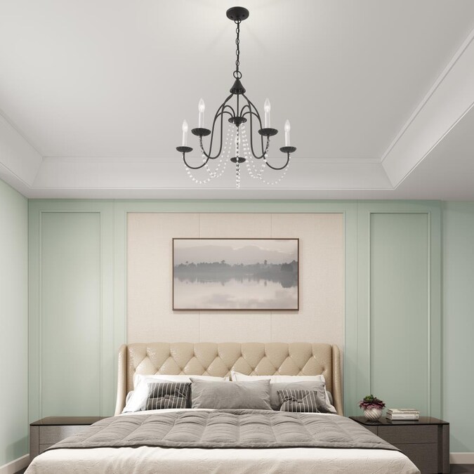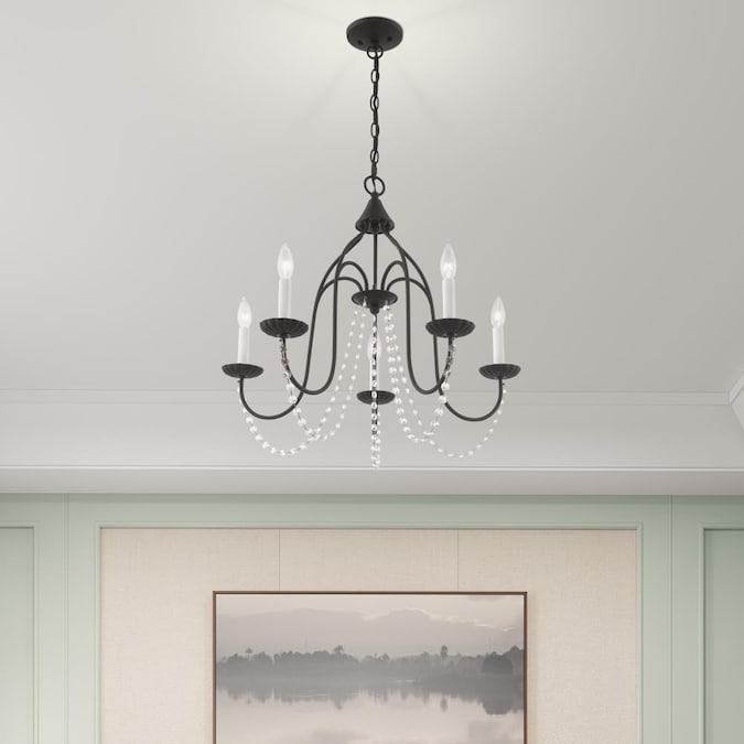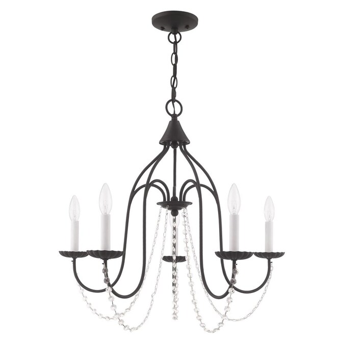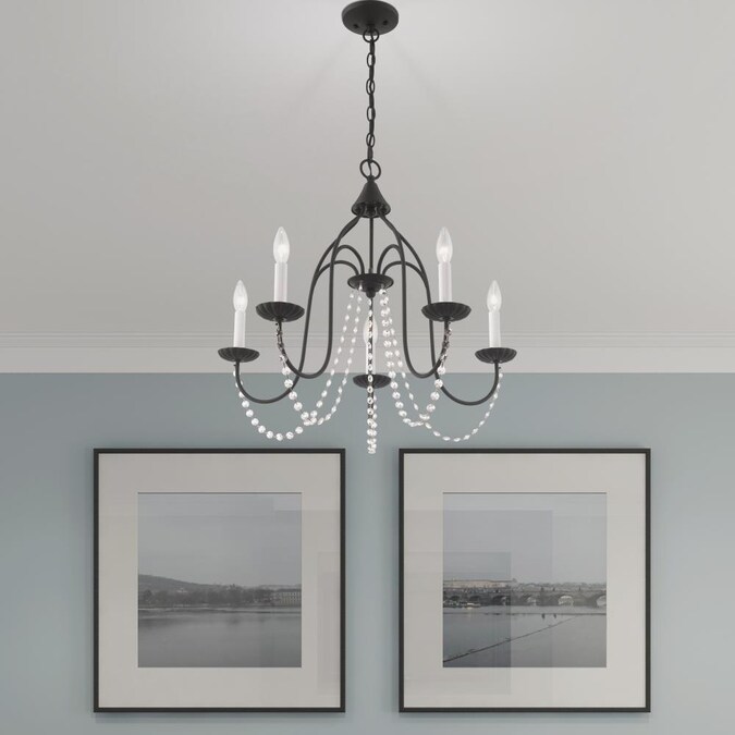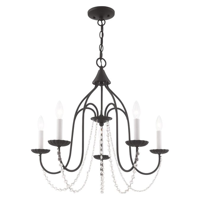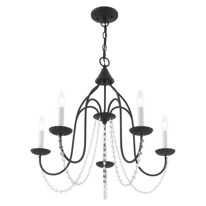 The simplicity of this five arm chandelier in black is gently draped with clear crystal trim making this an ideal fixture for many different decor settings.