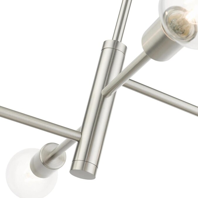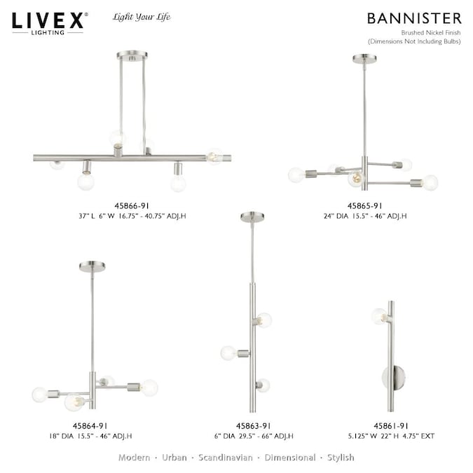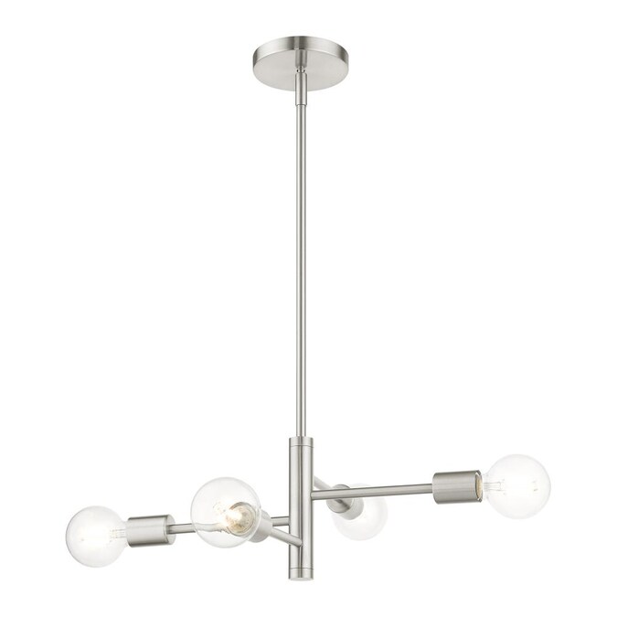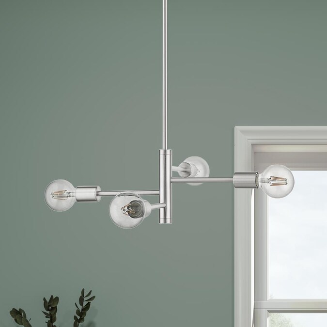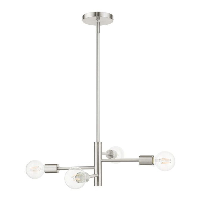 Simplicity and attention to detail are the key elements of the Bannister collection. The dimensional form, exposed bulbs and combination of finishes adds a playful mood to a contemporary or urban interior. This four-light asymmetrical chandelier design gives a new face to a kitchen, dining room, living room or a bedroom. It is shown in a brushed nickel finish.