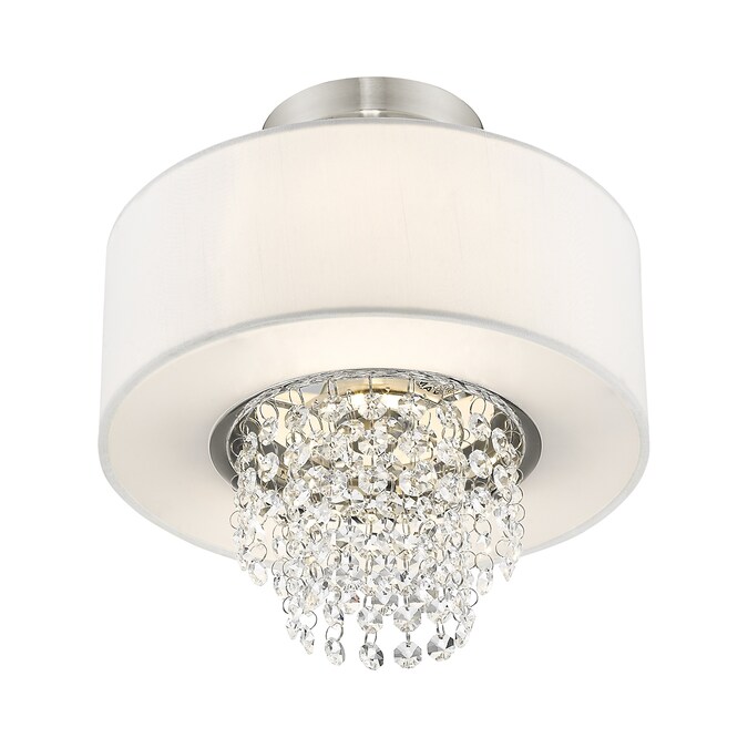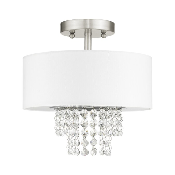 A contemporary style semi flush mount from the Carlisle collection. The design features a brushed nickel housing and canopy, with hanging strands of beautiful clear crystal. A hand crafted off white fabric hardback drum shade surrounds the crystals and fixture frame, and creates a magnificently sophisticated look.