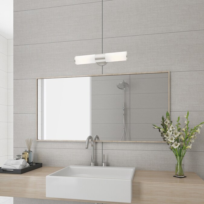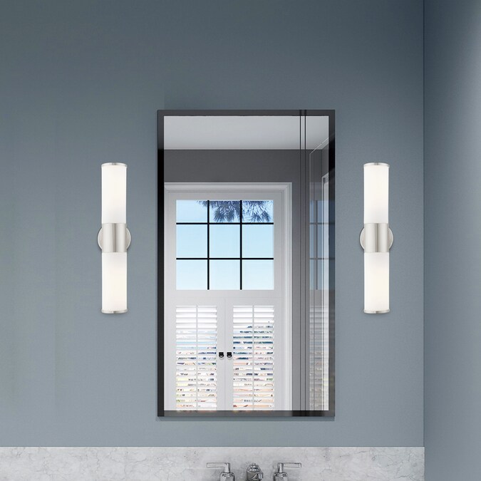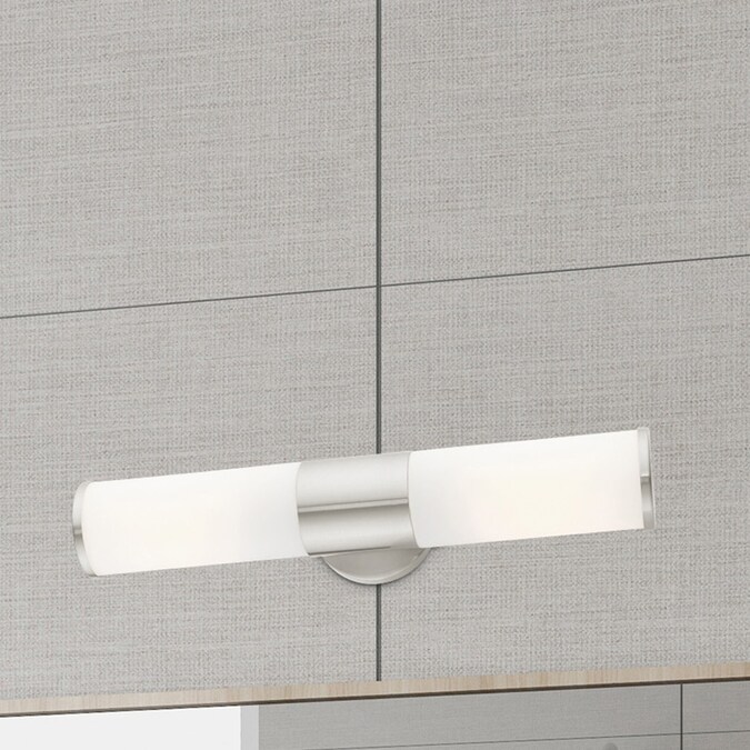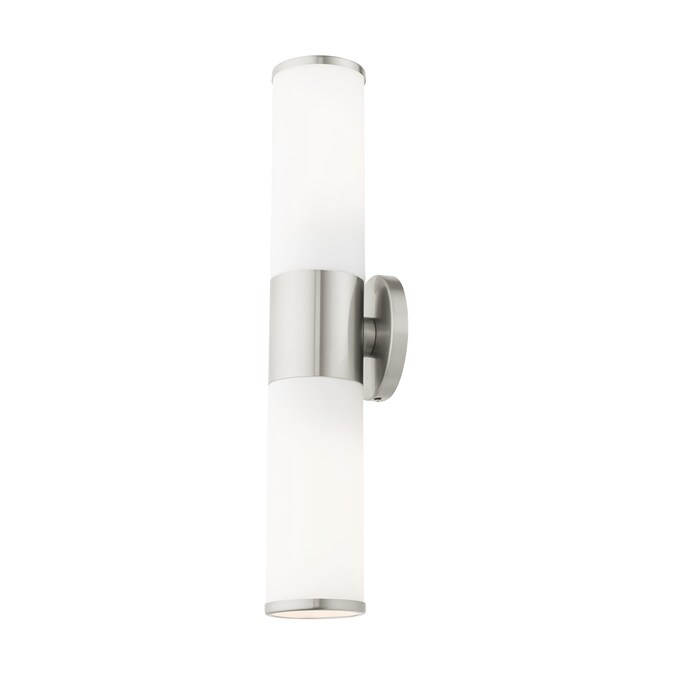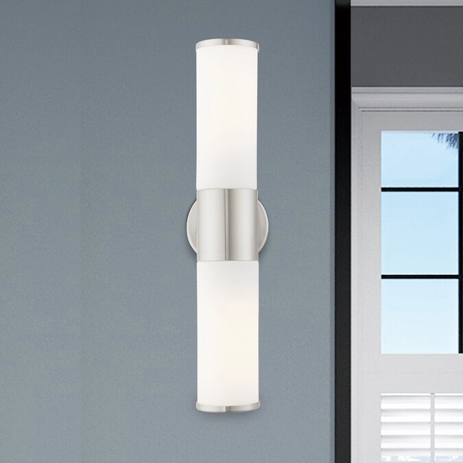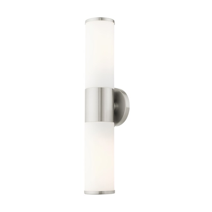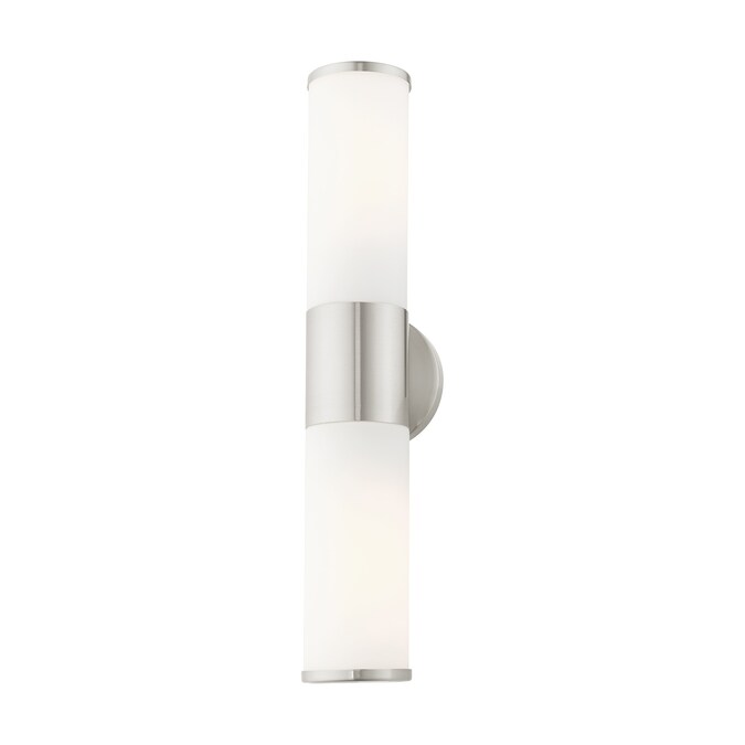 Add a dash of character and radiance to your home with this vanity sconce. This two-light fixture from the Lin dale collection features a brushed nickel finish with two satin opal white glass cylinder shades on either side. The clean lines of the back plate complement the cylindrical glass shades adorned with detailed trim at the end of each glass creating a minimal, sleek, urban look that works well in most decors. This fixture adds upscale charm and contemporary aesthetics to your home.