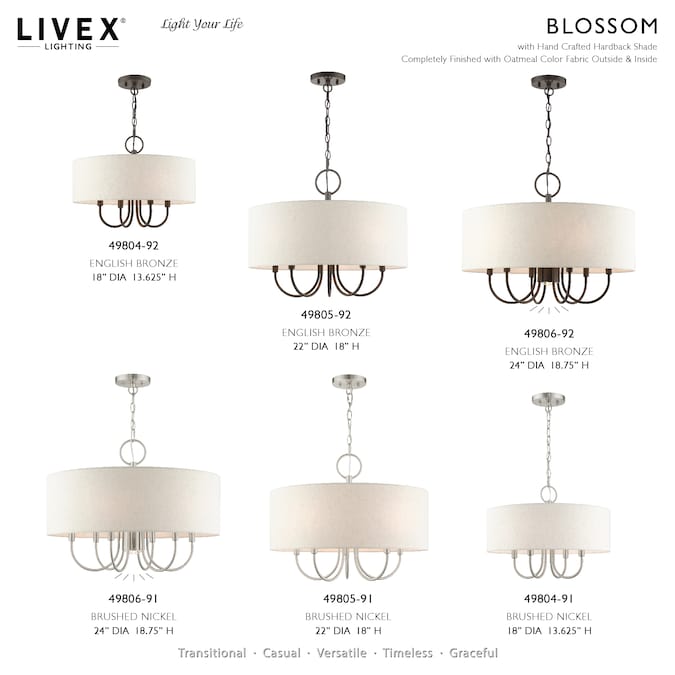 - Beautiful brushed nickel finish with hand crafted oatmeal outside and white inside fabric shade