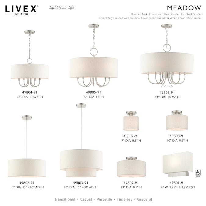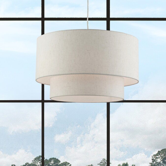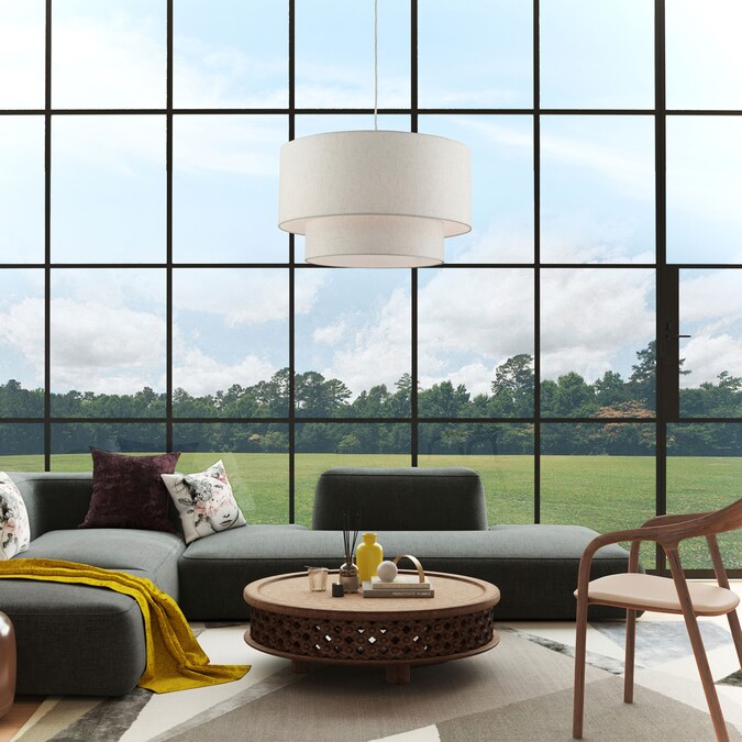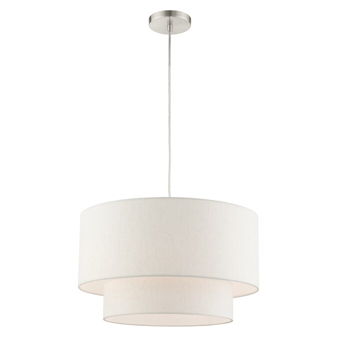 The meadow collection is both modern and versatile. The hand-crafted oatmeal colored fabric hardback shade is set off by the silky white fabric on the inside setting a pleasant mood. The three-light double drum shade adds character to this handsomely styled pendant. Perfect fit for the living room, dining room, kitchen and bedroom. This sleek design is shown in a brushed nickel finish.