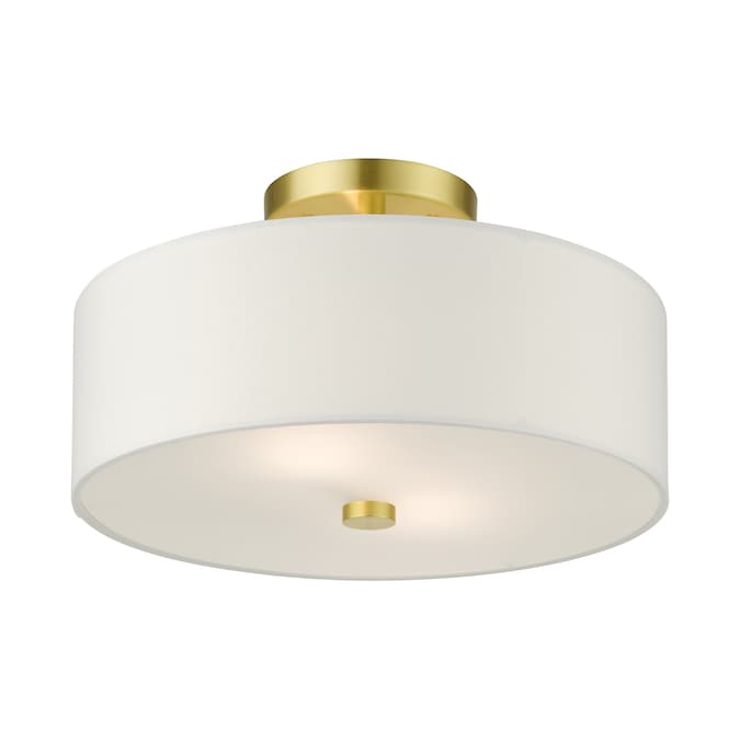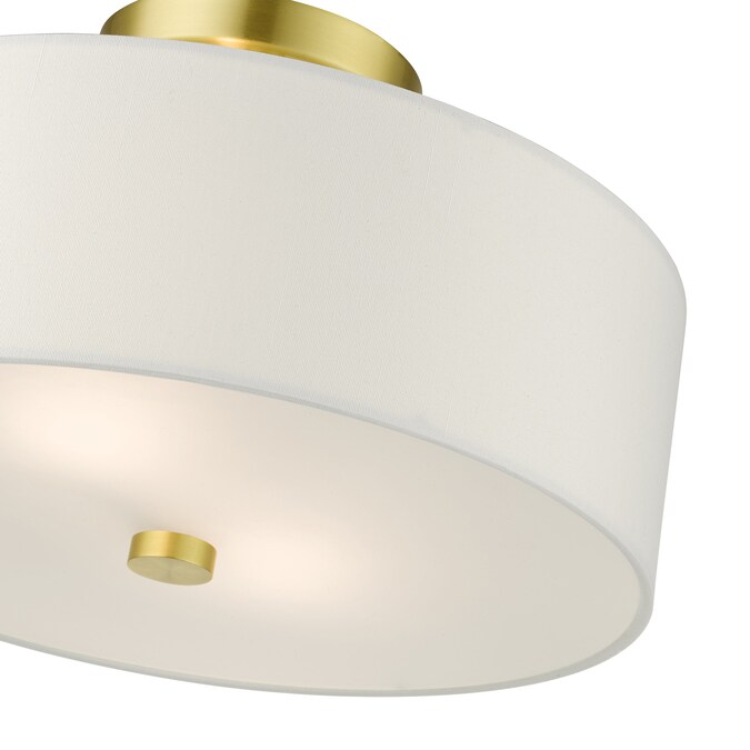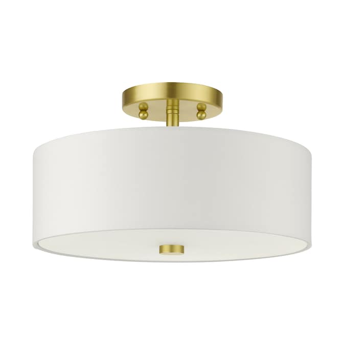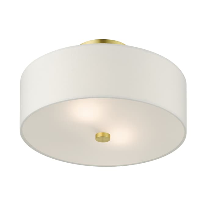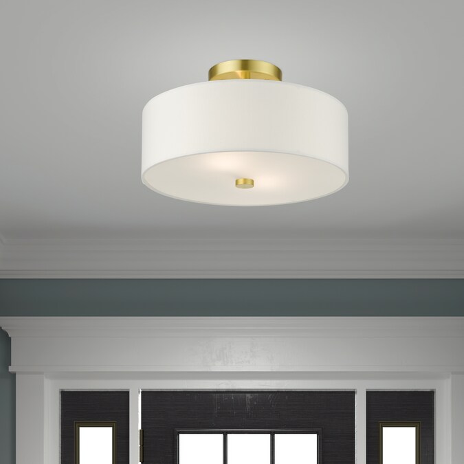 The meridian collection has a clean, crisp look and contemporary appeal. The hand-crafted off-white fabric hardback shades offer a diffused warm light. This medium two-light drum shade adds character to this handsomely styled semi flush mount. Will adapt well in the kitchen, hallway or bedroom tastefully elevating your style. This sleek design is shown in a satin brass finish.