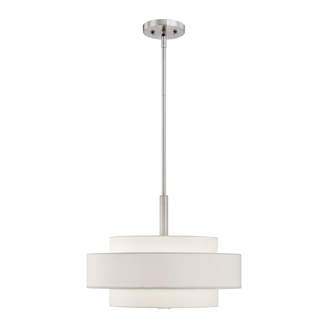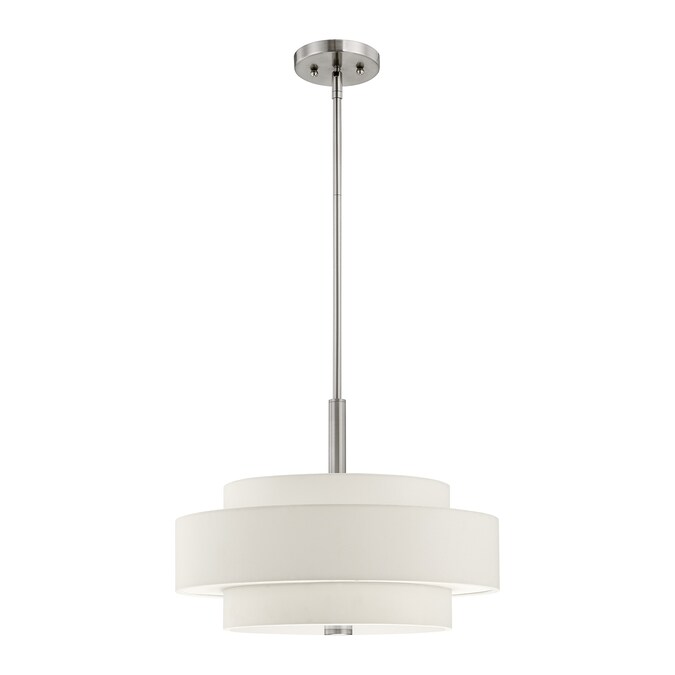 A triple drum shade adds character to this handsomely styled pendant light. Update your decor with the clean styling of this contemporary five light pendant from the meridian collection. Features a lovely hand crafted off white fabric hardback shade and frosted diffuser for subtle illumination.