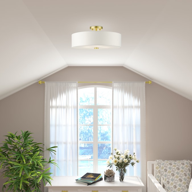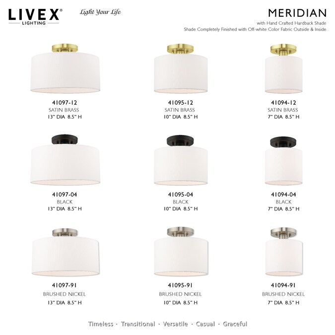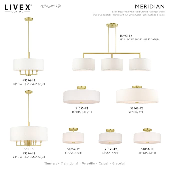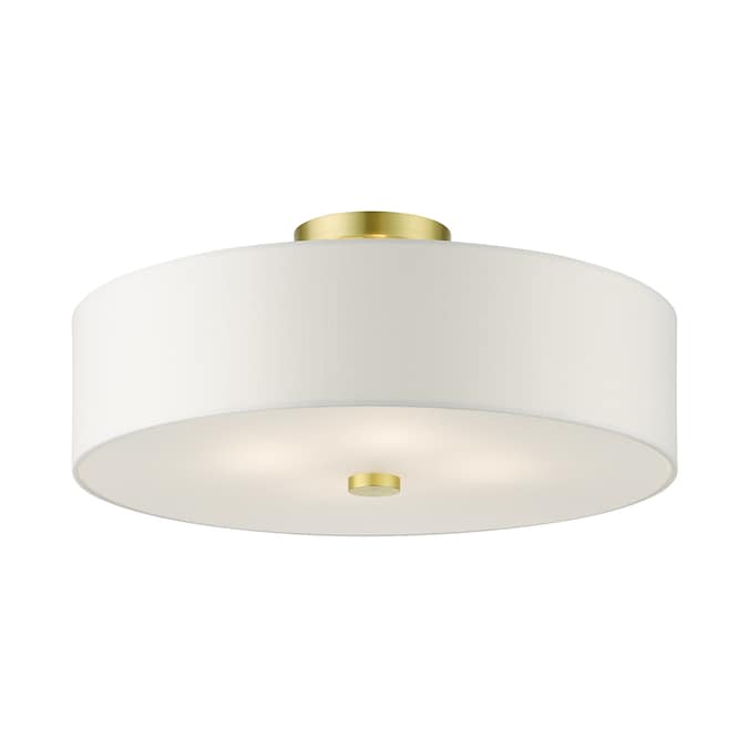 The meridian collection has a clean, crisp look and contemporary appeal. The hand-crafted off-white fabric hardback shade offers a diffused warm light. This large four-light drum shade adds character to this handsomely styled semi flush mount. Will adapt well in the living room, dining room and bedroom tastefully elevating your style. This sleek design is shown in a satin brass finish.
