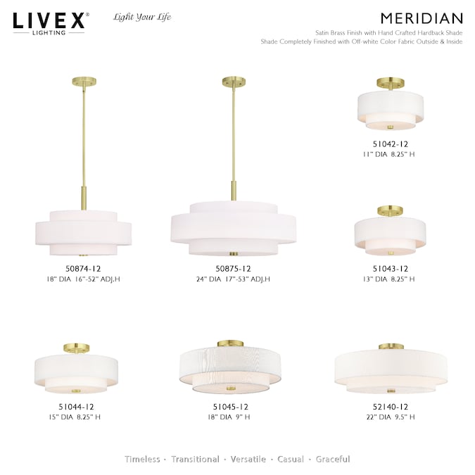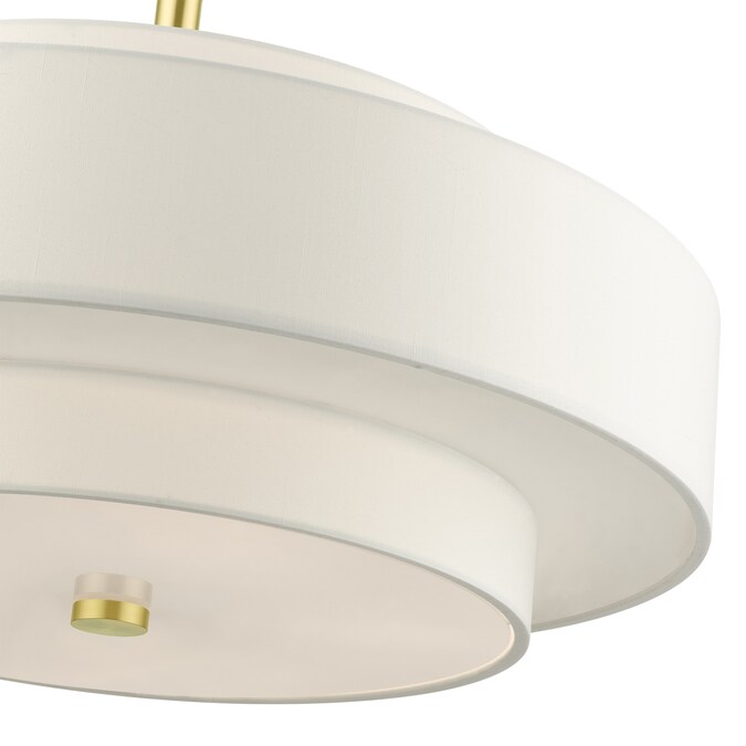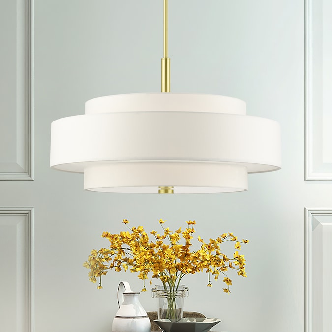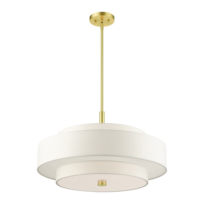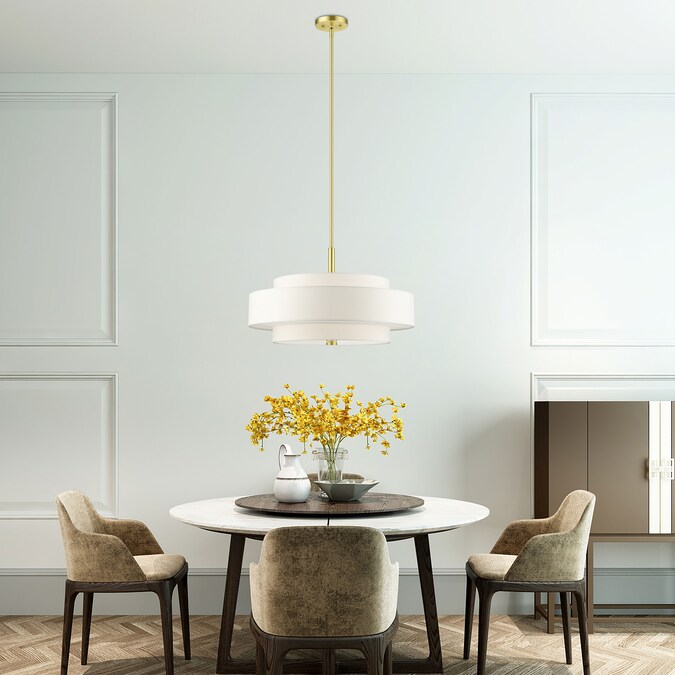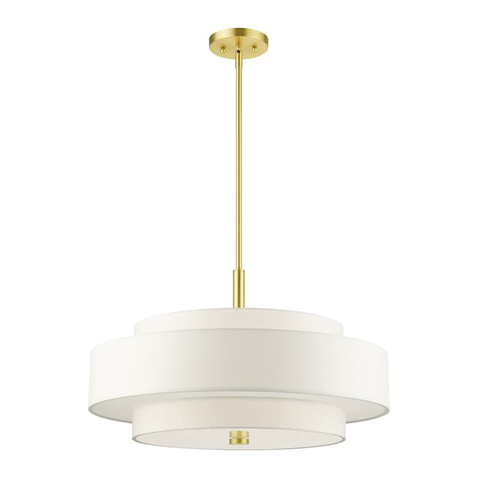 The meridian collection has a clean, crisp look and contemporary appeal. The hand-crafted off-white fabric hardback shades offer a diffused warm light. This five-light multi-tier drum shade adds character to this handsomely styled pendant chandelier. Will adapt well in the living room, dining room or in the bedroom tastefully elevating your style. This sleek design is shown in a satin brass finish.