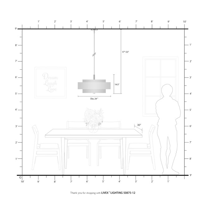 - Fixture dimension is 24-in DIA x 17-in to 53-in adj H
