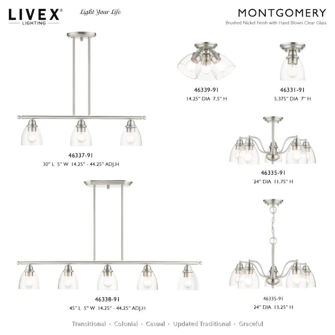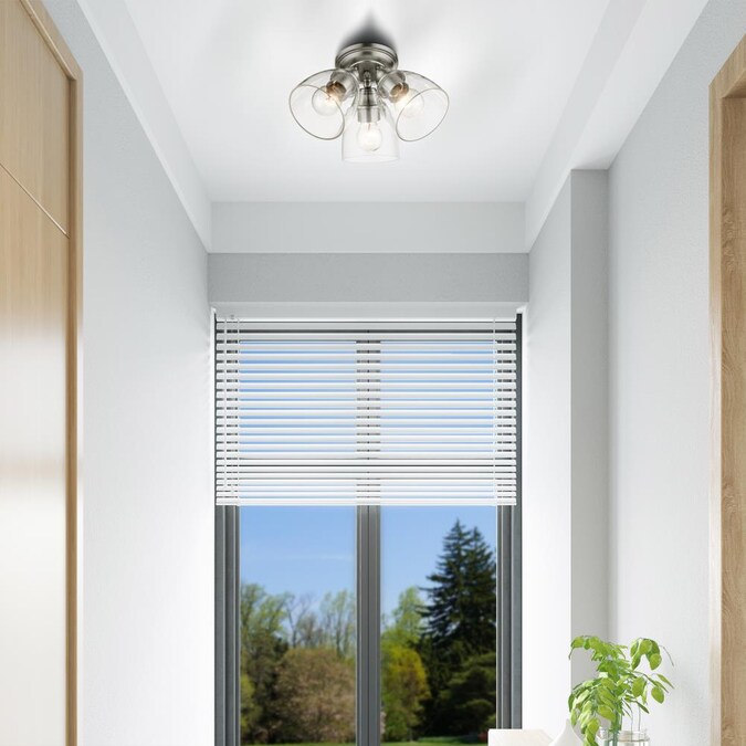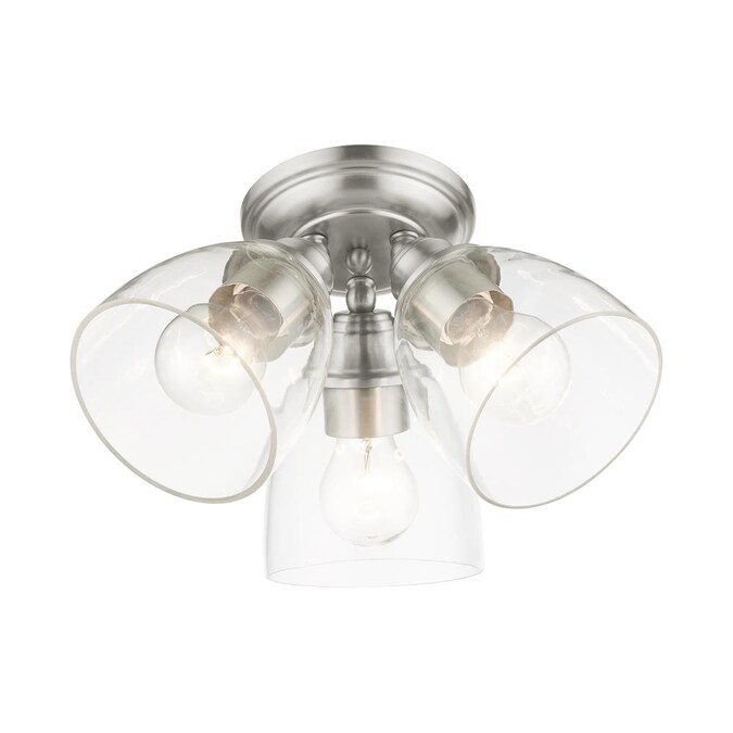 Whether it’s style or practical lighting, this flush mount is the perfect addition to your bathroom, kitchen, hallway or bedroom. This three-light fixture from the Montgomery collection features clear hand-blown glass shades and is shown in a brushed nickel finish. The clean graceful lines of the canopy complement the shades, creating an understated look that works well in most decors. Classic elegance combines with contemporary appeal to enhance any home in style.