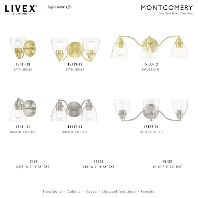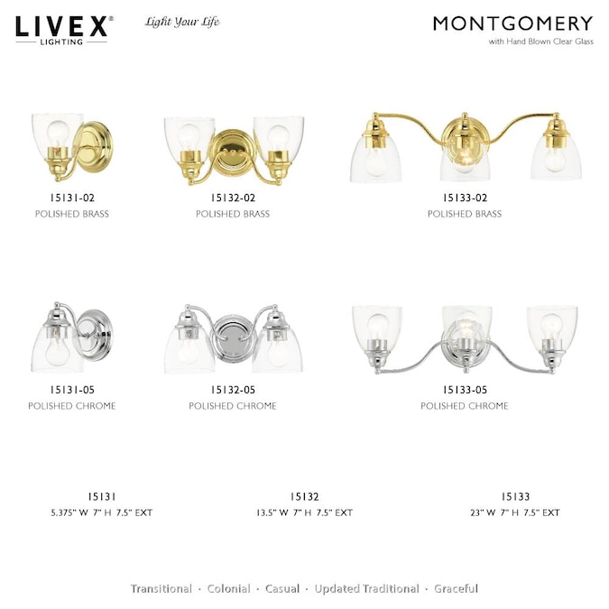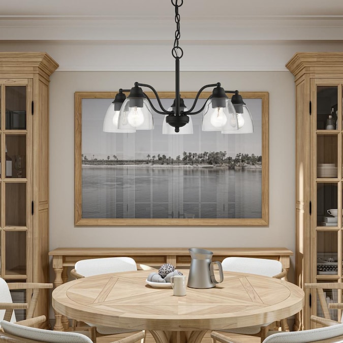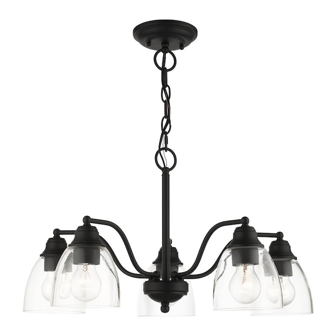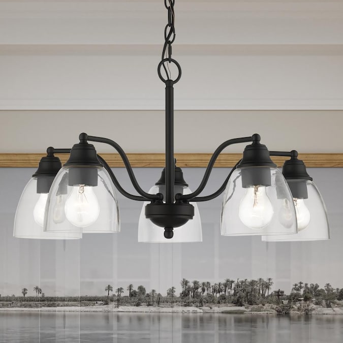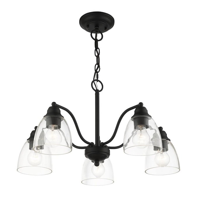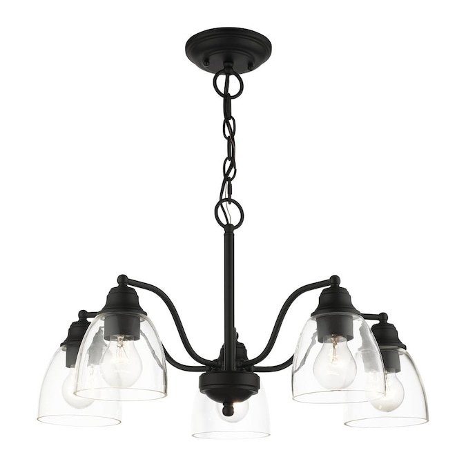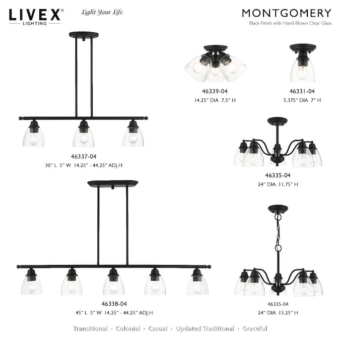Whether it’s style or practical lighting, this chandelier is the perfect addition to your kitchen, dining room or bedroom. This five-light fixture from the Montgomery collection can be converted to a semi flush mount to accommodate most ceiling heights. It features clear hand-blown glass shades and is shown in a black finish. The clean graceful curves of this piece complement the shade, creating a transitional look that works well in most decors. Classic elegance combines with contemporary appeal to enhance any home in style.