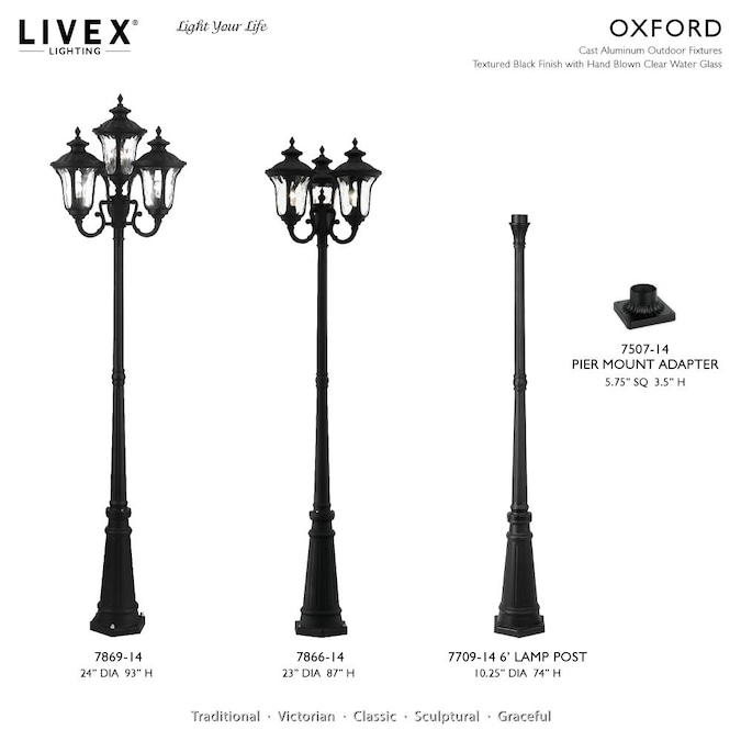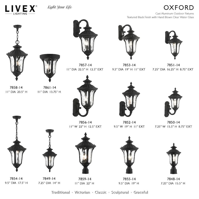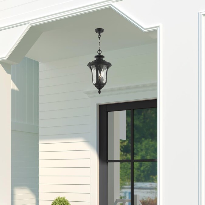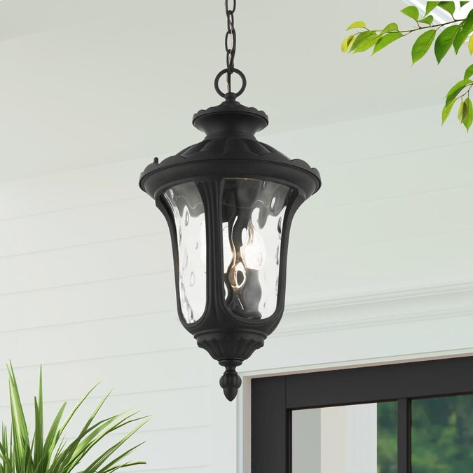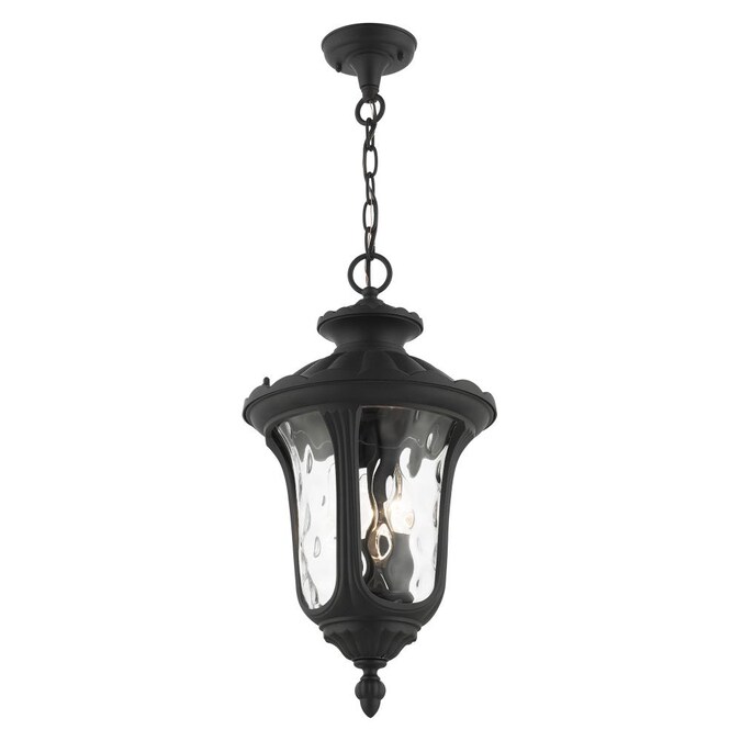 From the oxford outdoor lantern collection, this traditional cast aluminum three-light large pendant lantern design will add curb appeal to any home. It features handsome, antique styling and decorative elements. Clear water glass casts an appealing light and lends to its vintage charm. The canopy, chain and ornamental details are all in a textured black finish. With superb craftsmanship and affordable price, this fixture is sure to tastefully indulge your senses.