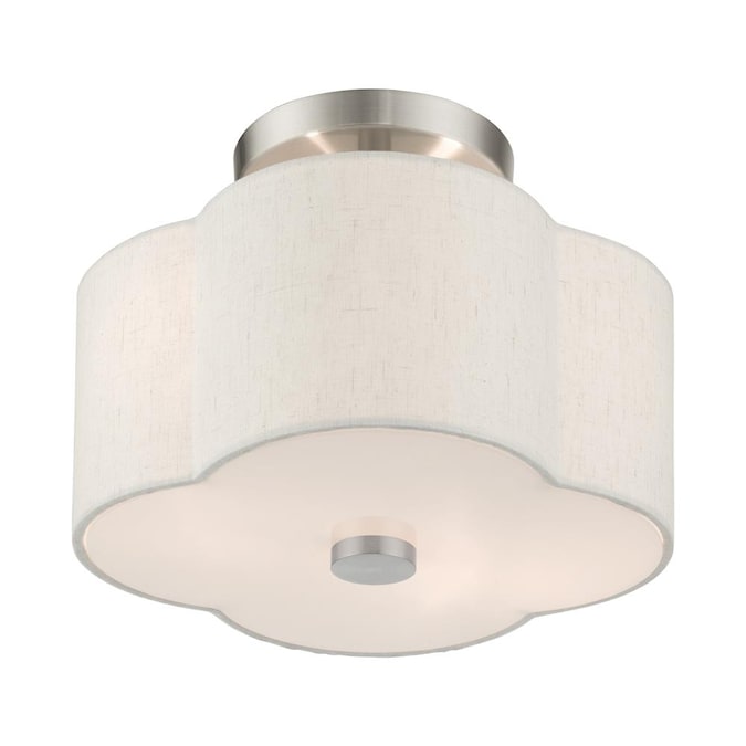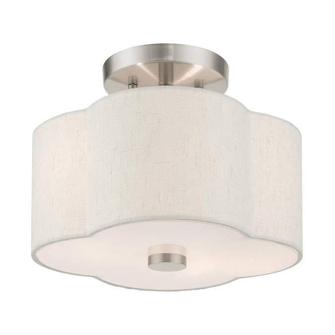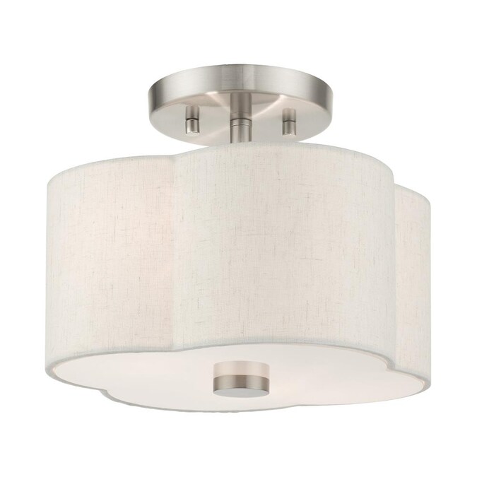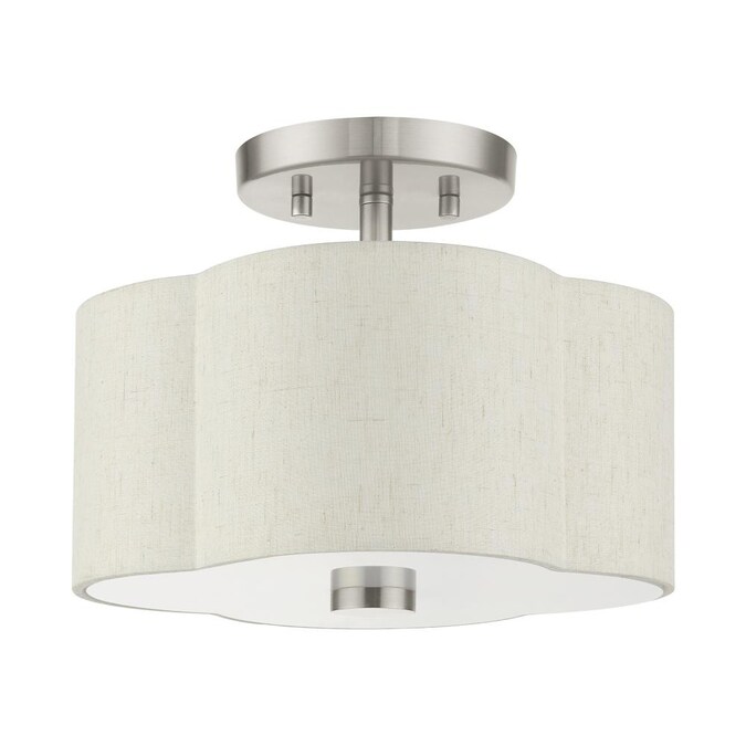 The solstice series evokes a French country chic vibe. This small two-light semi flush features a beautiful hand crafted scalloped shaped oatmeal colored hardback shade and is shown in a brushed nickel finish. Perfect finishing touch for a traditional, transitional or contemporary style interior. Enjoy this design in the bedroom, hallway, kitchen or bathroom.