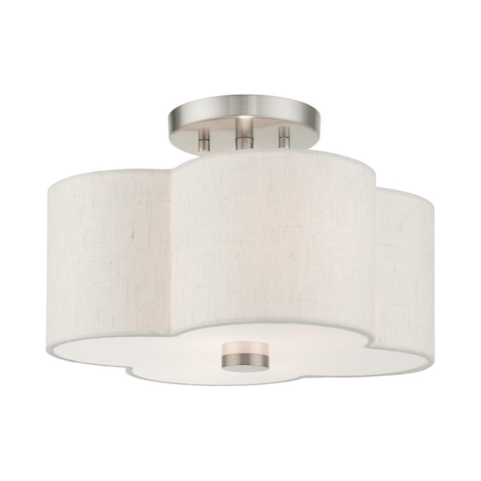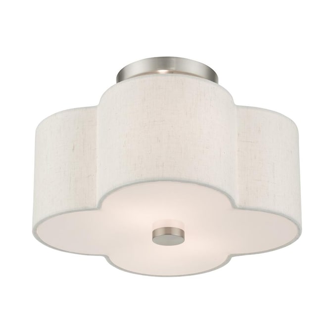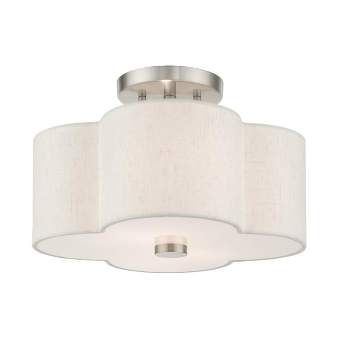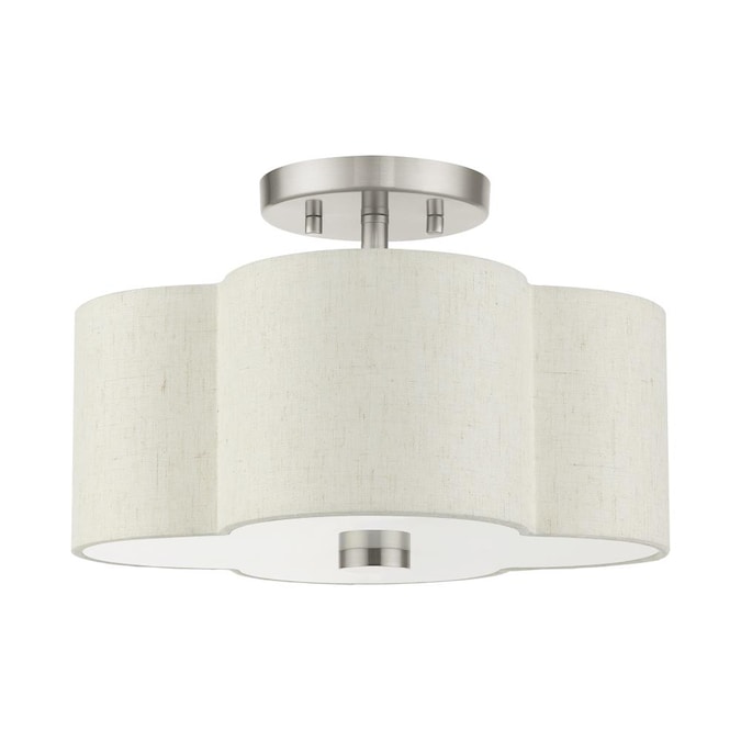 The solstice series evokes a French country chic vibe. This medium two-light semi flush features a beautiful hand crafted scalloped shaped oatmeal colored hardback shade and is shown in a brushed nickel finish. Perfect finishing touch for a traditional, transitional or contemporary style interior. Enjoy this design in the bedroom, hallway, kitchen or bathroom.