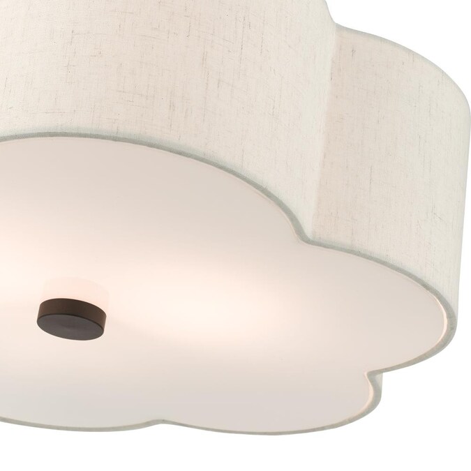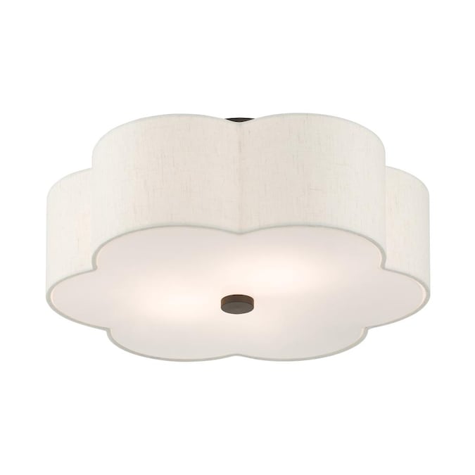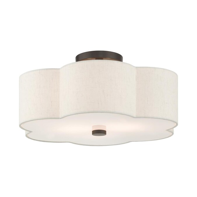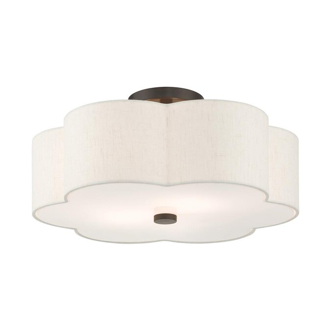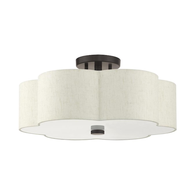 The solstice series evokes a French country chic vibe. This large three-light semi flush features a beautiful hand crafted scalloped shaped oatmeal colored hardback shade and is shown in an English bronze finish. Perfect finishing touch for a traditional, transitional or contemporary style interior. Enjoy this design in the living room, bedroom or dining room.