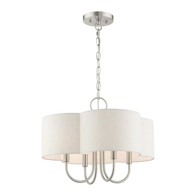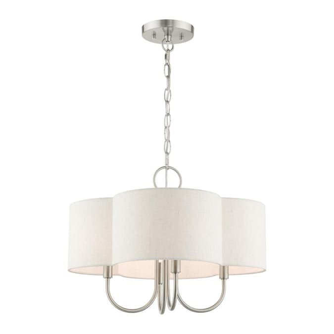 The solstice series evokes a French country chic vibe. This four-light pendant chandelier features a beautiful hand crafted scalloped shaped, oatmeal colored hardback shade situated on an elegantly curved frame. It is shown in a brushed nickel finish and is the perfect finishing touch for a traditional, transitional or contemporary style interior. Enjoy this design in the living room, bedroom, dining room or over your kitchen island.