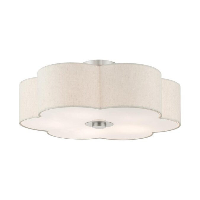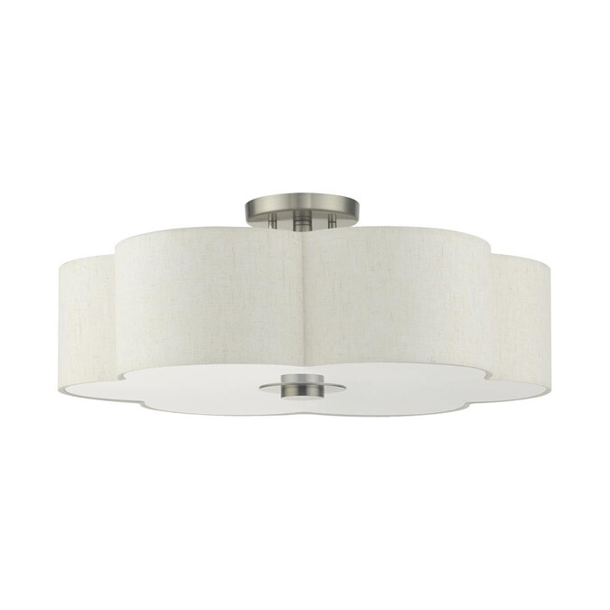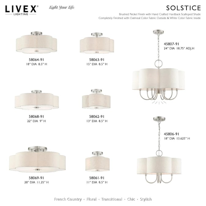 The solstice series evokes a French country chic vibe. This extra-large five-light semi flush features a beautiful hand crafted scalloped shaped oatmeal colored hardback shade and is shown in a brushed nickel finish. Perfect finishing touch for a traditional, transitional or contemporary style interior. Enjoy this design in the living room, bedroom or dining room.