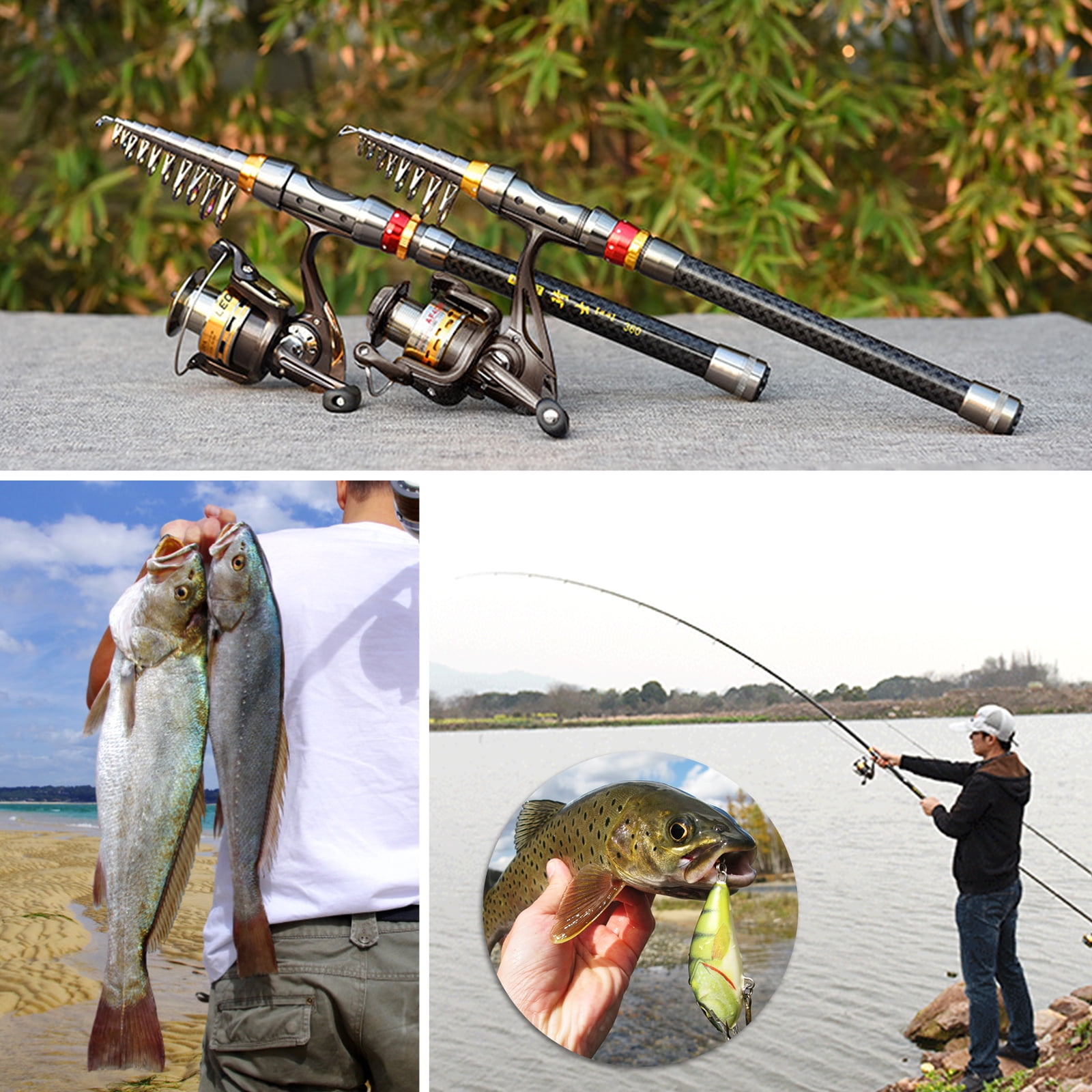 ?2PCS Fishing Pole Full Kit?included?2PCS Carbon Fiber Fishing Pole + 2PCS Spinning Fishing Reels + Carrier Bag + Various Fishing Lures Baits + Fishing Hooks + Fishing line. ?2PCS Carbon Fiber Fishing Rods? High density carbon fiber material makes the fishing rod hard and durable, telescopic design for conveniently carrying around. Rod case size High density carbon fiber material makes the fishing rod hard and durable, telescopic design for conveniently carrying around. ?2PCS Powerful Spinning Reels?The spinning fishing reels has a folding design, metal handles, and a more comfortable handshake. The reverse stop switch controls the forward and reverse rotation of the fishing wheel. The rocker arms can be exchanged left and right to meet different user habits. ?1PCS Lures set and Fishing line?We packed every tackle box for your fishing rod including hard and soft lures like minnows, crank bait, hooks, worms, and more.328ft Fishing line. ?Unbeatable quality?Our telescopic fishing rod and other fishing accessories were crafted with unbeatable quality that helps you tackle every lake, river, pond, and stream with confidence. ?Affordable Price?2PCS Fishing Rod and Reel Combo Kit can save more than 50% compared to buying 1PCS Fishing Rod and Reel Combo Kit.