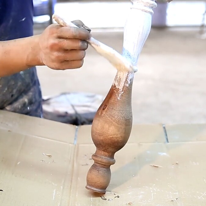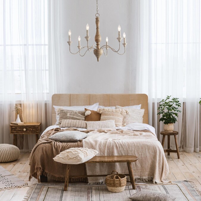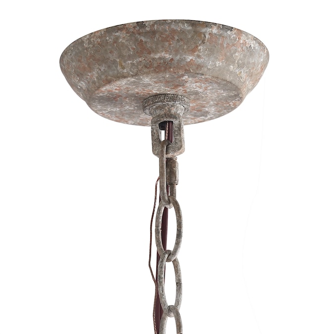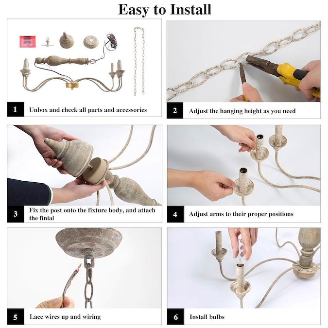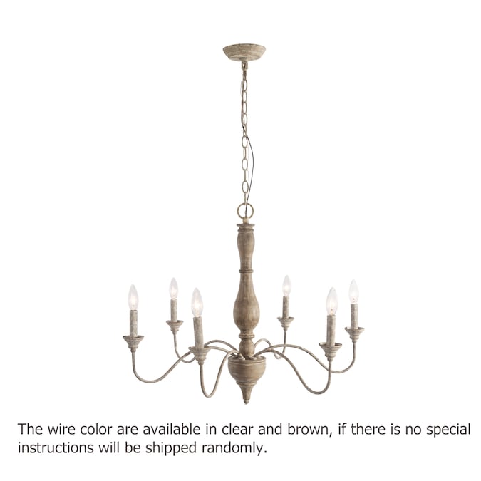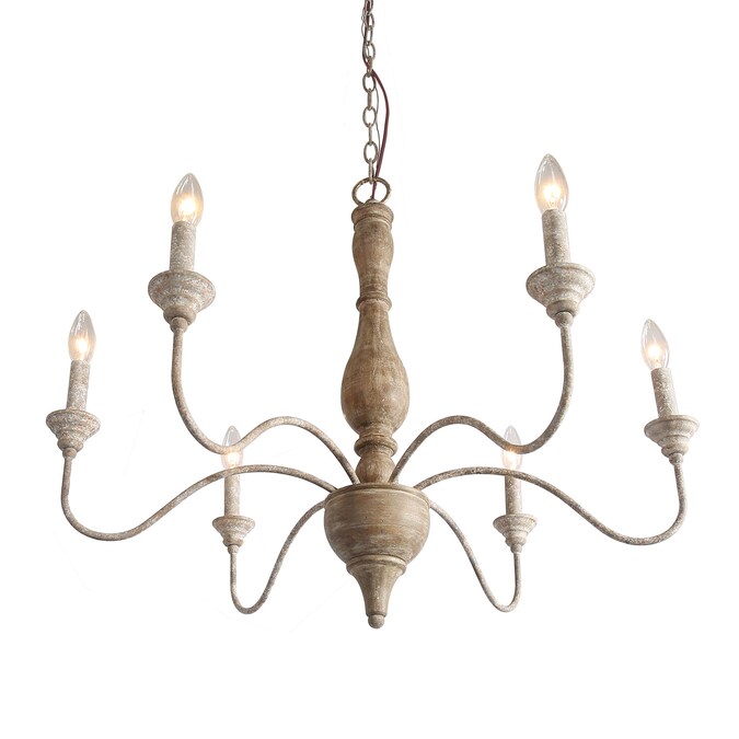 - This candle-style chandelier features a distressed white wood frame with six rust-colored curved arms, a canopy, and an adjustable chain in the same finish, and every part is completely handmade