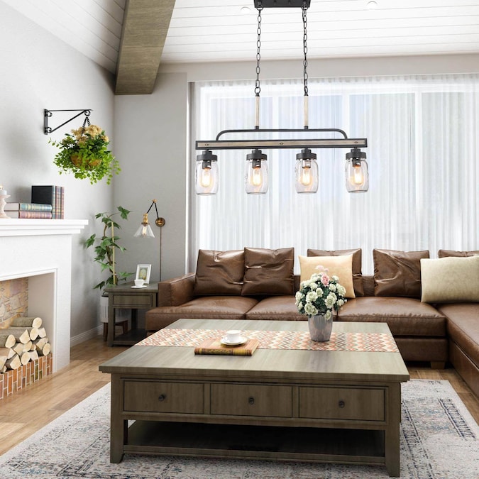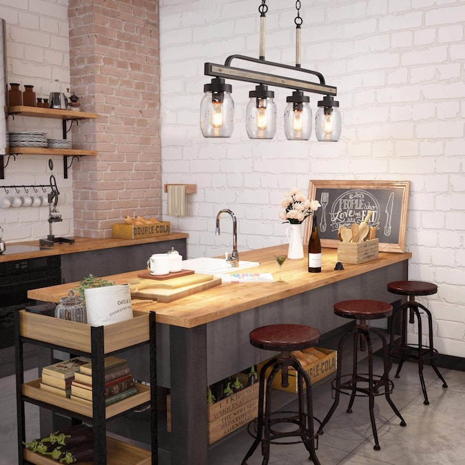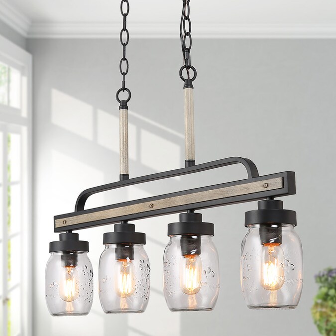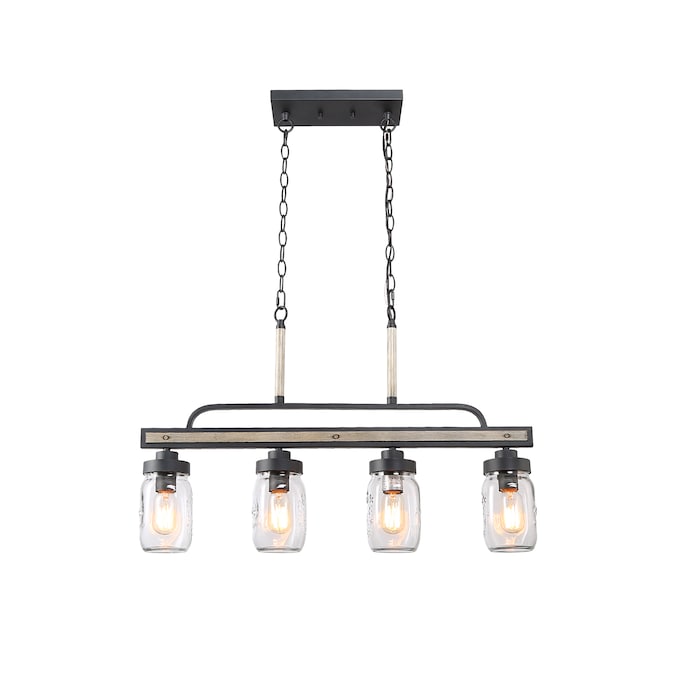 - This mason jar lighting features mason jar glass shade and linear hanging rods with wood tone finish, perfect kitchen pendant lighting for farmhouse style home decor