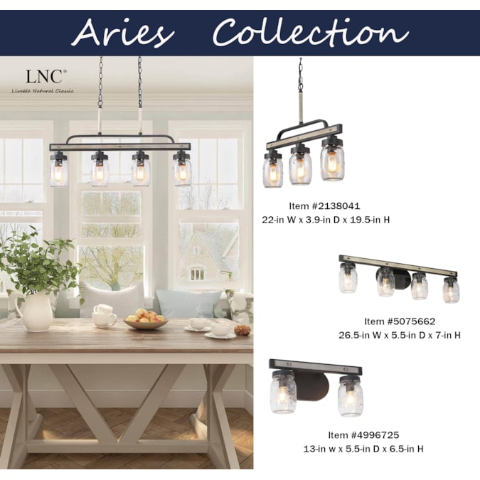 The classical Aries collection from LNC brings a warm vintage vibe to your home. It combines traditional popular mason jar lamp shade with minimalist black metal. This Aries collection is a design that retains the traditional flavor and meets the fashion trend. Including a wide variety of lighting fixtures such as chandeliers, kitchen islands, semi-flush mount lights, vanity lights, and wall sconces. It can satisfy your use of the kitchen, dining room, bedroom, living room, and entryways, adding a stylish, harmonious, and unified beauty and function to your home.